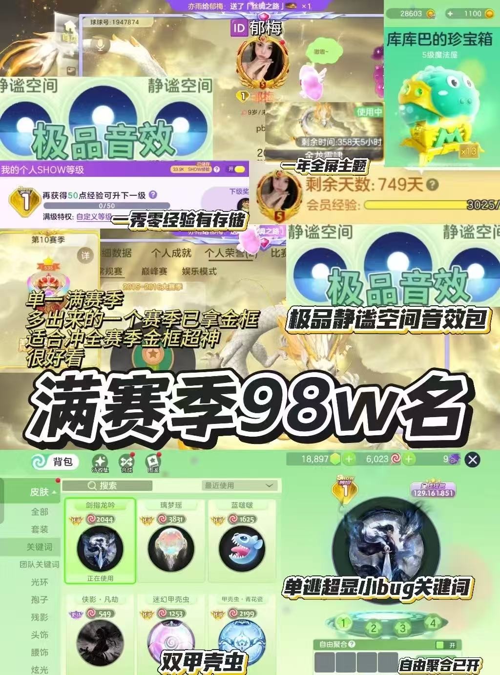 1秀满赛季排名号*静谧空间*2年卡会*璃梦瑶+粉芽芽+蓝啵啵+迷幻甲壳虫青花瓷+剑指龙吟+静谧空间1