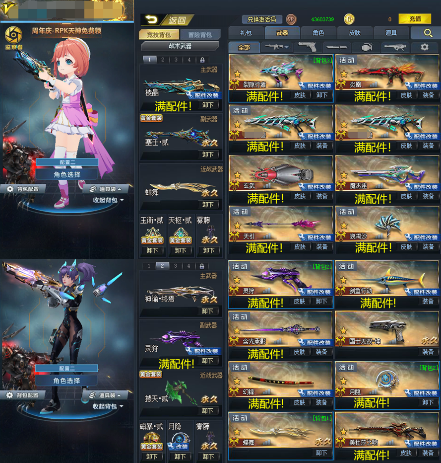 满配件英雄级武器:藤木蔓芯!核子裂变!裂隙行者!炎凰!赛傅野兽!玄武!摩羯座!天引!浪淘沙!灵狩!剑鱼行动!含光乘影!幻锋!月隐!美杜莎之吻!棱晶!玄天!凝视!猎犬!