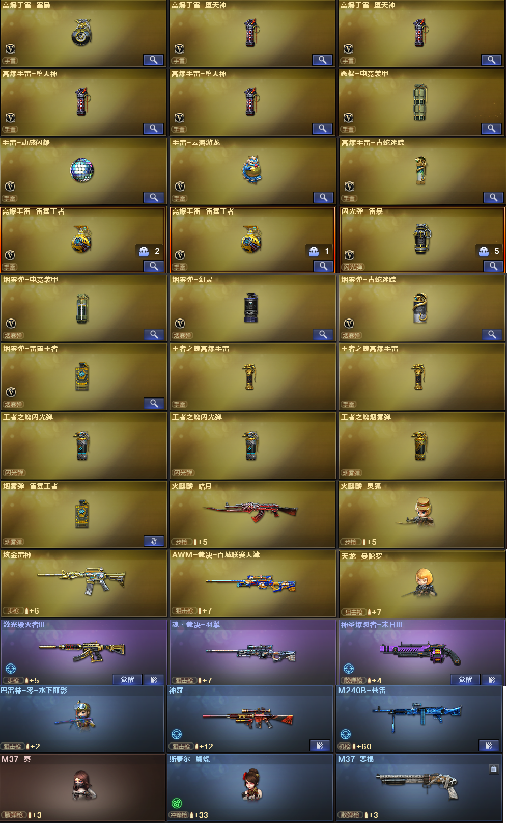 投掷套装:雷暴套X7、堕天神套X4、电竞装甲套、雷霆王者套、王者之魄套X2、手雷动感闪耀、手雷云海游龙、高爆手雷古蛇迷踪、烟雾弹幻灵、烟雾弹古蛇迷踪