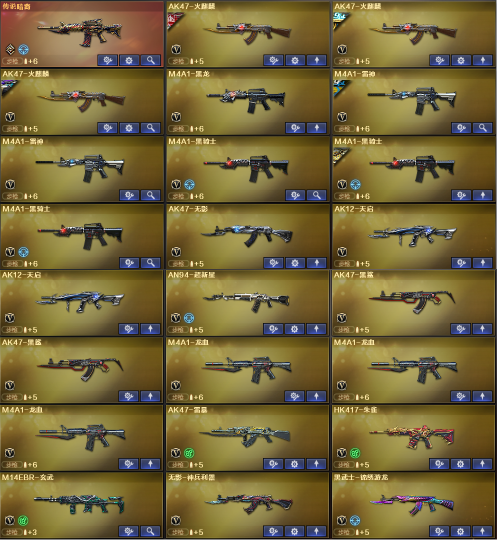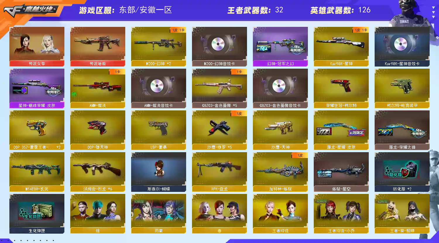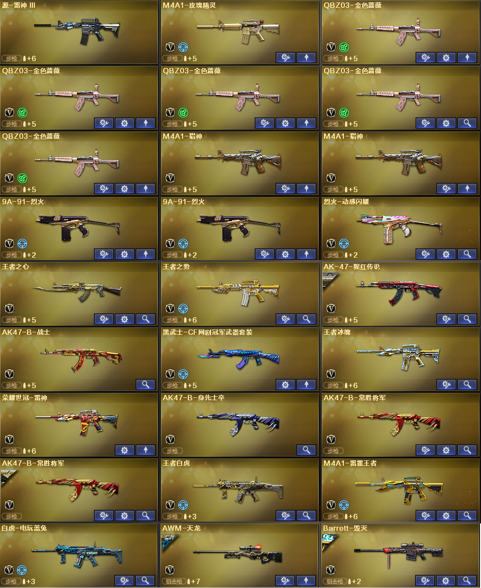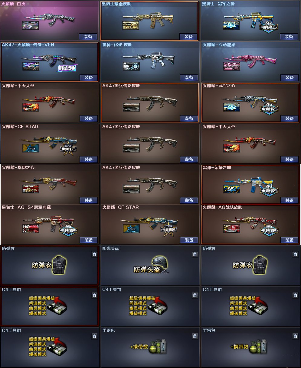 稀有武器:传说暗裔、M200幻神X2、98K星神、烈龙X6+斯泰尔蝴蝶、荣耀世冠柯尔特、USP雷暴、烈龙云海游龙、QBZ金色蔷薇X5、HK417朱雀、M14玄武、AK47雷暴、火麒麟X3、黑龙、雷神X2、黑骑士X3、无影、天启X2、超新星、黑鲨X2、龙血X3、无影神兵利器、黑武士锦绣游龙、玫瑰精灵、猎神X2烈火X2、烈火动感闪耀、黑武士-CF网剧冠军武器套装、白虎电玩蓝兔、天龙、毁灭X2、极光X2、裁决、暗月传说X2、盘龙、炼狱、修罗X5、天神、COP堕天神、柯尔特电竞装甲、天神动感闪耀、天神-CF网剧冠军武器套装、屠龙X2、龙啸、擎天、麒麟刺、斩神刀雷暴、麒麟刺堕天神、龙啸堕天神、屠龙动感闪耀、擎天云海游龙、擎天-CF网剧冠军武器套装、荣耀世冠雷神、荣耀世冠龙啸、雷霆王者之锋、激光毁灭者3、神圣爆裂者末日3