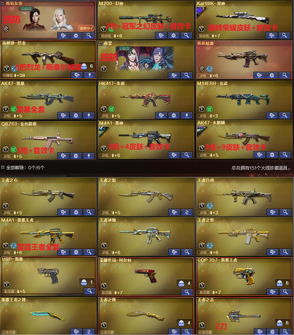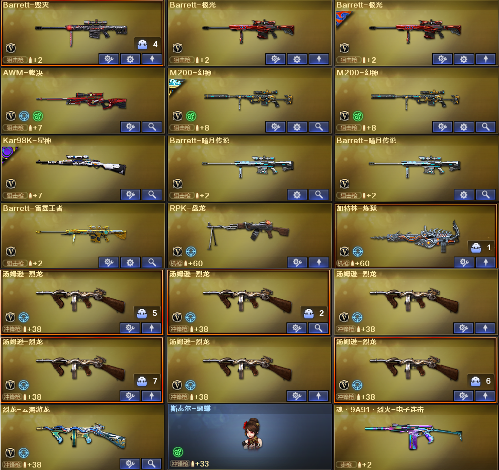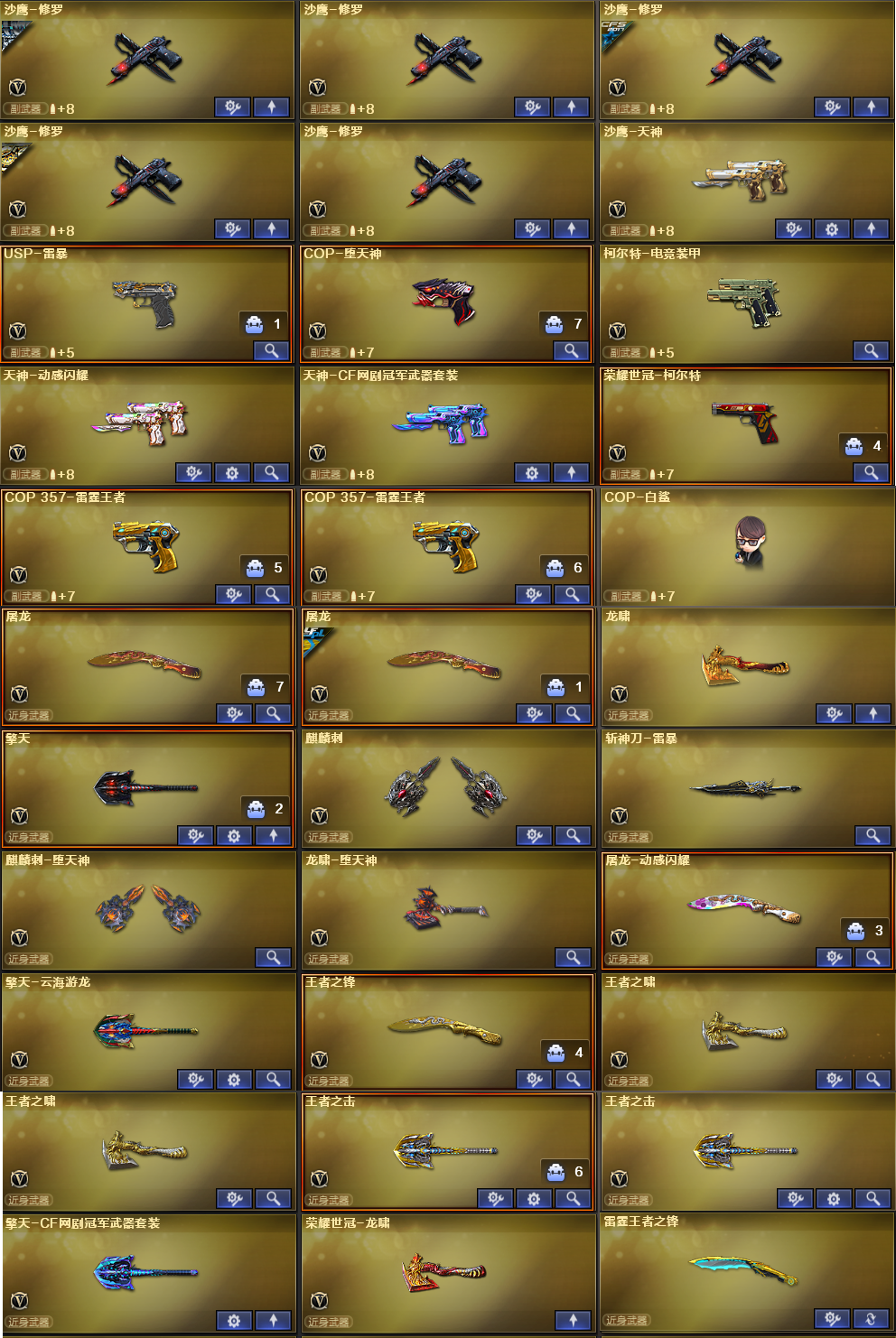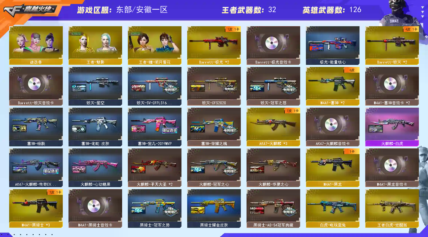 稀有武器:传说暗裔、M200幻神X2、98K星神、烈龙X6+斯泰尔蝴蝶、荣耀世冠柯尔特、USP雷暴、烈龙云海游龙、QBZ金色蔷薇X5、HK417朱雀、M14玄武、AK47雷暴、火麒麟X3、黑龙、雷神X2、黑骑士X3、无影、天启X2、超新星、黑鲨X2、龙血X3、无影神兵利器、黑武士锦绣游龙、玫瑰精灵、猎神X2烈火X2、烈火动感闪耀、黑武士-CF网剧冠军武器套装、白虎电玩蓝兔、天龙、毁灭X2、极光X2、裁决、暗月传说X2、盘龙、炼狱、修罗X5、天神、COP堕天神、柯尔特电竞装甲、天神动感闪耀、天神-CF网剧冠军武器套装、屠龙X2、龙啸、擎天、麒麟刺、斩神刀雷暴、麒麟刺堕天神、龙啸堕天神、屠龙动感闪耀、擎天云海游龙、擎天-CF网剧冠军武器套装、荣耀世冠雷神、荣耀世冠龙啸、雷霆王者之锋、激光毁灭者3、神圣爆裂者末日3
