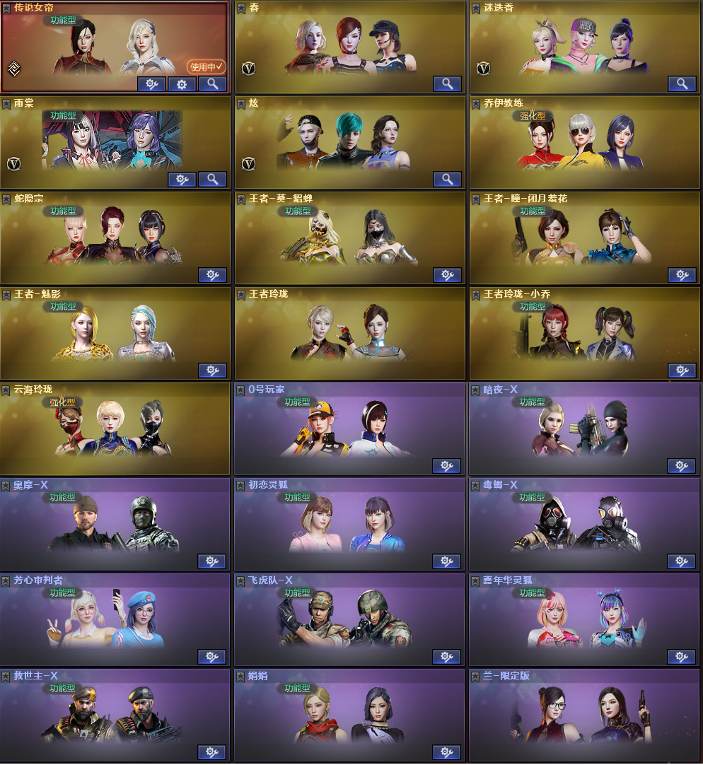 稀有角色:传说女帝、春。迷迭香、雨棠、炫、乔伊教练、蛇影宗、王者葵貂蝉(四防:减少闪光效果+免疫队友炸弹伤害+减少掉落伤害+副武器自动装弹)、王者瞳闭月羞花(四防)、王者魅影(四防)、王者玲珑、王者玲珑小乔(四防)、云海玲珑、0号玩家、芳心审判者、灵狐者职业经理、王者零传说之路、职业选手、幽