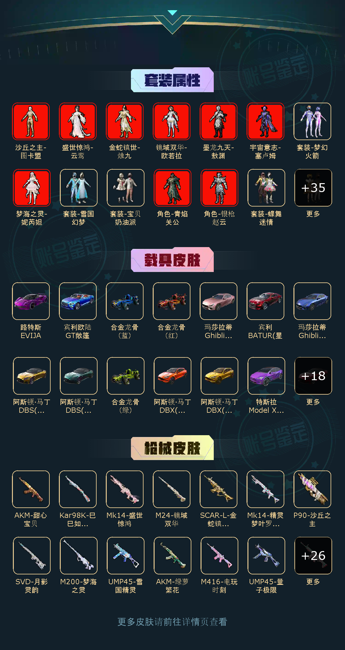 【套装数量】360【枪械数量】415 【粉枪械数量】45 【粉套装数量】45 【载具数量】31 【飞行器数量】18 【稀有资产】宾利欧陆GT敞篷(深空蓝)[1级]/宾利BATUR(星火红)[1级]/路特斯EVIJA(电光紫)[1级]/金蛇镇世-烛九[1级]/盛世惊鸿-云鸾[1级]/宇宙意志-塞卢姆[1级]/梦海之灵-妮芮妲[1级]/墨龙九天-敖渊[1级]/镜域双华-欧若拉[1级]/沙丘之主-图卡盟[5级]/角色-青焰关公[1级]/角色-银枪赵云[1级]/套装-雪国幻梦/套装-胖达圆圆/套装-粉红小猪/套装-萌熊伴侣/套装-浪漫天命/套装-潮萌小黄鸭/套装-雪山精英/套装-龟仙人/套装-胖达团团/套装-暗夜武装/套装-缤纷假日/套装-狂沙舞者/套装-狂战萌兔/套装-浪漫假日/套装-青涩年华/套装-奇迹天团/角色-乐音/角色-银尘/角色-冰公主/套装-冷酷挑战者/M416-仓鼠灰灰/大砍刀-青龙偃月刀/撬棍-龙胆亮银枪 【粉色套装】套装-甜心巧克力/套装-宝贝奶油派/套装-天使彩虹糖/套装-土曜战麒/套装-古堡领主/套装-守护骑士/套装-梦幻火箭/套装-精灵迷巫/套装-华贵君王/套装-星之信仰/套装-蝶舞迷情/套装-铁甲悍将/套装-黄蜂伯爵/套装-金属狂野/套装-静灵氛围/套装-智能音符/套装-缤纷油彩/套装-放客神游/套装-天禅智恒/套装-彗云及圣/套装-狩月元帅/套装-琉璃脉冲/套装-新星烈龙/套装-迷蝶贵族/套装-极致幻想/套装-星空之魅/套装-心之恋语/套装-炙焰红王/套装-暗翼战神/套装-苍蓝魅影/套装-翡翠骑士/套装-绚金战神/套装-香水柠檬/套装-星之彼岸/角色-复仇流浪者/套装-莲影清波/角色-圣堂之誓/角色-智耀战神 【粉色枪皮】M416-五爪金龙[5级]/M416-心之恋语[1级]/M762-甜蜜誓约[5级]/AKM-甜心宝贝[6级]/AKM-炫紫旋律[3级]/M762-激战未来[2级]/GROZA-香水柠檬[4级]/Kar98K-暗翼战神[2级]/SKS-诡面斩[4级]/Mini14-龙虾霸霸[4级]/M24-星之信仰[2级]/SCAR-L-童趣迷兔[4级]/SCAR-L-金蛇镇世[3级]/SCAR-L-梦幻火箭[1级]/SCAR-L-锦绣绵绵[4级]/GROZA-镜光银凌[4级]/AKM-绿萝繁花[5级]/M416-电玩时刻[5级]/M416-墨龙九天[3级]/M24-莲影清波[3级]/M24-镜域双华[3级]/Kar98K-伏魔团[4级]/Kar98K-巳巳如意[5级]/M200-梦海之灵[1级]/AWM-花间之火[4级]/SVD-月影灵韵[1级]/Mini14-荧光虫舞[5级]/SLR-暗夜玫瑰[2级]/Mk14-精灵梦叶罗丽[1级]/Mk14-盛世惊鸿[3级]/UMP45-雪国精灵[6级]/UMP45-量子极限[5级]/UMP45-宇宙意志[3级]/P90-沙丘之主[2级]/汤姆逊-怪笑疯兔[1级]/DP-28-扶摇飞仙[4级]/DP-28-豹影疾电[5级]/MG3-酷泡奶龙[3级] 【载具】鬼马风驰/玛莎拉蒂Ghibli(粉)/特斯拉Roadster(尊享铂)/特斯拉Model 3(奇幻紫)/特斯拉Roadster(沁心粉)/阿斯顿·马丁DBS(金)/阿斯顿·马丁DBS(红)/玛莎拉蒂Ghibli(蓝)/阿斯顿·马丁DBS(绿)/特斯拉Roadster(水滴蓝)/特斯拉Cybertruck(荒芜蓝)/特斯拉Cybertruck(镭光铂)/双人摩托-双刃魅影(红)/双人摩托-双刃魅影(绿)/双人摩托-梦幻火箭/疾风龙骑/双人摩托-双刃魅影(金)/阿斯顿·马丁DBX(橙)/阿斯顿·马丁DBX(金)/特斯拉Model X(奇幻紫)/阿斯顿·马丁DBX(蓝)/合金龙骨(蓝)/合金龙骨(红)/合金龙骨(绿)/布加迪威龙(海洋蓝)/照夜玉狮子/赤兔/快艇-塞莎KL27(霓虹粉)[1级] 【僚机】空客H135-恋语之翼 【飞行器】梦幻火箭飞行器/精灵迷巫飞行器/春暖花开飞行器/星之信仰飞行翼/古堡领主飞行器/繁花小夜曲飞行翼/心之恋语飞行翼/鸿潮鸣舰飞行器/幻海精灵飞行器[1级]/龙翔九天飞行器[1级]/沙丘之主天马[1级]/万象金身飞行器/镜域双华-灵镜之阶/凤舞九天飞行器/祥瑞起舞飞行器/深渊漩涡飞行器/酣梦熊熊飞行器/霓虹街区飞行器 【珍稀背包】萌熊伴侣背包(3级)/萌熊伴侣背包(2级)/萌熊伴侣背包(1级)/洛神天依背包(2级)