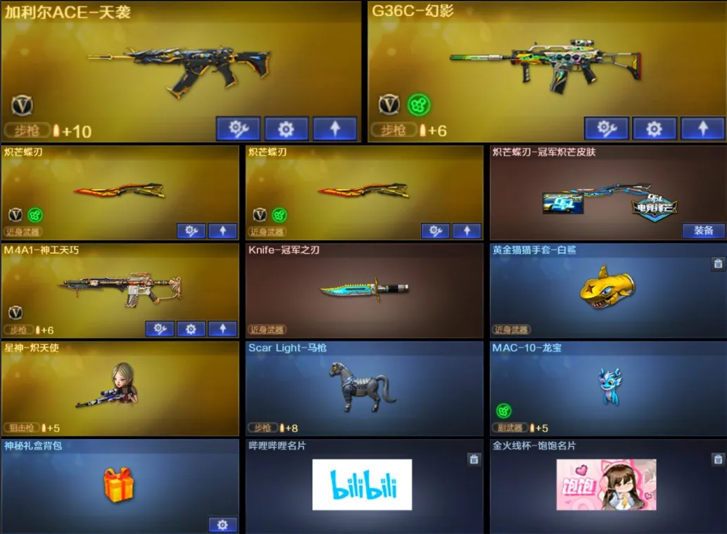 【其他亮点】:斯泰尔-蝴蝶/炼狱-泡泡象/Knife-冠军之刃/星神-炽天使/异变镇魔者/毒蜂/Scar Light-马枪/贝雷塔687-射手座/MAC-10-龙宝/黄金猫猫手套-白鲨/金刚伞-电玩红兔/茸茸小松狮/烟雾弹-荣耀世冠白鲨2023/哔哩哔哩名片/哔哩哔哩名片