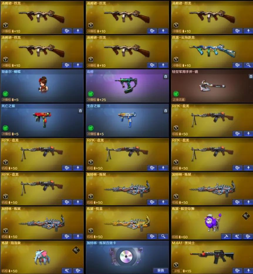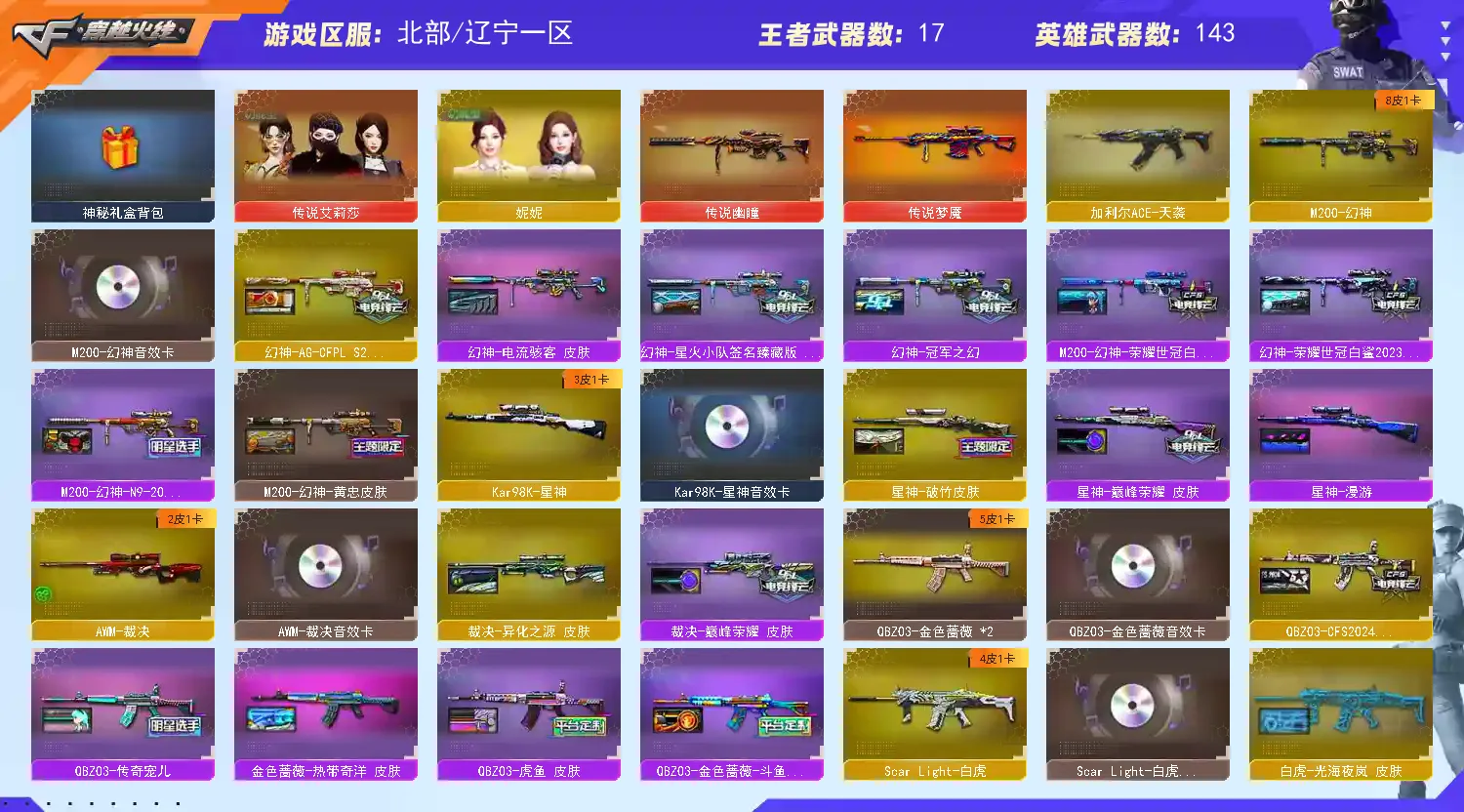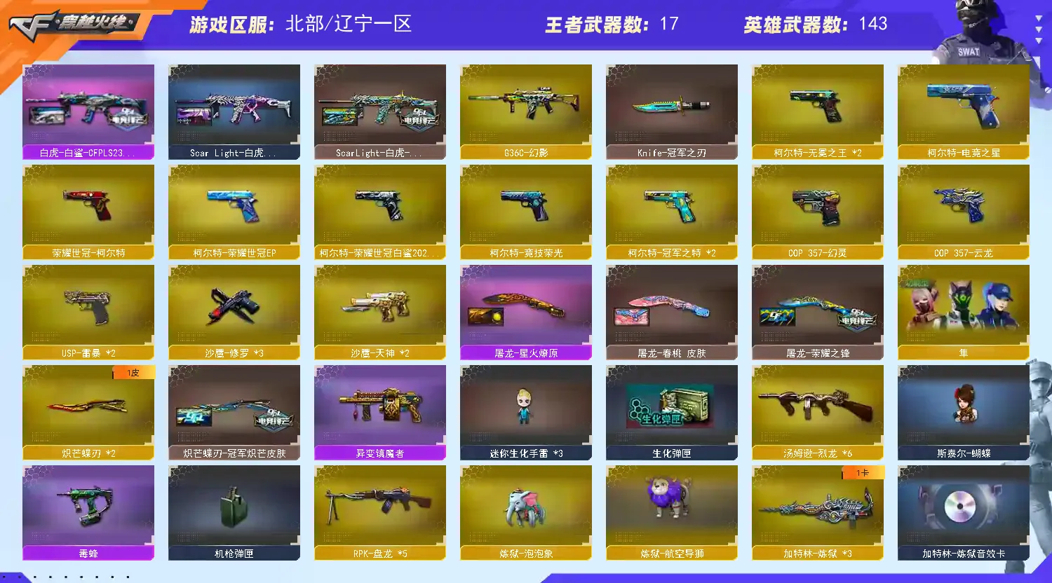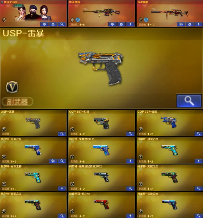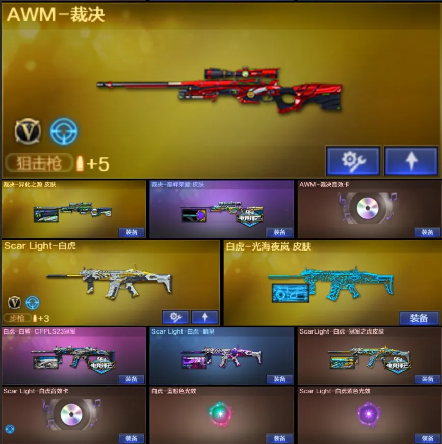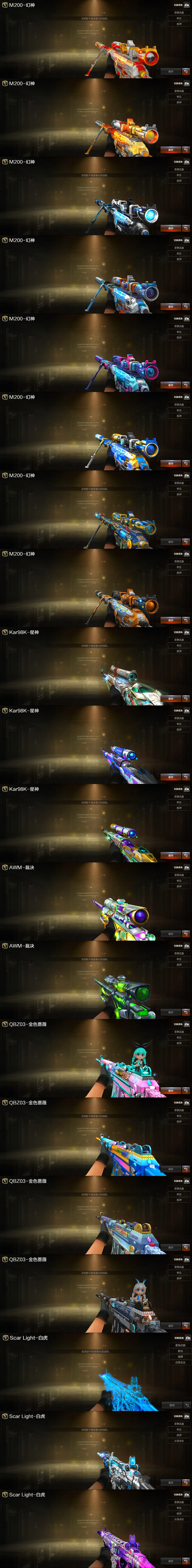 【稀有武器】:传说梦魇/传说幽瞳/M200-幻神/Kar98K-星神/G36C-幻影/ScarLight-白虎/M4A1-神工天巧/USP-雷暴(2)/COP357-幻灵/柯尔特-竞技荣光/天神-动感闪耀/COP357-云龙/柯尔特-荣耀世冠白鲨2023/柯尔特-无冕之王(2)/修罗-古蛇迷踪/荣耀世冠-柯尔特/柯尔特-冠军之特(2)/金色蔷薇-古蛇迷踪/QBZ03-金色蔷薇(2)/AK47-火麒麟/M4A1-黑龙/M4A1-雷神/M4A1-黑骑士/AK47-无影/Barrett-毁灭/Barrett-极光/AWM-裁决/RPK-盘龙(5)/加特林-炼狱(3)/汤姆逊-烈龙(6)/炽芒蝶刃(2)/麒麟刺-堕天神/马来剑-夜魔/唐刀-神工天巧/云龙扇