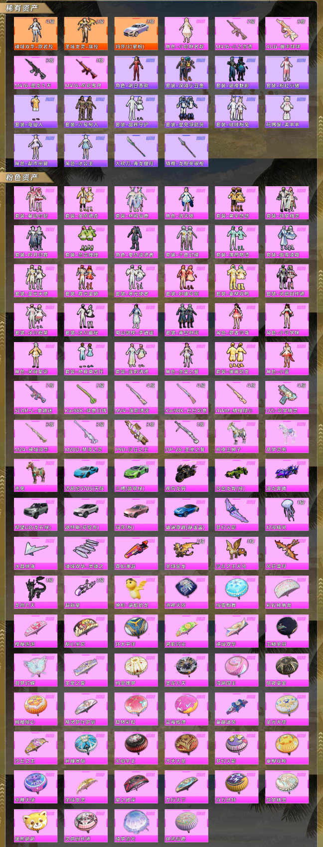 【稀有资产】镜域双华-欧若拉[4级]/圣域龙灵-瑞拉[2级]/玛莎拉蒂Quattroporte(幻星粉)[2级]/角色-小叽联名款/M416-心之恋语/AUG-暖羊咩咩/M416-墨龙九天/M416-风花雪月/角色-明日香款战斗服/套装-深海小丑鱼/套装-暗夜魅影/套装-粉红小猪/套装-龟仙人/套装-六号树人/套装-晶辉守护/套装-星兔领航员/套装-绒绒粉兔/玩偶服-美羊羊/角色-都市丽猫/角色-冰公主/大砍刀-青龙偃月刀/撬棍-龙胆亮银枪