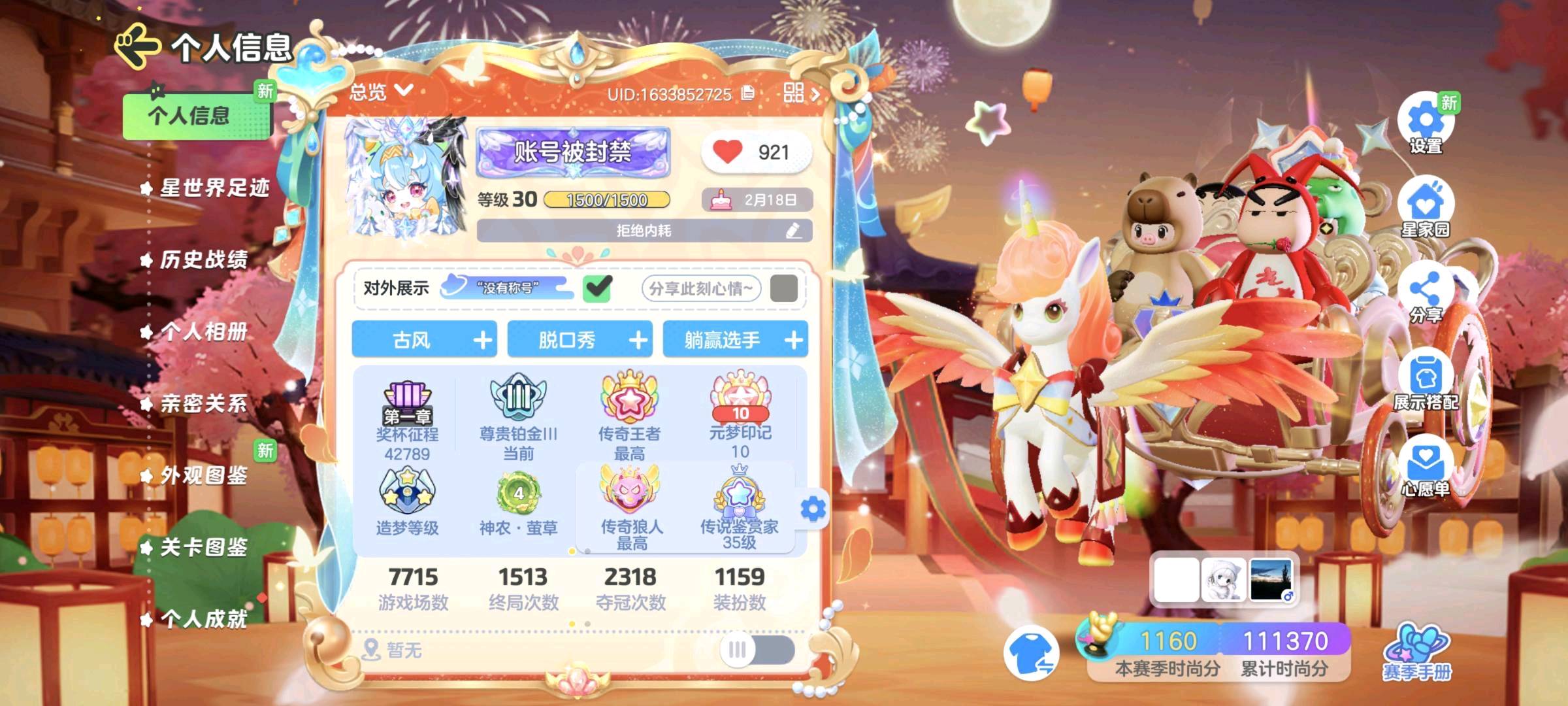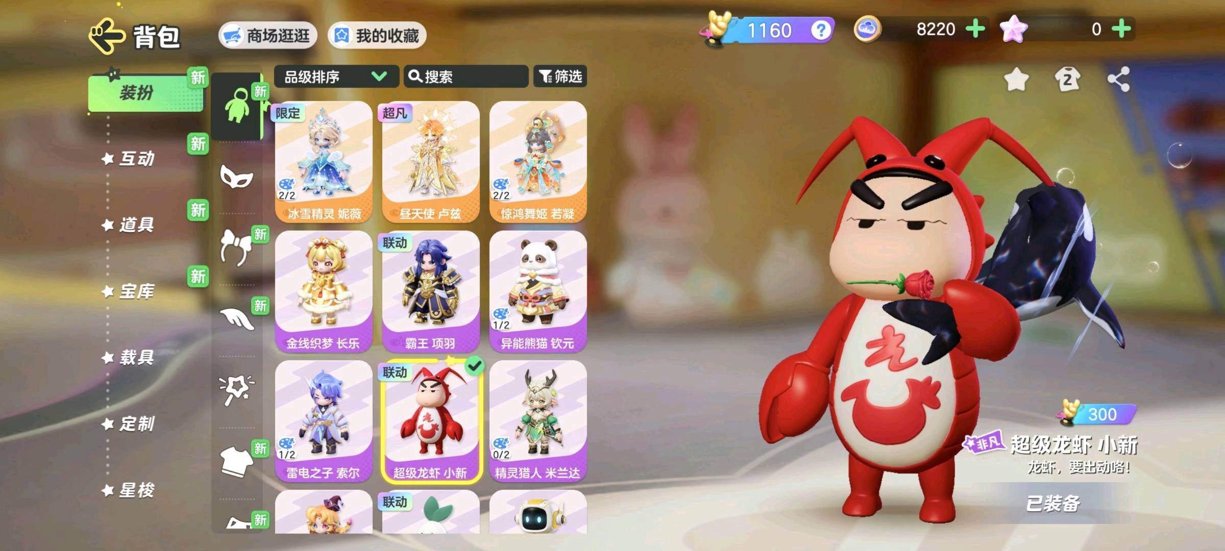 四座璀璨星翼载具,龙虾小新、奶龙、大耳狗等热门皮肤,狼人杀装扮多套,农场可用于偷菜 请勿浪费游戏资源谢谢配合 开挂必追究责任 请勿浪费游戏资源以及辱骂等行为