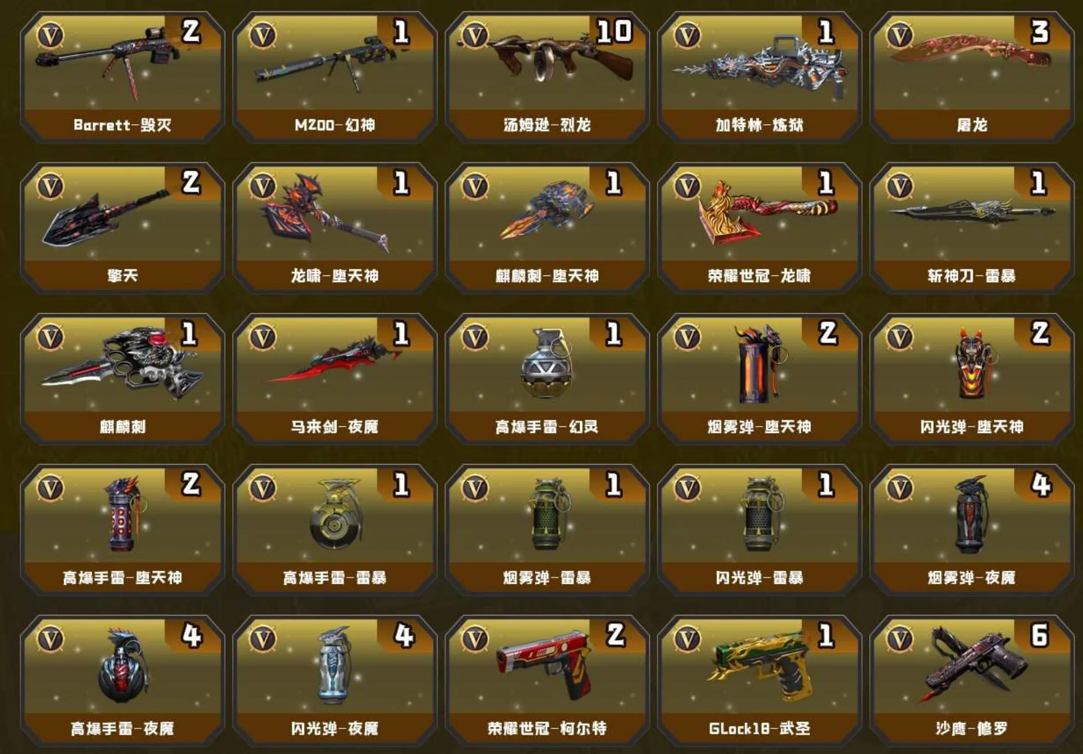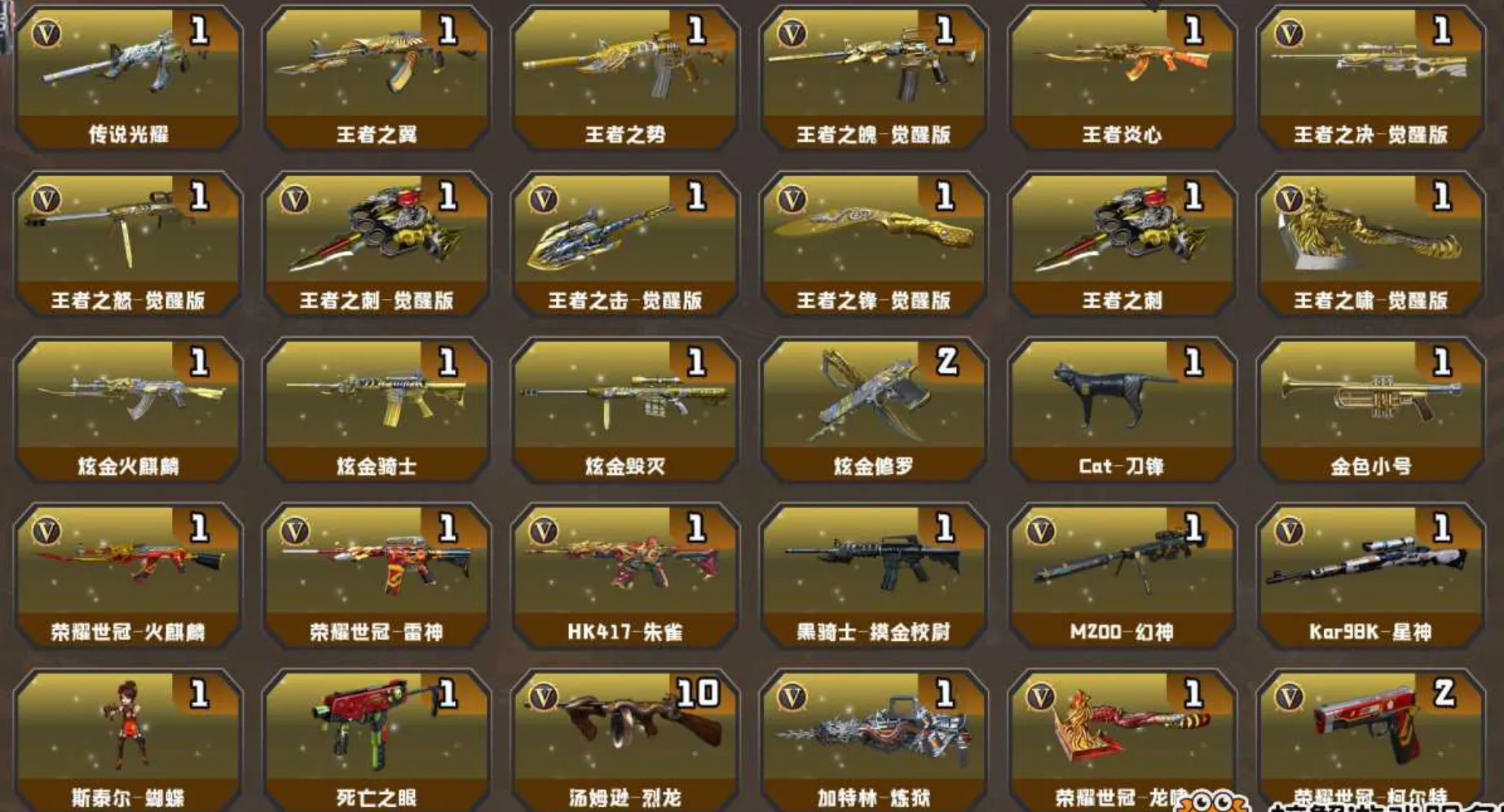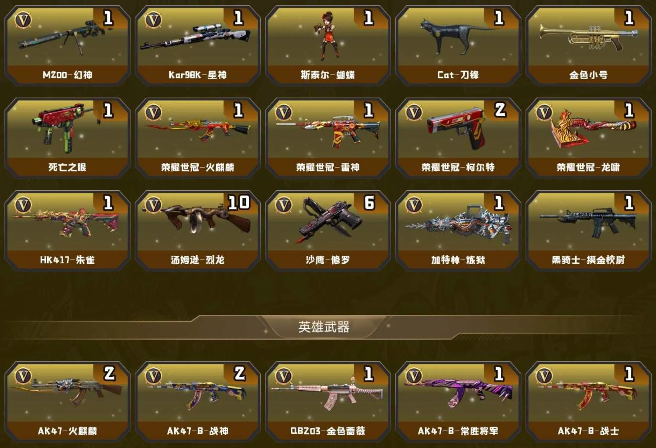 本游戏账号:英雄武器89个; 王者武器18个。 装备不多,但是主武器、副武器、近身武器够用 拥有完美游戏体验。重要的是,特殊装备有:AK47-火麒麟、QBZ03-金色蔷薇、龙啸-堕天神、烟雾弹-堕天神、闪光弹-堕天神、麒麟刺-堕天神、荣耀世冠-柯尔特、荣耀世冠-龙啸、荣耀世冠-雷神、荣耀世冠-火麒麟、M4A1-黑龙、Kar98K-星神、AN94-超新星、AK47-黑武士、AWM-天龙、麒麟刺、Barrett-毁灭、M4A1-雷神、破空枪刃-夜魔、传说光耀、M4A1-青龙、HK417-朱雀、M200-幻神、加特林-炼狱、M4A1-黑骑士、王者之锋-觉醒版、王者之魄闪光弹、王者之魄高爆手雷、王者之刺、王者之怒-觉醒版、王者之翼、炫金火麒麟、王者之势、炫金毁灭、王者之魄-觉醒版、王者炎心、炫金骑士、雷霆-β、堕天使、王者-葵-貂蝉、王者-春、M4A1-黑龙音效卡、M200-幻神音效卡、AK47-火麒麟音效卡、M4A1-雷神音效卡、王者之啸金色光效、M4A1-黑骑士音效卡、Barrett