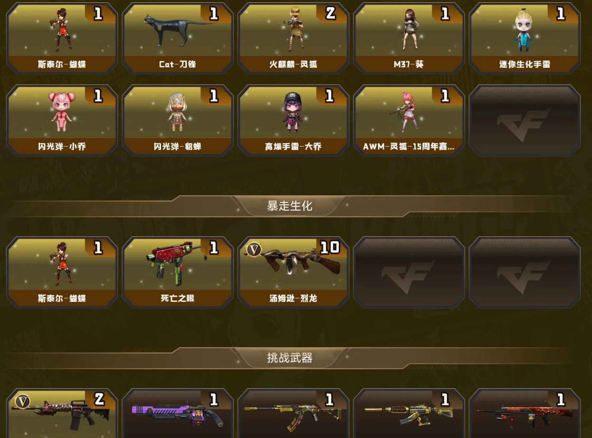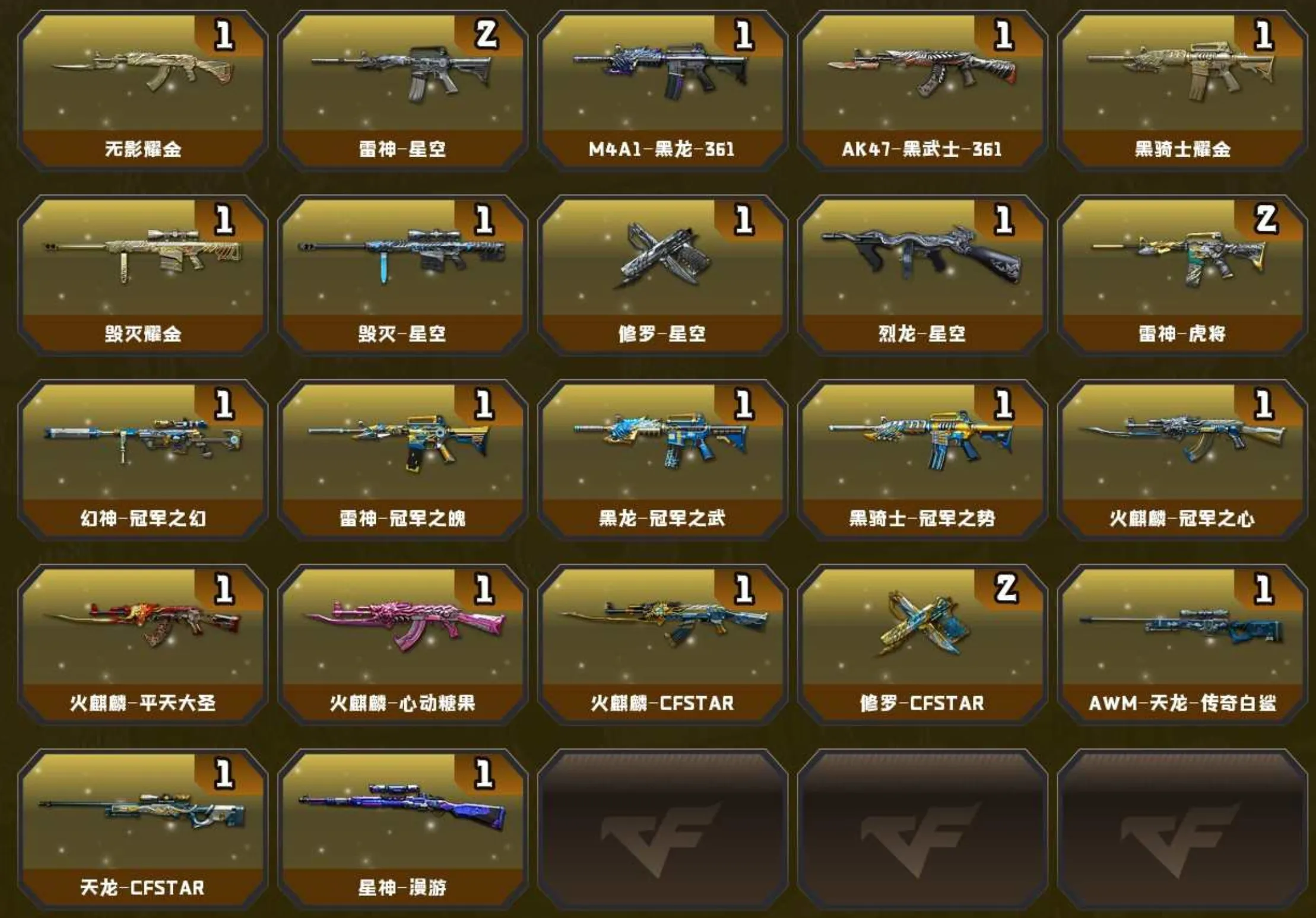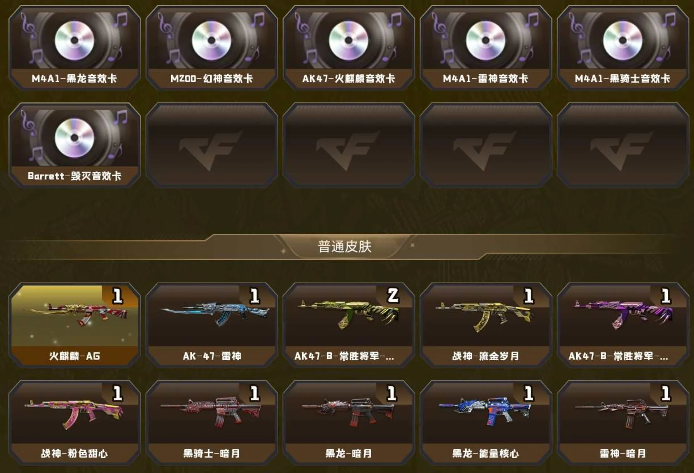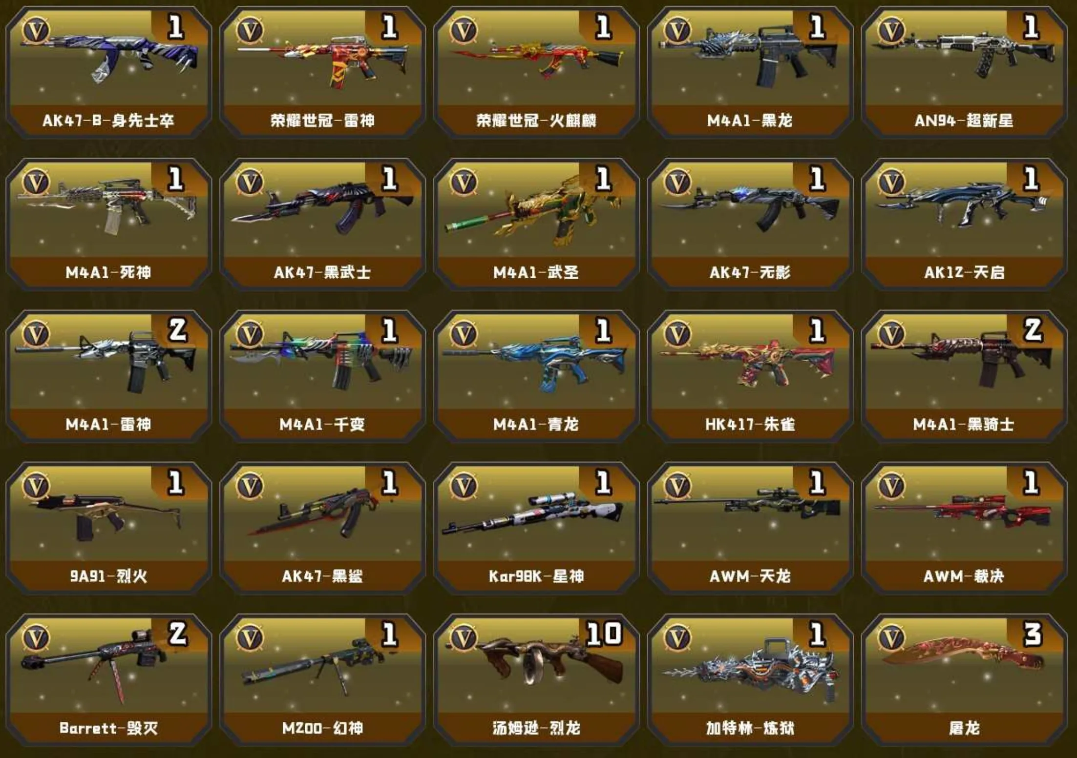 本游戏账号:英雄武器89个; 王者武器18个。 装备不多,但是主武器、副武器、近身武器够用 拥有完美游戏体验。重要的是,特殊装备有:AK47-火麒麟、QBZ03-金色蔷薇、龙啸-堕天神、烟雾弹-堕天神、闪光弹-堕天神、麒麟刺-堕天神、荣耀世冠-柯尔特、荣耀世冠-龙啸、荣耀世冠-雷神、荣耀世冠-火麒麟、M4A1-黑龙、Kar98K-星神、AN94-超新星、AK47-黑武士、AWM-天龙、麒麟刺、Barrett-毁灭、M4A1-雷神、破空枪刃-夜魔、传说光耀、M4A1-青龙、HK417-朱雀、M200-幻神、加特林-炼狱、M4A1-黑骑士、王者之锋-觉醒版、王者之魄闪光弹、王者之魄高爆手雷、王者之刺、王者之怒-觉醒版、王者之翼、炫金火麒麟、王者之势、炫金毁灭、王者之魄-觉醒版、王者炎心、炫金骑士、雷霆-β、堕天使、王者-葵-貂蝉、王者-春、M4A1-黑龙音效卡、M200-幻神音效卡、AK47-火麒麟音效卡、M4A1-雷神音效卡、王者之啸金色光效、M4A1-黑骑士音效卡、Barrett
