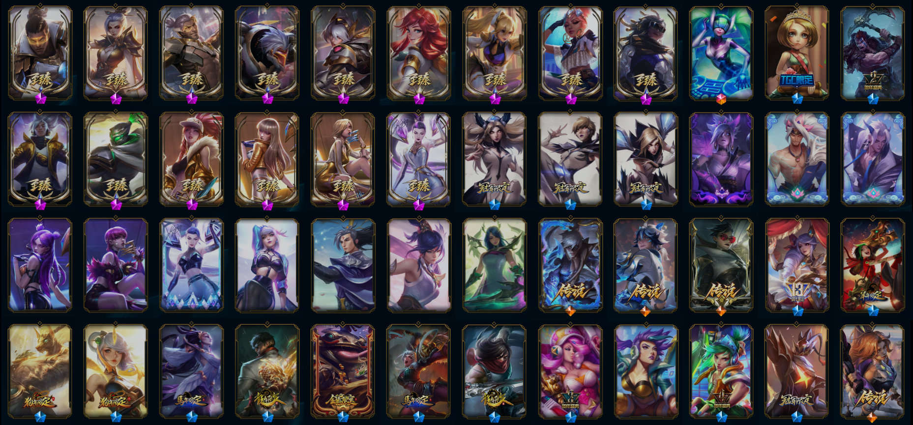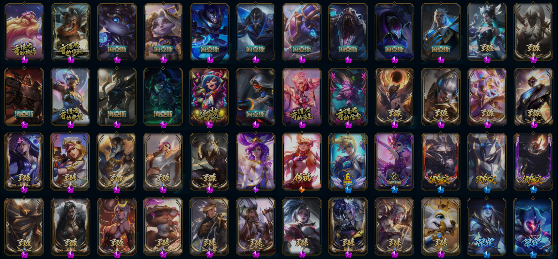 【传说皮肤】青花瓷伊泽瑞尔 星之守护者阿卡丽 幻灵战斗队长厄运小姐 耀星女神拉克丝 魔女伊芙琳 钢铁军团盖伦 屠龙勇士潘森 神龙尊者夜月幻龙亚索 太空律动猫猫布里和里茨 光明哨兵薇恩 源计划超体莫德凯撒 霸天零式赛恩 苹果机器人布里茨 星之守护者阿狸 驯龙学者黑默丁格 电玩女神娑娜 西部天使艾希 神龙尊者圣龙李青 奥德赛凯隐 星之守护者霞 暗星尊烬 暗星锤石 提莫约德尔人的一大步 神王德莱厄斯 双重冰晶艾尼维亚 腥红之月鬼武姬阿卡丽 战斗学院伊泽瑞尔 源计划联合艾希 真实伤害艾克 神王盖伦 偶像歌手阿狸 日蚀骑士蕾欧娜 铁哥们儿奥拉夫 战场女武神凯尔 战地机甲厄加特 天煞劫 钢铁之翼凯尔 律政大亨蒙多 女主播迦娜 魔幻卡牌崔斯特 焰尾妖狐阿狸 约德尔国队长提莫 女警狙击凯特琳 大天使长米迦勒凯尔 黑夜使者亚索 地狱行者孙悟空 西部魔影卢锡安 符文战熊沃利贝尔 冰霜亚龙希瓦娜 黯黑魔龙希瓦娜 地狱之门卫士加里奥 陆地王者4WD布里茨 烈焰雄心崔丝塔娜 炼狱魔犬内瑟斯 合金巨兽努努和威朗普 冰川巨兽墨菲特 苍穹之光韦鲁斯 恶魔男爵瑞兹 驯龙炮手崔丝塔娜 最终BOSS维迦 星之守护者拉克丝 未来战士凯特琳 死亡骑士盖伦 枯萎之壤泽拉斯 泳池派对吉格斯 银河魔装机神兰博 源计划净化薇恩 鬼魂新娘莫甘娜 第三类接触黑默丁格 黯晶凤凰艾尼维亚 宇航员诺提勒斯 霸天异形卡兹克 战地巨兽科加斯 上古战魂魔腾 黎明使者锐雯 红色男爵库奇 灌篮高手德莱厄斯 星之守护者金克丝 蔷薇绅士杰斯 女皇艾希 源计划林易 冰霜之刃艾瑞莉娅 欧米伽小队幽灵特工 绅士科加斯 邪鸦魅影乐芙兰 丧尸布兰德 金牌主播德莱文 女校长菲奥娜 血石领主弗拉基米尔