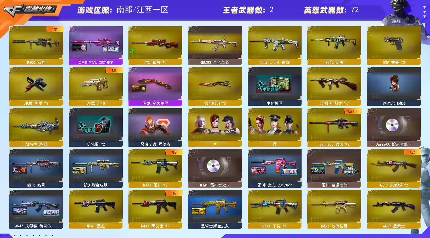 本游戏账号:英雄武器69个; 王者武器2个。 可以玩爆破号、生化号、双全装、稀有武器、等模式。装备不多,但是主武器、副武器、近身武器够用 拥有完美游戏体验。重要的是,特殊装备有:雷霆之锋、Scar Light-白虎、USP-雷暴、AK47-雷暴、M200-幻神、加特林-炼狱、麒麟刺、AWM-天龙、M4A1-玫瑰精灵、M4A1-黑骑士、Barrett-毁灭、M4A1-黑龙、AK47-火麒麟、QBZ03-金色蔷薇、M4A1-雷神、AK47-黑武士、王者之光、潘多拉、堕天使、圣诞潘多拉-X、生化弹匣、炼狱-悦蓝金色光效、Barrett-毁灭音效卡、M4A1-雷神音效卡、等,随意畅选。