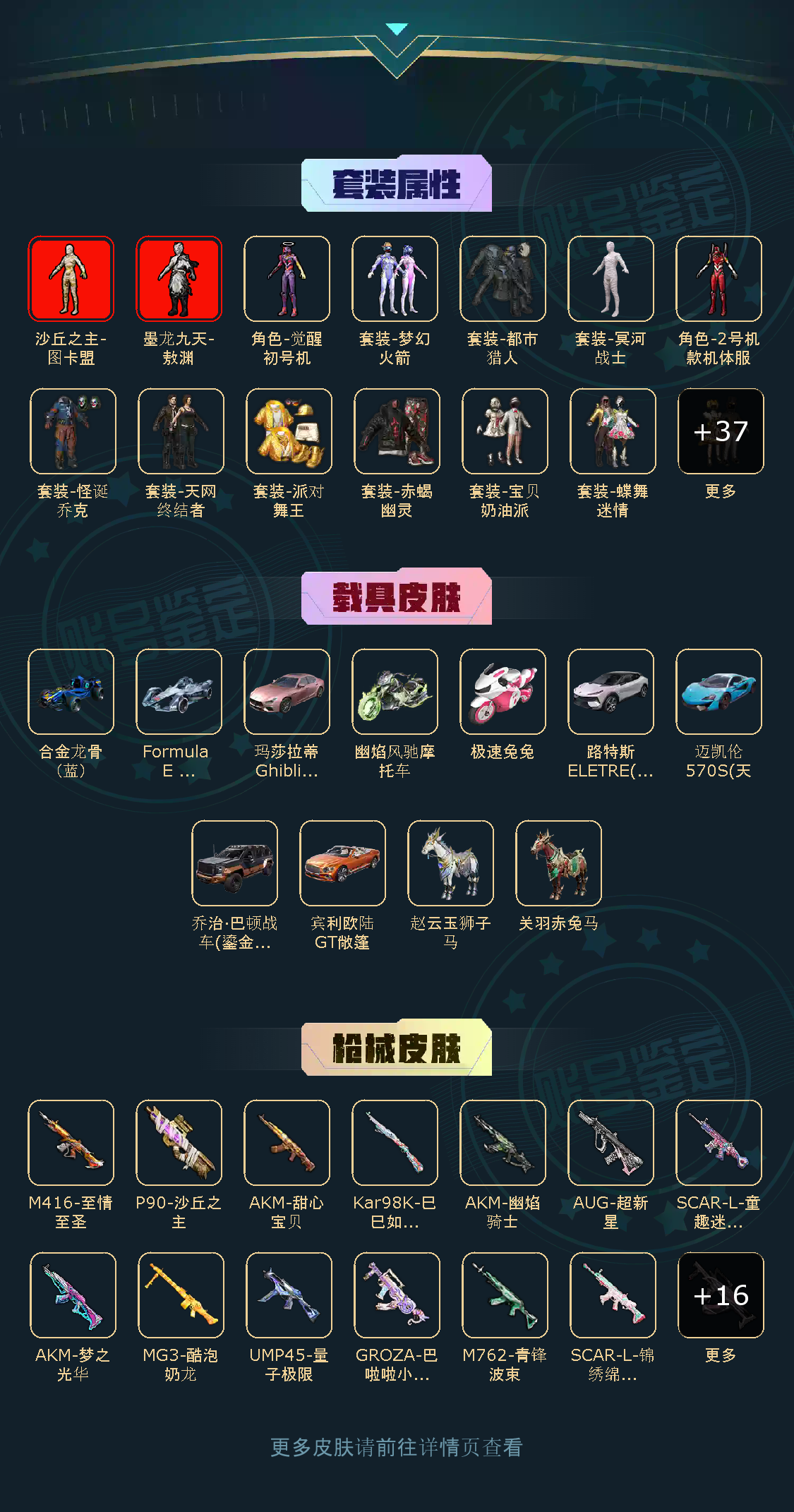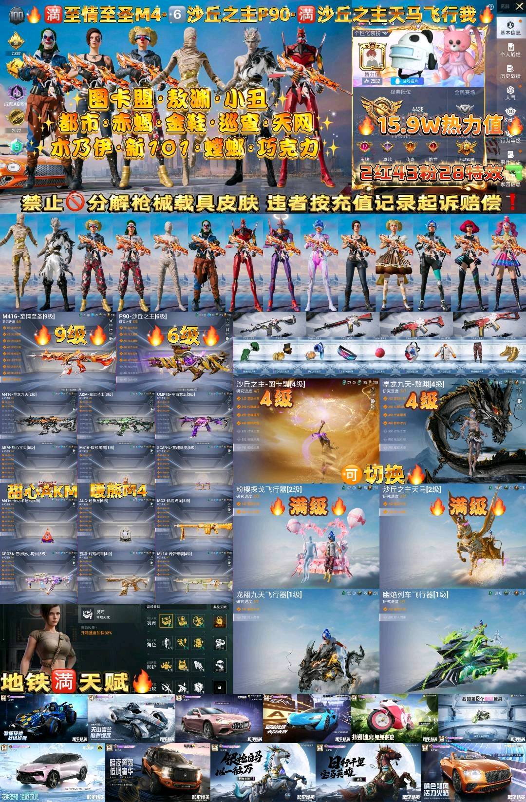 100粉,100载具,100特效枪,400套装,30王牌印记 UZI-绮梦青鸾/AKM-甜心宝贝/DP-28-扶摇飞仙/SCAR-L-梦幻火箭/SCAR-L-童趣迷兔/Kar98K-伏魔团/SKS-碧影闪光/M416-风花雪月/AUG-星之彼岸/SCAR-L-甜梦小狐/AWM-花间之火/M762-甜心娃娃/汤姆逊-怪笑疯兔/AWM-焰龙焚天/Vector-红伞翩翩/SKS-诡面斩/MG3-炙焰牛王/M762-激战未来/GROZA-香水柠檬/AWM-橘柚倾心/M416-心之恋语/平底锅-林间仙鹿/M16A4-葫芦兄弟/Mini14-荧光虫舞/M416-五爪金龙/M24-暗星紫秘/DP-28-枪炮玫瑰/DP-28-幻梦音符/AKM-炫紫旋律/Mini14-绚金瑰梦/MG3-洛神天依/GROZA-焦糖拿铁/SCAR-L-青春物语/M249-古战神甲/M762-冷魅冰骑/AKM-百合蜜语/UZI-筑梦精灵/SLR-暗夜玫瑰/S12K-海渊国主/VSS-烈焰拳霸/Kar98K-暗翼战神/UMP45-雪国精灵/M762-甜蜜誓约/UMP45-相思残雪/SCAR-L-机甲封神/M24-星之信仰/UMP45-恐龙拽拽/Mini14-龙虾霸霸/M249-蓝莓炮弹/野牛-流星咚咚/AKM-梦之光华/Kar98K-绿意幻情/路特斯EVIJA(星际黄)/兰博基尼Aventador(翡翠绿)/玛莎拉蒂Ghibli(金)/萌喵橘座/双人摩托-双刃魅影(绿)/阿斯顿·马丁DBX(橙)/特斯拉Model X(珍珠白)/俏皮小熊猫/路特斯ELETRE(冰川蓝)/兰博基尼URUS(炫光金)/特斯拉Roadster(尊享铂)/快艇-自由的鲸/海龙奔腾/特斯拉Roadster(沁心粉)/特斯拉Model 3(珍珠白)/玛莎拉蒂Ghibli(蓝)/阿斯顿·马丁DBS(红)/双人摩托-梦幻火箭/兰博基尼URUS(尊享铂)/特斯拉Model X(奇幻紫)/特斯拉Cybertruck(极昼黑)/特斯拉Cybertruck(荒芜蓝)/兰博基尼Estoque(炫光金)/金龙耀世/快艇-塞莎KL27(深潜蓝)/焰龙咆哮/兰博基尼URUS(明艳黄)/快艇-塞莎KL27(霓虹粉)/特斯拉Cybertruck(镭光铂)/双人摩托-双刃魅影(红)/兰博基尼Estoque(银翼灰)/双人摩托-双刃魅影(金)/合金龙骨(蓝)/灵鼠银迹/阿斯顿·马丁DBS(绿)/阿斯顿·马丁DBX(金)/特斯拉Model 3(奇幻紫)/特斯拉Model 3(冷光银)/合金龙骨(绿)/特斯拉Roadster(水滴蓝)/阿斯顿·马丁DBS(金)/路特斯ELETRE(花绽灰)/极速兔兔/鬼马风驰/南瓜骑士/合金龙骨(红)/兰博基尼Estoque(尊享铂)/玛莎拉蒂Ghibli(粉)/兰博基尼SVJ(尊享铂)/兰博基尼SVJ(炫光金)/软萌羊咩咩/快艇-塞莎KL27(鲸之蓝)/阿斯顿·马丁DBX(蓝)/特斯拉Model X(冷光银)