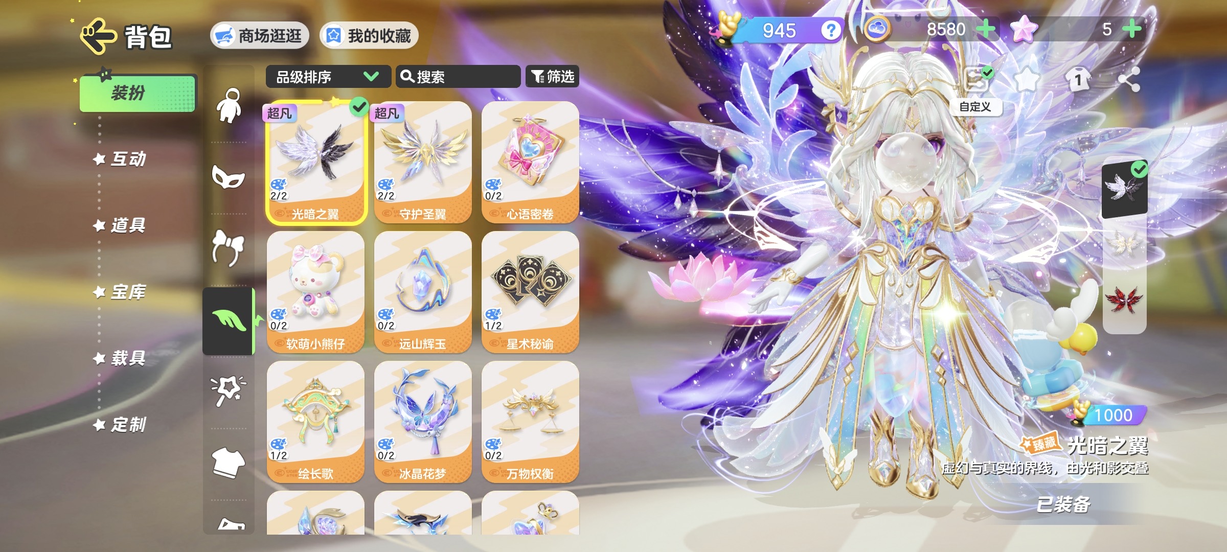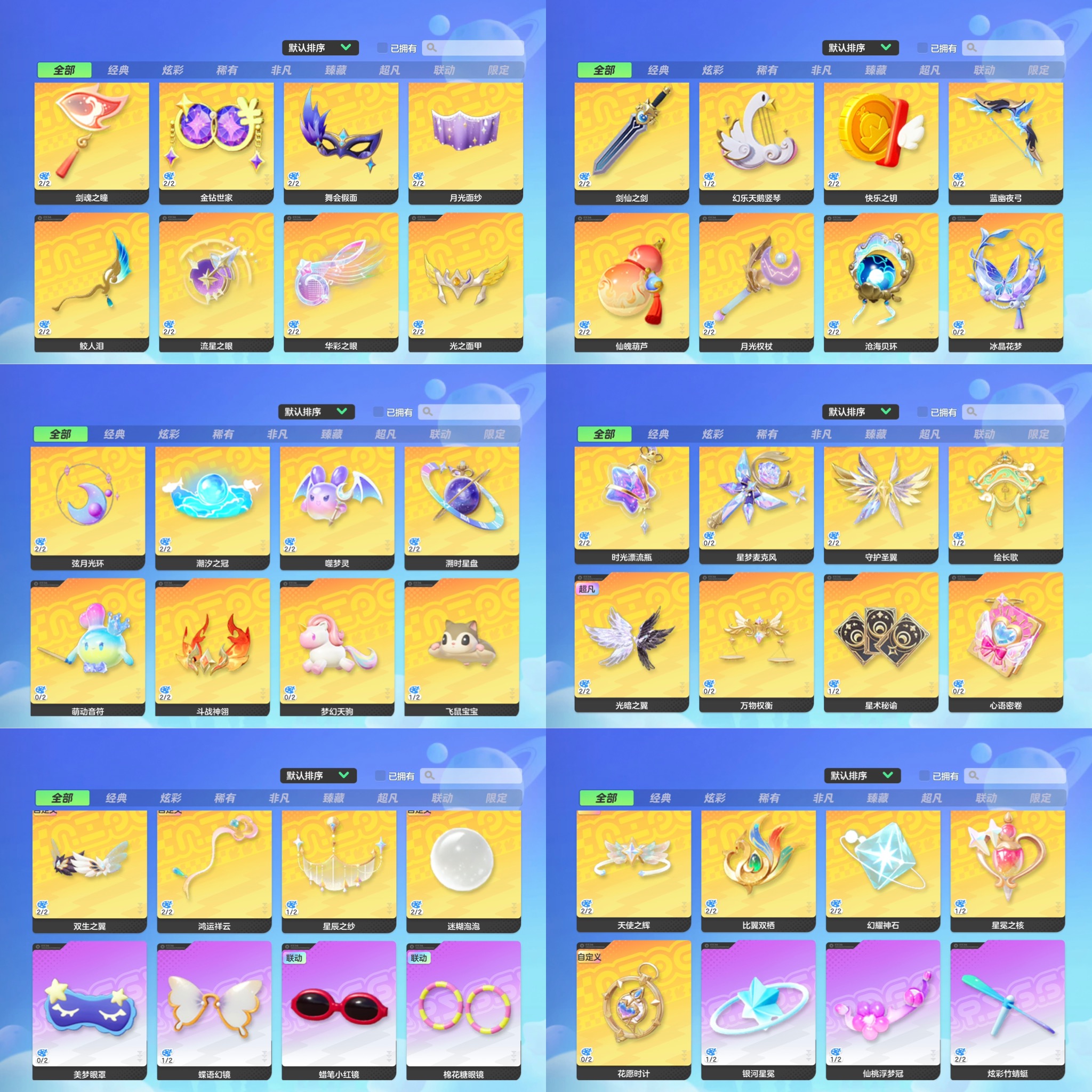背饰:剑仙之剑,梦梦背包,狂想曲吉他,守护之翼,绮梦灯,獺目乐之钥,哭哭咸鱼,追光头盔,小白背包,月光权杖,梦幻蝶翼,追风头盔,追梦头盔,剑魄葫芦,奶龙蛋,花韵之琴,小恶魔吉他,小能背包,桃气满满,沧海贝环,粉嘟嘟兔礼盒,缤纷甜甜圈,暗影之翼,星梦背包,烈之翼,琳琅纱织,骑士背包,康达姆机器人,幻乐天鹅竖琴