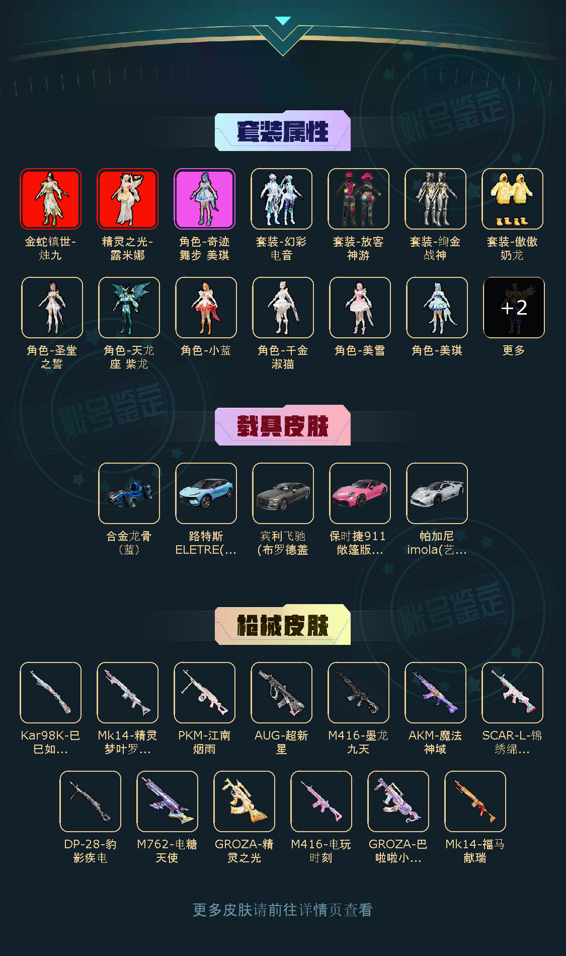 【稀有资产】精灵之光-露米娜[2级]/金蛇镇世-烛九[1级]/角色-千金淑猫/AUG-超新星/M416-墨龙九天/M416-电玩时刻/GROZA-精灵之光/套装-深海小丑鱼/套装-龟仙人/角色-粉雾星云/角色-都市丽猫/角色-怀庆长公主/角色-银尘/角色-冰公主/角色-情公主/角色-白光莹