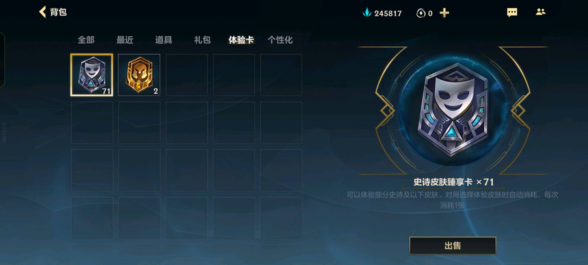 除了排位保护卡,史诗皮肤体验卡,经验金币加成卡,语音体验包,回城特效体验卡,皮肤体验礼包您随便用以外,其他的道具还请您不要乱动,(号主辛苦攒了好久)。