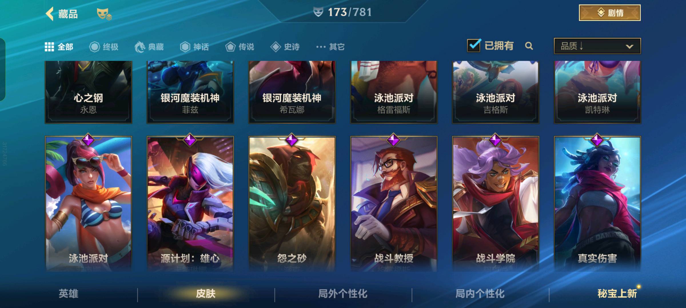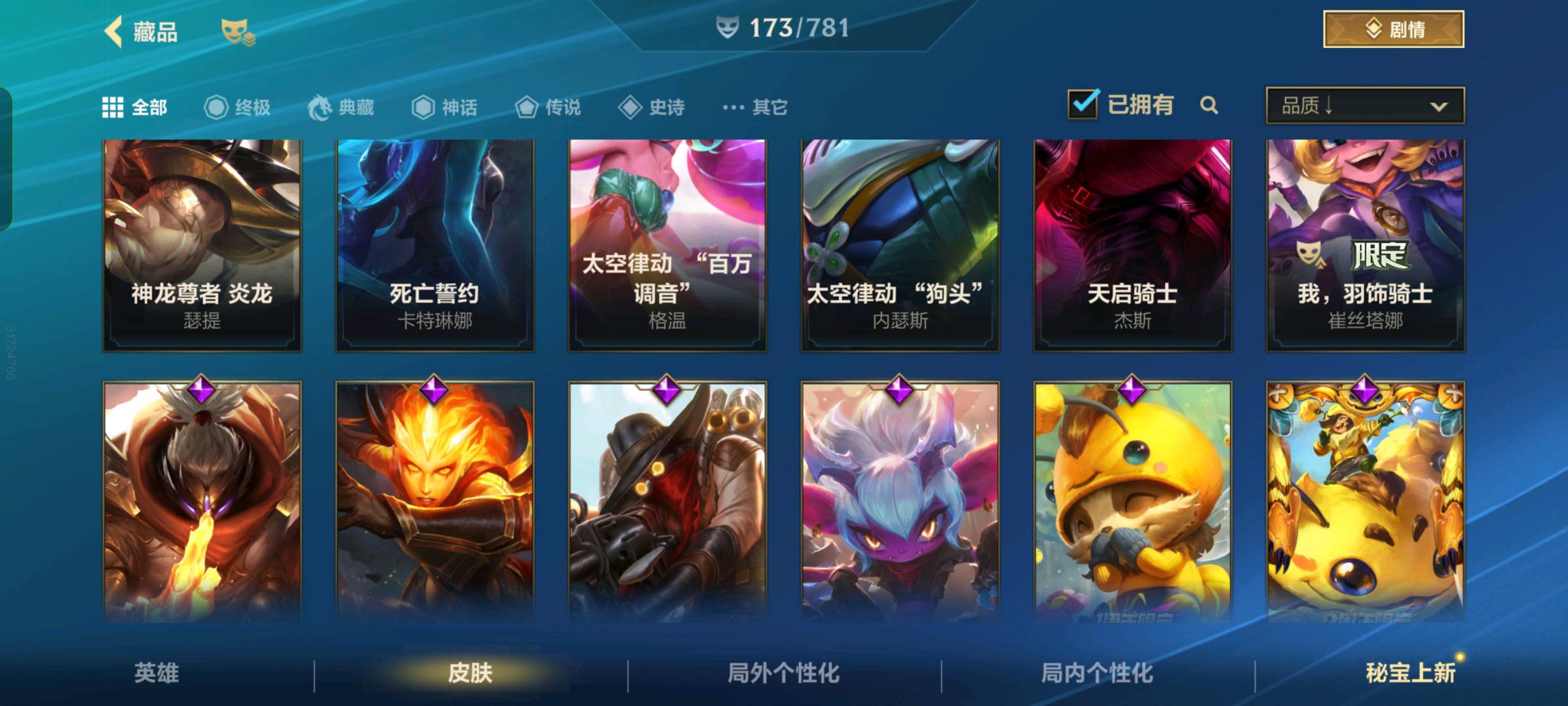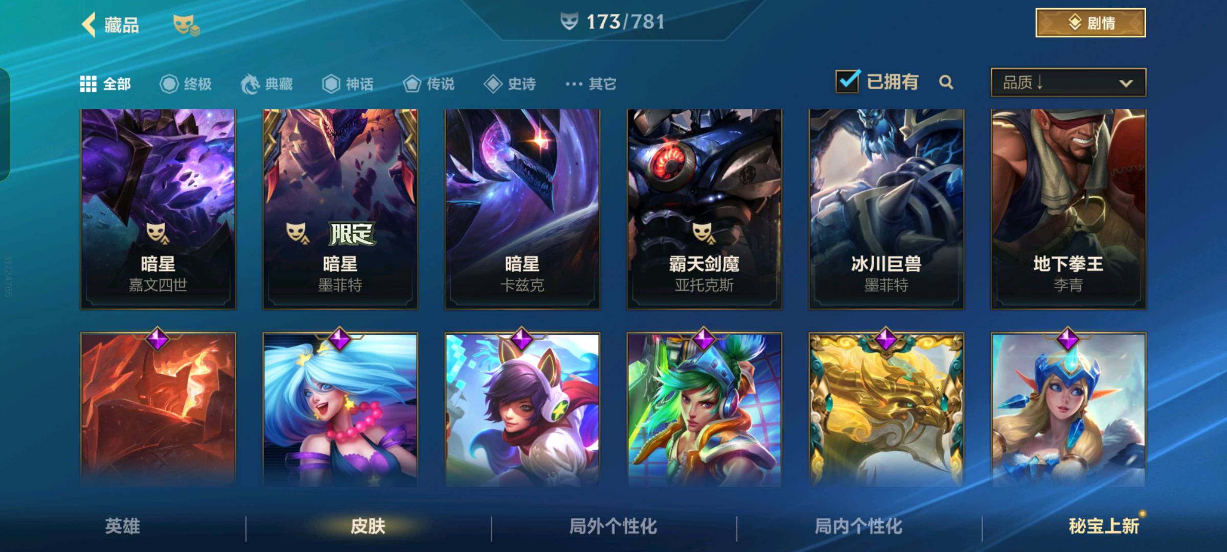 【安卓】 【允许排位】等级262 安卓Q服 全英雄 173款皮肤 一款神话 12款传说 60款史诗 可以排位 无禁言