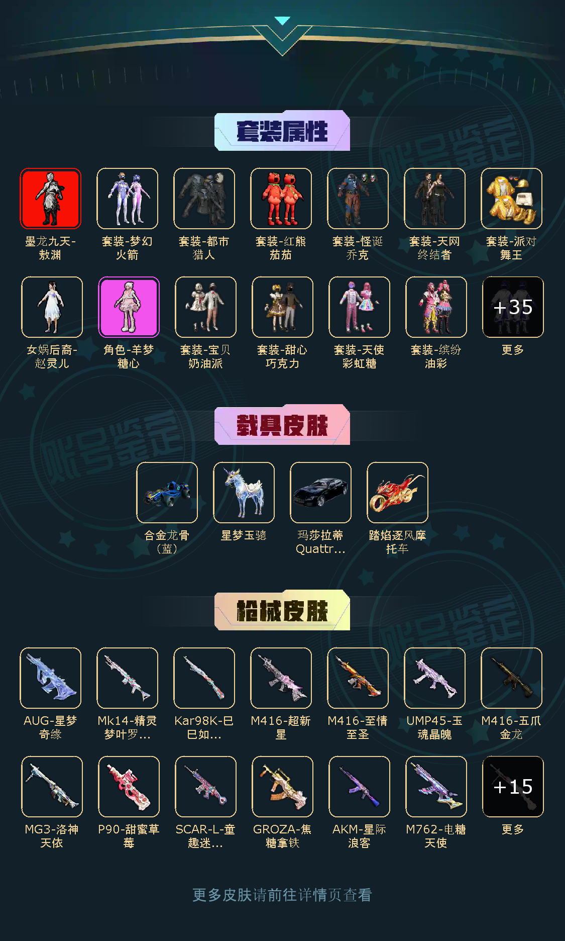 44粉,4载具,274套装,17王牌印记,无敌战神历史最高段,157329热力值 平底锅-仲夏莫吉托/SCAR-L-童趣迷兔/AUG-星梦奇缘/AKM-绿萝繁花/M762-电糖天使/M416-心之恋语/M416-五爪金龙/M16A4-垂柳戏鸭/AKM-白勺歌姬/M416-墨龙九天/GROZA-焦糖拿铁/SCAR-L-青春物语/M416-至情至圣/AKM-星际浪客/AUG-超新星/M416-超新星/SCAR-L-魔童闹海 哪吒/M417-第五大道/Mk14-精灵梦叶罗丽/Mk14-闲梦青缨/MG3-酷泡奶龙/MG3-洛神天依/DP-28-千金淑猫/DP-28-豹影疾电/UZI-绮梦青鸾/P90-甜蜜草莓/UMP45-玉魂晶魄/Kar98K-巳巳如意/玛莎拉蒂Quattroporte夜幕蓝/合金龙骨(蓝)/星梦玉骢/踏焰逐风摩托车/