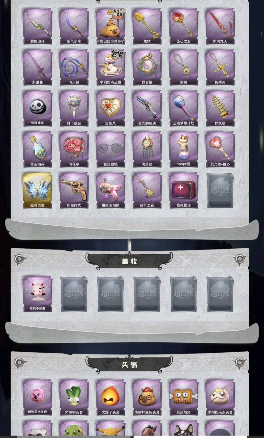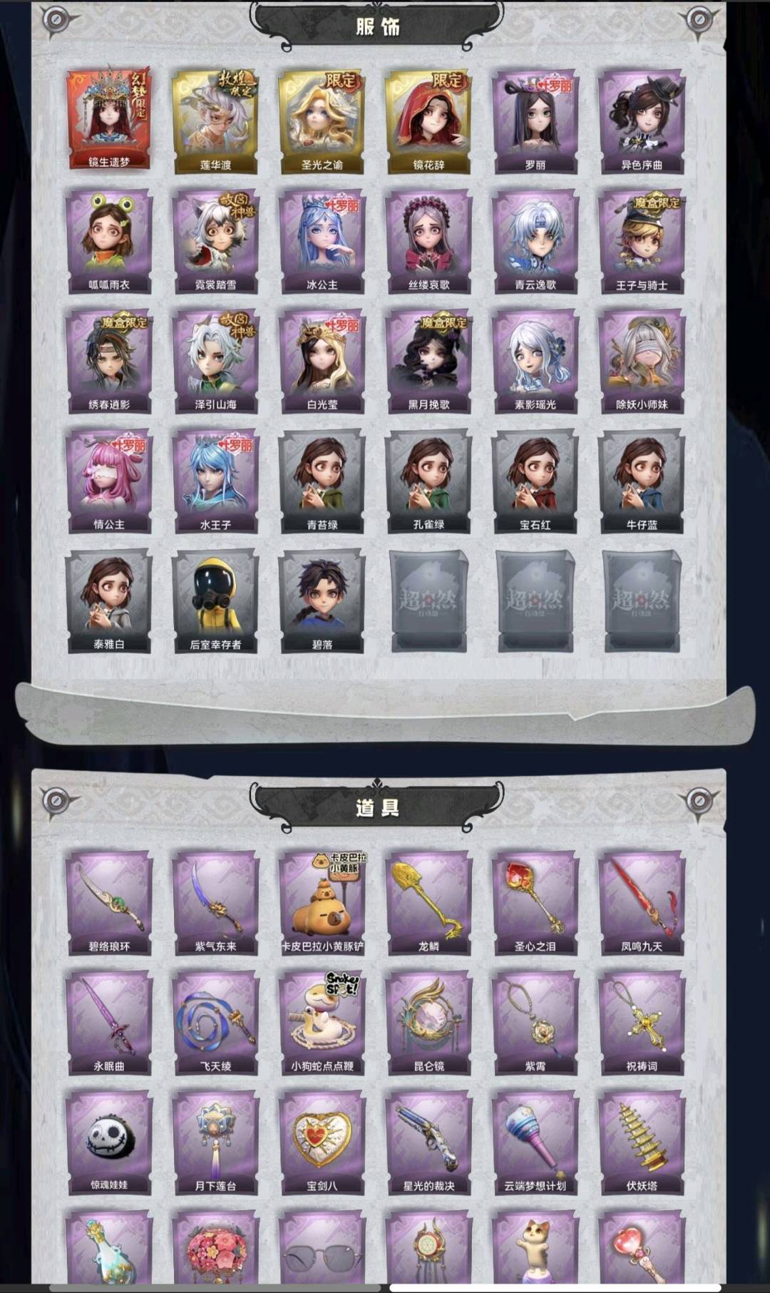 默认关注上限,加不了好友,有二级密码,以此维权会全平台全账号拉黑,红皮1;金皮3;紫皮16;道具皮29;皮肤:巫铃儿-镜生遗梦,逍遥-莲华渡,薇薇安-圣光之谕,巫铃儿-镜花辞,小黄-罗丽,小黄-异色序曲,小黄-呱呱雨衣,小黄-霓裳踏雪,爱丽丝-冰公主,爱丽丝-丝缕哀歌,零-青云逸歌,阿念-王子与骑士,逍遥-绣春逍影,逍遥-泽引山海,薇薇安-白光莹,薇薇安-黑月挽歌,巫铃儿-素影瑶光,莉莉-除妖小师妹,莉莉-情公主,艾伦-水王子;道具:刺刀-碧络琅环,刺刀-紫气东来,铲子-卡皮巴拉小黄豚铲,铲子-龙鳞,铲子-圣心之泪,桃木剑-凤鸣九天,桃木剑-永眠曲,长鞭-飞天绫,长鞭-小狗蛇点点鞭,传送按钮-昆仑镜,摸金符-紫霄,摸金符-祝祷词,腰包-惊魂娃娃,腰包-月下莲台,腰包-宝剑八,短管猎枪-星光的裁决,专业手电-云端梦想计划,葫芦-伏妖塔,黄牛能量饮料-青玉抱丹,额外的背包-飞花令,夜视仪-金丝眼镜,音响-鸣沙鼓,音响-happy猫,荧光棒-桃心-荧光棒-桃心,喷气背包-晶澜灵翼,转轮手枪-新星时代,电击枪-甜蜜泡泡枪,除颤仪-弦外之音,急救包-蔷薇物语;美妆:美妆-暗夜小恶魔;饰品:头饰-精致露比头套,头饰-大葱明头套,头饰-火爆了头套,头饰-小财神豚豚头套,头饰-炙热烧烤,头饰-小狗蛇点点头套,头饰-驼半仙头套,头饰-鱼头怪头套,头饰-烈焰红唇头套,头饰-面具马头套,头饰-哈士奇头套,头饰-萨卡班甲鱼头套,头饰-嘻嘻头套,头饰-滑稽头套,头饰-呆滞头套,头饰-卑微头套,头饰-像素朋克墨镜,背饰-梵音莲华,背饰-绒团小狐狸,背饰-蝶恋花,背饰-毛球夹子,背饰-天使的呼唤,背饰-在逃小新娘,挂饰-糖果守卫,挂饰-九色祥鹿,挂饰-钗头凤,挂饰-小鲨包包,挂饰-未竟乐园,挂饰-天使消失的年代,美妆-暗夜小恶魔;动作:动作-知世摇,动作-luvaboy,动作-鸳鸯戏,动作-刀马舞,动作-萨克斯律动舞,动作-九万字舞,动作-鹏友摇,动作-DL摇,动作-伤心摇,动作-心跳摇,动作-来财舞,动作-小雨摇,动作-胜利之舞,动作-舞台中心,动作-举牌;工牌背景:卷珠帘,心同野鹤,粉嫩小海狸,花蕾城堡,雷霆轩,水玲珑宫,佛系小豚,冰晶宫,情语塔,点点萌伴,圣光之誓;工牌动作:净禅,元气剪刀手,虔诚之姿;员工:小黄,爱丽丝,零,阿念,逍遥,薇薇安,巫铃儿,莉莉,艾伦,爱德华,兰;累充3882元;铲铲币无兔宝无兔宝无兔宝