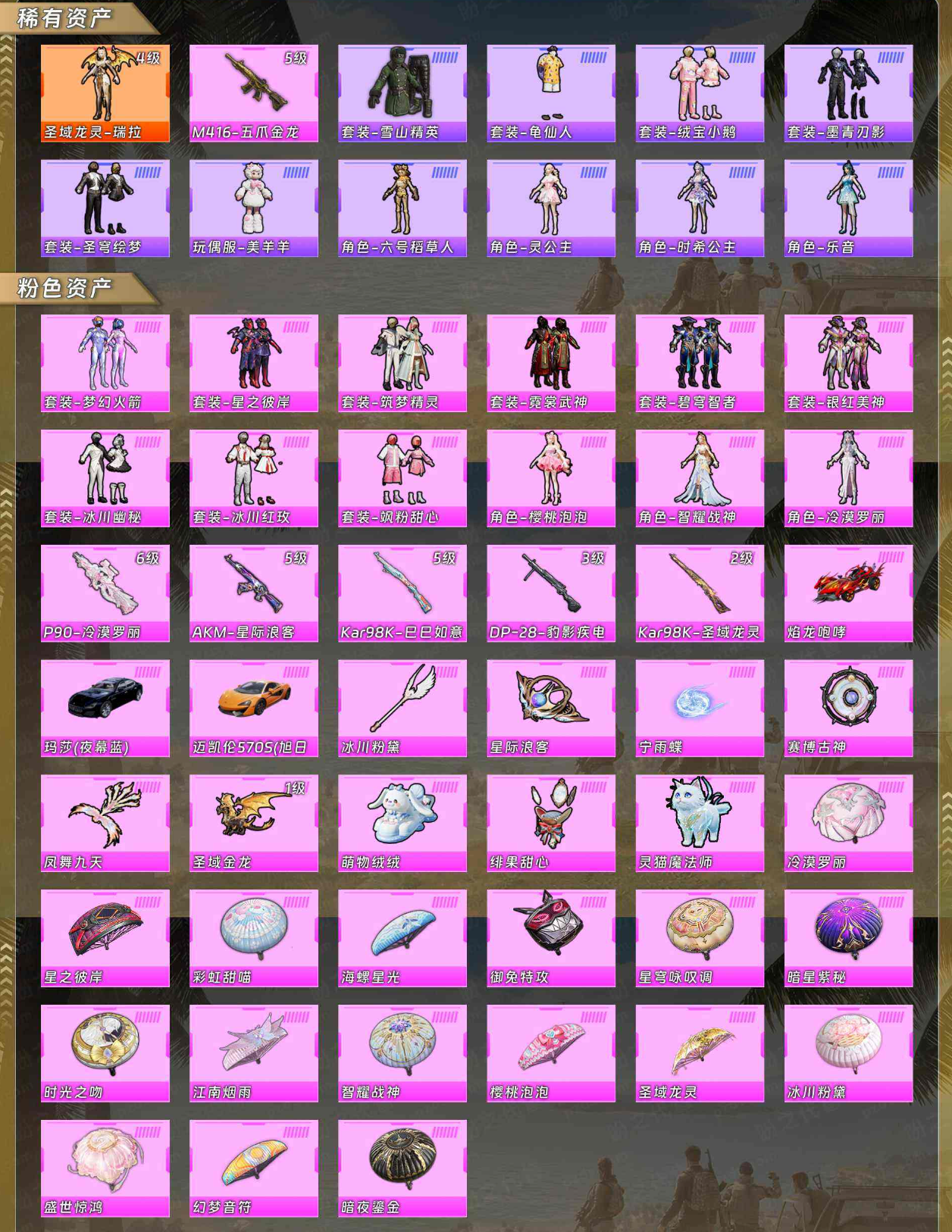 【稀有资产】圣域龙灵-瑞拉[4级]/M416-五爪金龙/套装-雪山精英/套装-龟仙人/套装-绒宝小鹅/套装-墨青刃影/套装-圣穹绘梦/玩偶服-美羊羊/角色-六号稻草人/角色-灵公主/角色-时希公主/角色-乐音