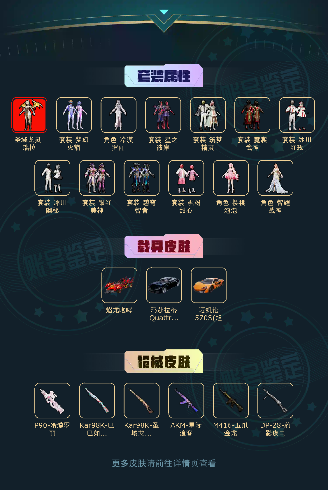 【粉色套装】套装-梦幻火箭/套装-星之彼岸/套装-筑梦精灵/套装-霓裳武神/套装-碧穹智者/套装-银红美神/套装-冰川幽秘/套装-冰川红玫/套装-飒粉甜心/角色-樱桃泡泡/角色-智耀战神/角色-冷漠罗丽