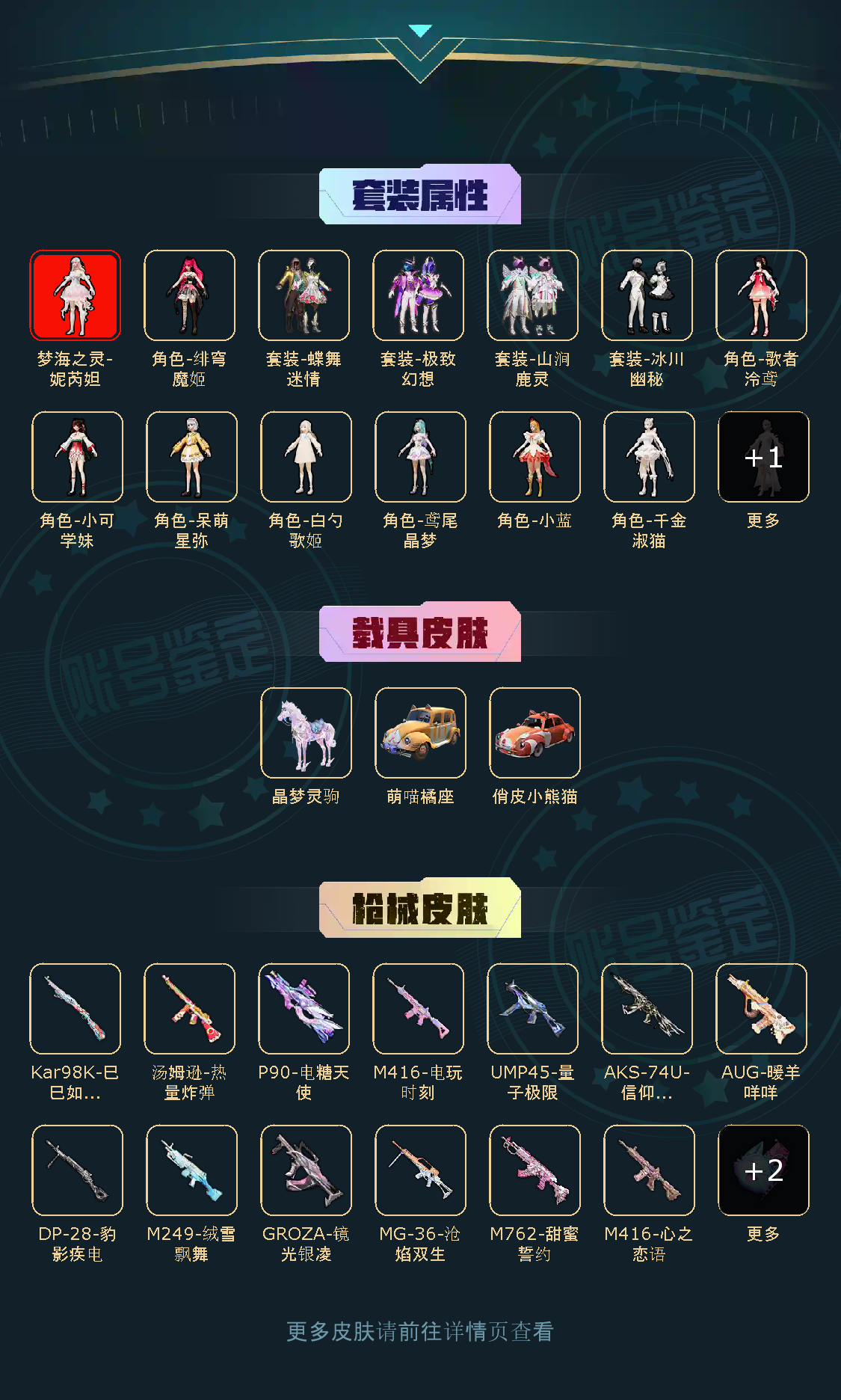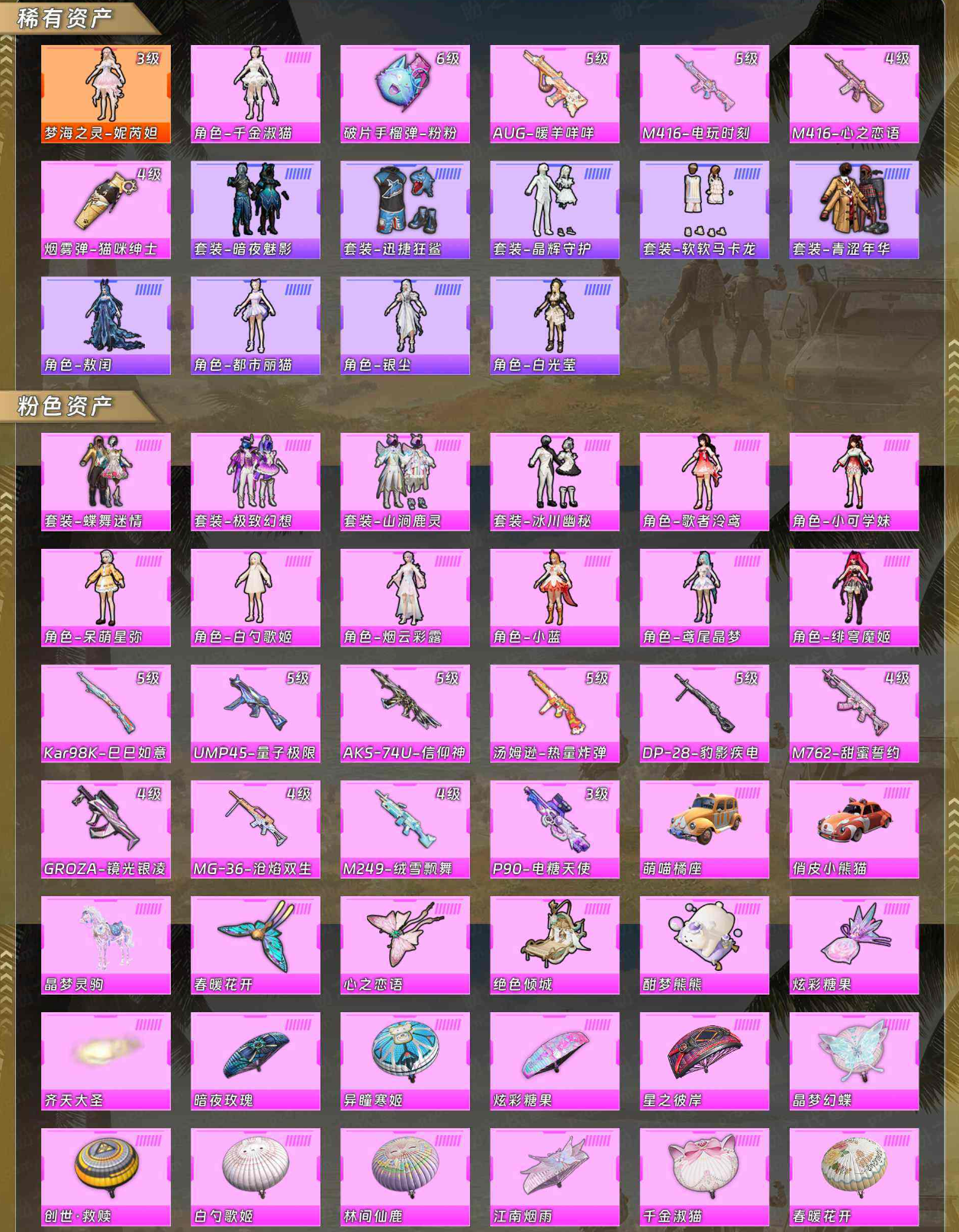 【稀有资产】梦海之灵-妮芮妲[3级]/角色-千金淑猫/破片手榴弹-粉粉猫爪/AUG-暖羊咩咩/M416-电玩时刻/M416-心之恋语/烟雾弹-猫咪绅士/套装-暗夜魅影/套装-迅捷狂鲨/套装-晶辉守护/套装-软软马卡龙/套装-青涩年华/角色-敖闰/角色-都市丽猫/角色-银尘/角色-白光莹
