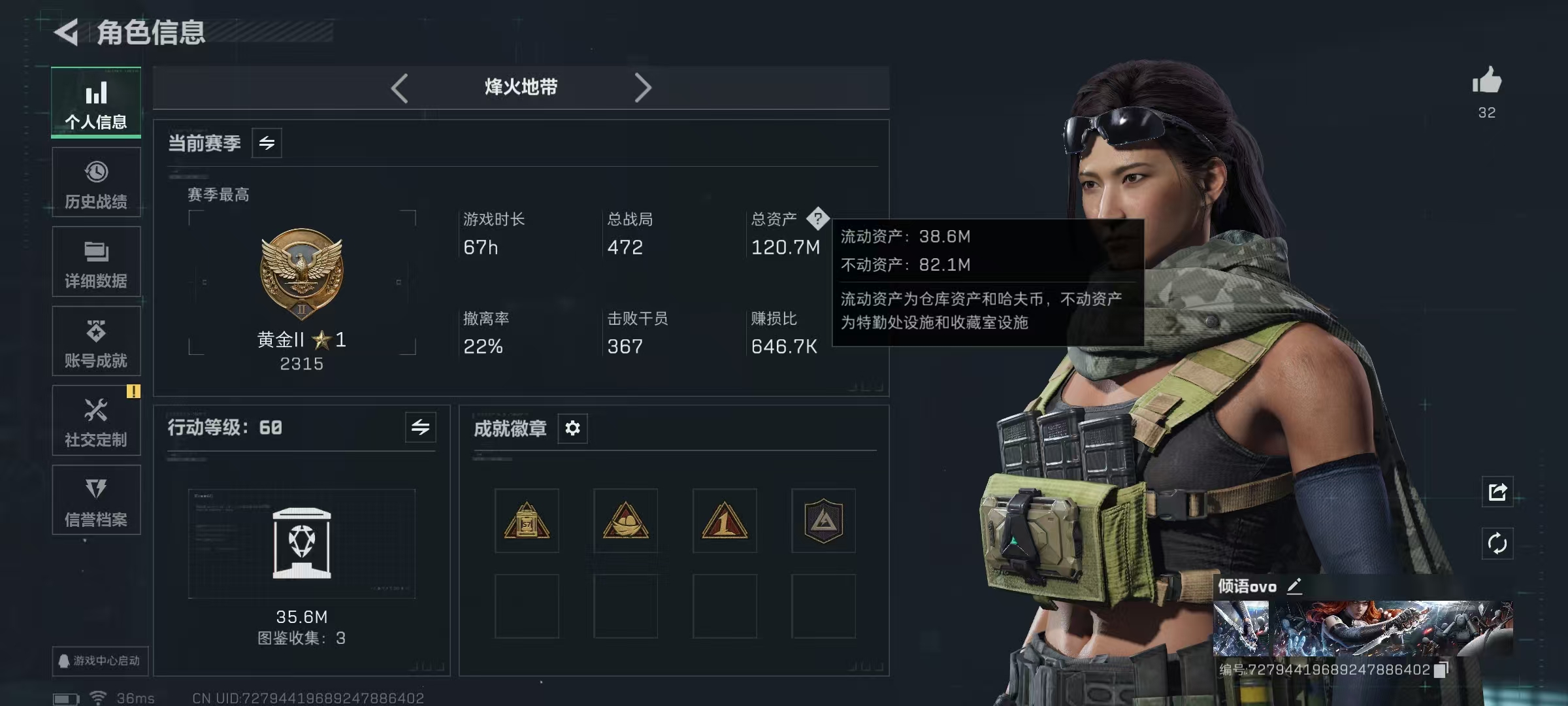 武器皮肤132;烽火60级:黄金Ⅱ,战场:上等兵Ⅱ,【安全箱】9格安全箱;【特勤处等级】仓库LV.9,靶场LV.6,训练中心LV.7,收藏室LV.1,潜水中心LV.1;【捆绑包6】电锯惊魂捆绑包,维什戴尔捆绑包,蚀金玫瑰捆绑包,电锯惊魂干员捆绑包,死神玫瑰捆绑包,信条捆绑包;【干员皮肤3】骇爪维什戴尔,红狼蚀金玫瑰,红狼电锯惊魂;【近战皮肤】近战武器-电锯惊魂,近战武器-信条,近战武器-黑鹰;【步枪皮肤】M4A1突击步枪-阿米娅,M4A1突击步枪-蚀金玫瑰,SG552突击步枪-运动员,SCAR-H战斗步枪-启航,G3战斗步枪-骑士,CAR-15突击步枪-阿米娅,ASVal突击步枪-死神玫瑰,腾龙突击步枪-死神玫瑰,KC17突击步枪-电锯惊魂,ASh-12战斗步枪-无极限,AUG突击步枪-蝮蛇,G3战斗步枪-流沙送葬,ASVal突击步枪-百步穿杨,腾龙突击步枪-猎鳄行动,K437突击步枪-守护者;【冲锋枪皮肤】P90冲锋枪-信条,MP7冲锋枪-原型机,MP5冲锋枪-深海恐惧,MP5冲锋枪-战术竞备,SR-3M紧凑突击步枪-战术竞备,MP7冲锋枪-守护者;【射手步枪皮肤】M14射手步枪-电锯惊魂,SR-25射手步枪-信条,Mini-14射手步枪-守护者;【狙击步枪皮肤】R93狙击步枪-维什戴尔,M700狙击步枪-哈夫克警备,AWM狙击步枪-无极限;【霰弹枪皮肤】S12K霰弹枪-死神玫瑰,S12K霰弹枪-电锯惊魂;【轻机枪皮肤】M250通用机枪-骑士之心,PKM通用机枪-蝮蛇;【复合弓皮肤】复合弓-守护者;【挂饰15】窃风密探,窃风密探,窃风密探,窃风密探,黄金视野,赤霄游龙,麦小鼠,挂饰-蚀金玫瑰,挂饰-维什戴尔,挂饰-比利的面具,挂饰-信条,挂饰-龙门币,挂饰-启程,挂饰-死神玫瑰;【载具29】轮式突击炮-域外狂徒,防空车-凝视,步战车-警戒线,步战车-移动堡垒,防空车-移动堡垒,轮式突击炮-荣耀,M1A4坦克-移动堡垒,轮式突击炮-移动堡垒,GTQ-35坦克-移动堡垒,步战车-钢铁洪流,防空车-钢铁洪流,轮式突击炮-钢铁洪流,突击直升机-凝视,步战车-原始伪装,防空车-原始伪装,轮式突击炮-巅峰竞赛,GTQ35坦克-巅峰竞赛,侦察直升机-原始伪装,突击直升机-原始伪装,侦察直升机-巅峰竞赛,全地形车-森林迷彩,全地形车-护林人,M1A4坦克-护林人,突击车-寒梅,轮式突击炮-寒梅,GTQ35坦克-寒梅,突击直升机-护林人,侦察直升机-护林人,突击直升机-寒梅;