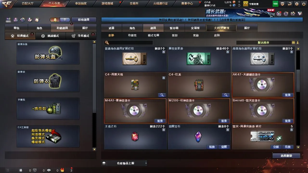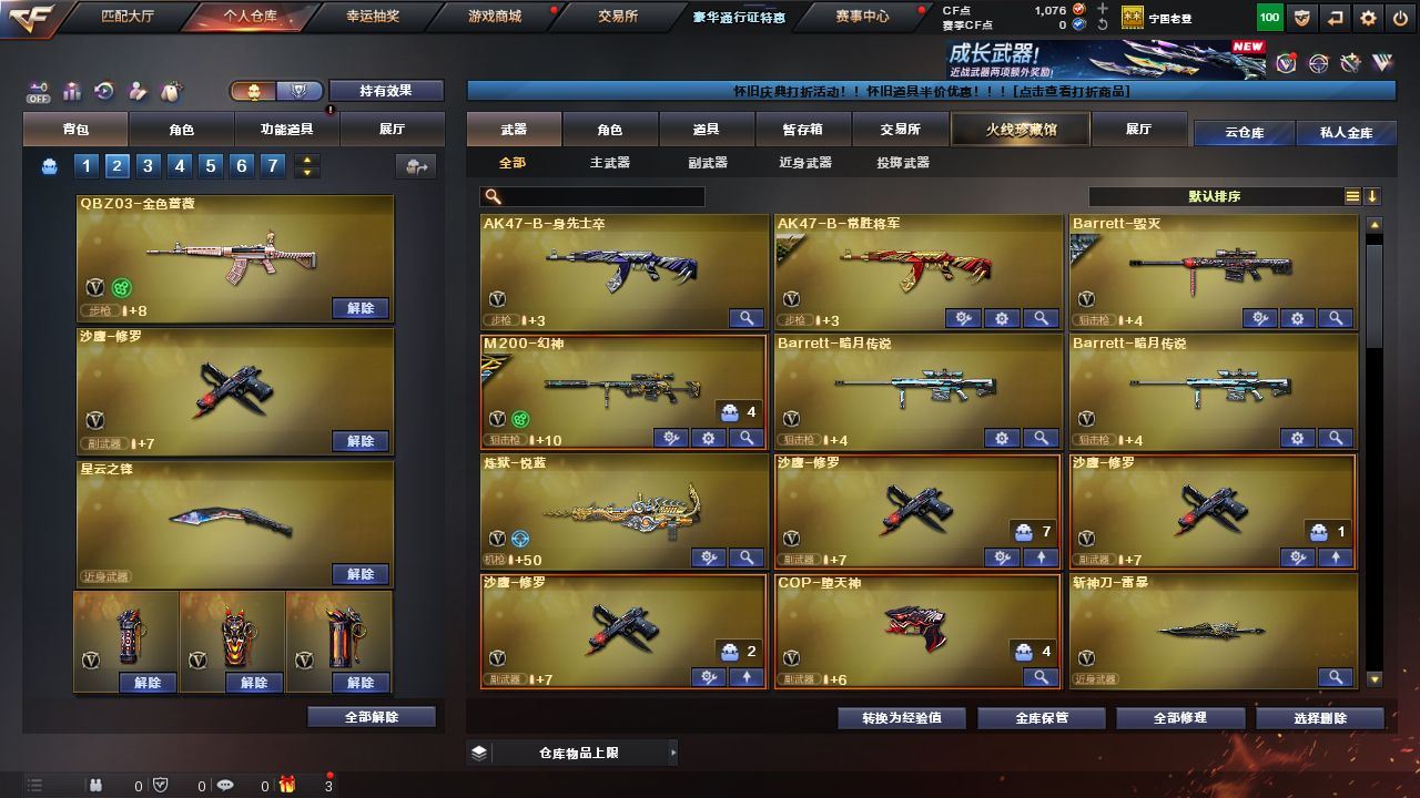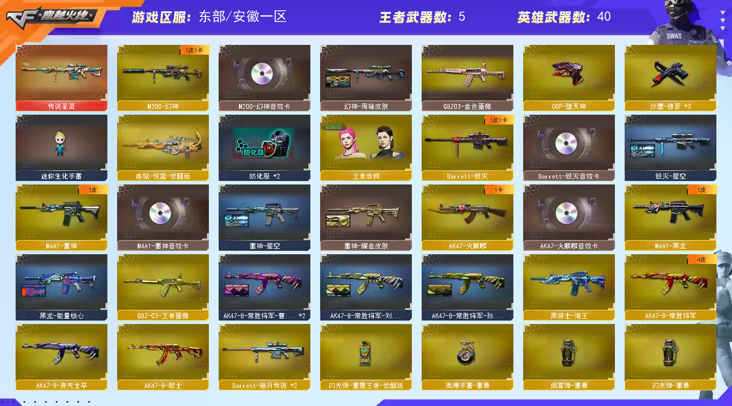 【传说圣灵】【M200-幻神+周瑜皮肤+M200-幻神音效卡】【QBZ03-金色蔷薇】【COP-堕天神/沙鹰-修罗(3)】【麒麟刺-堕天神(2)/龙啸-堕天神/王者之击(2)/斩神刀-雷暴】【QBZ-03-王者蔷薇】【王者涂鸦】【M4A1-雷神音效卡/AK47-火麒麟音效卡/Barrett-毁灭音效卡】【毁灭-星空/天龙-CFSTAR/火麒麟-CFSTAR/AK47-B-常胜将军-刘备/AK47-B-常胜将军-孙权/AK47-B-常胜将军-曹操/M4A1-千变-孔明皮肤/雷神-耀金皮肤/雷神-星空/黑龙-能量核心】【Barrett-毁灭/Barrett-暗月传说(2)/M4A1-雷神/M4A1-黑龙/黑骑士-海王/AK47-火麒麟/AK47-B-身先士卒/AK47-B-常胜将军/AK47-B-战士/9A91-烈火】