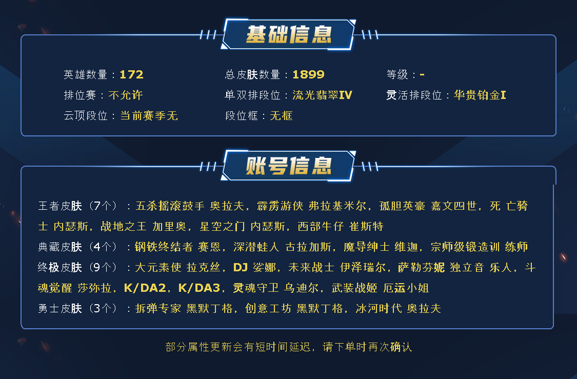 1337原皮,签名狐狸,殿堂卡莎,4氪金神话,1圣堂,黑夜使者亚索,堕落神王盖伦,堕落诺手。圣堂铁男。冠军皮肤全套。