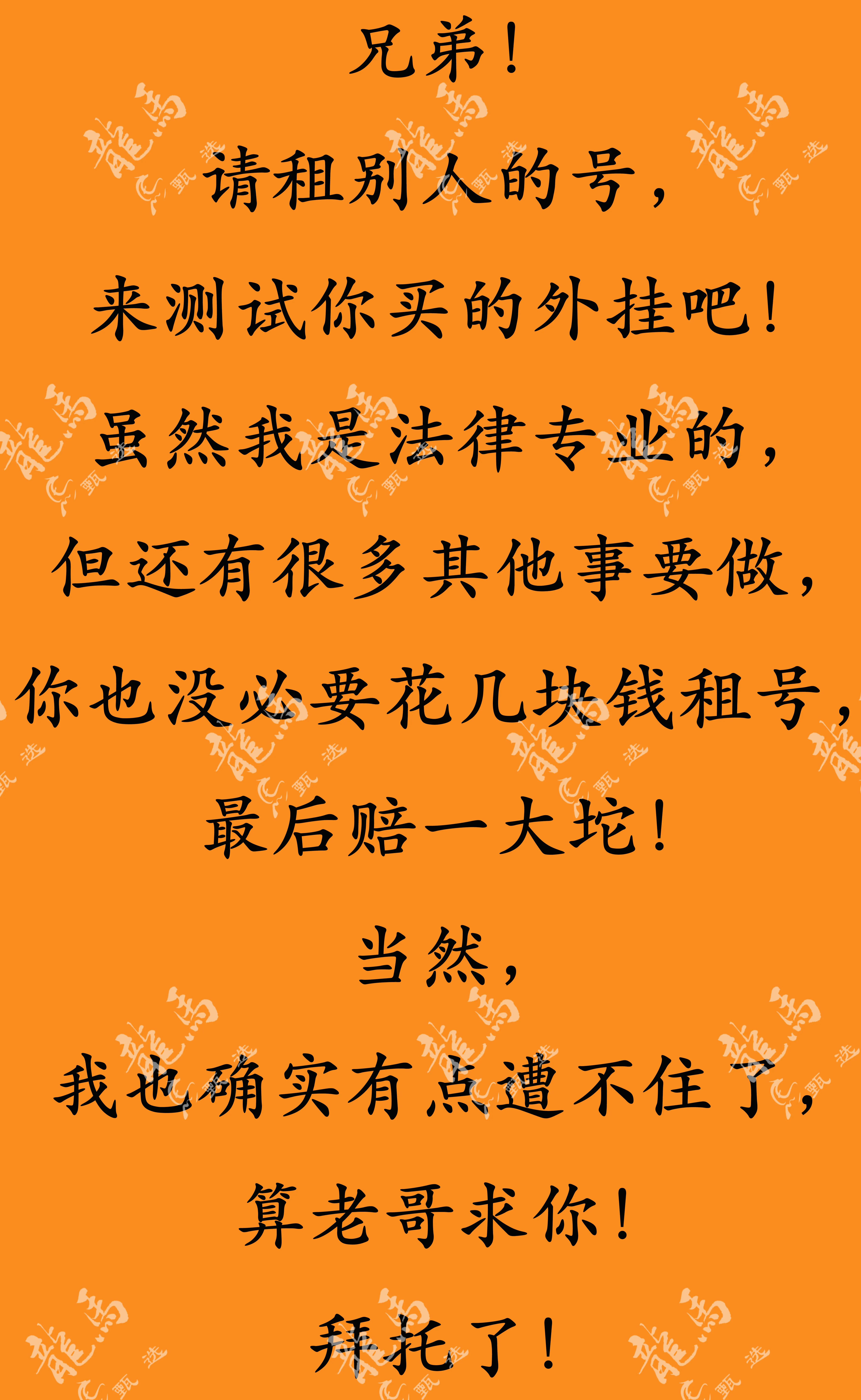 细看以上内容后,如果您还是为了寻求刺激,花几块钱租号开挂,这封号十年的代价,可能就是让您赔偿充值金额,您细算一下是否划算?话已至此,您仍然一意孤行,那现在您的行为有多无情,咱们公堂之上,牢门之间,您就有多难堪!