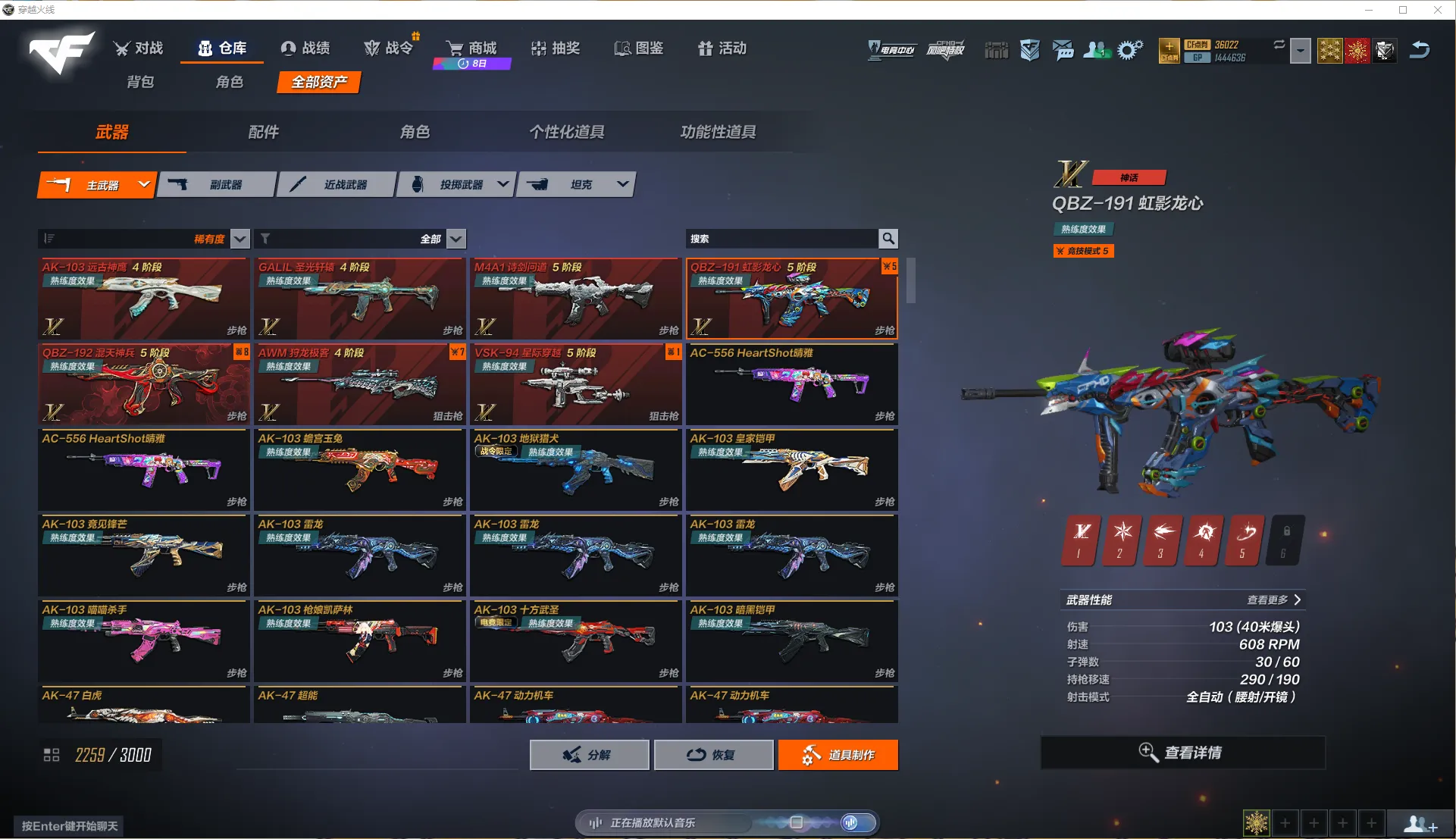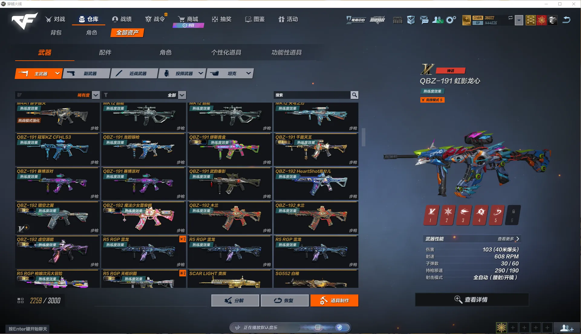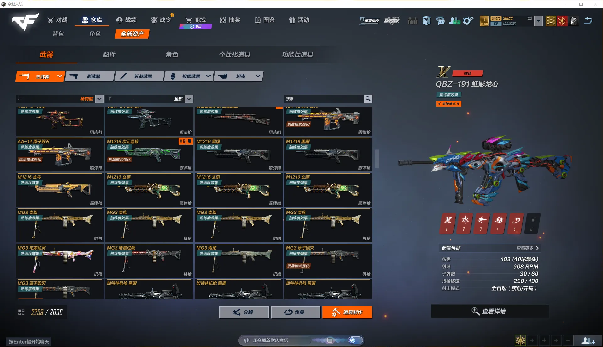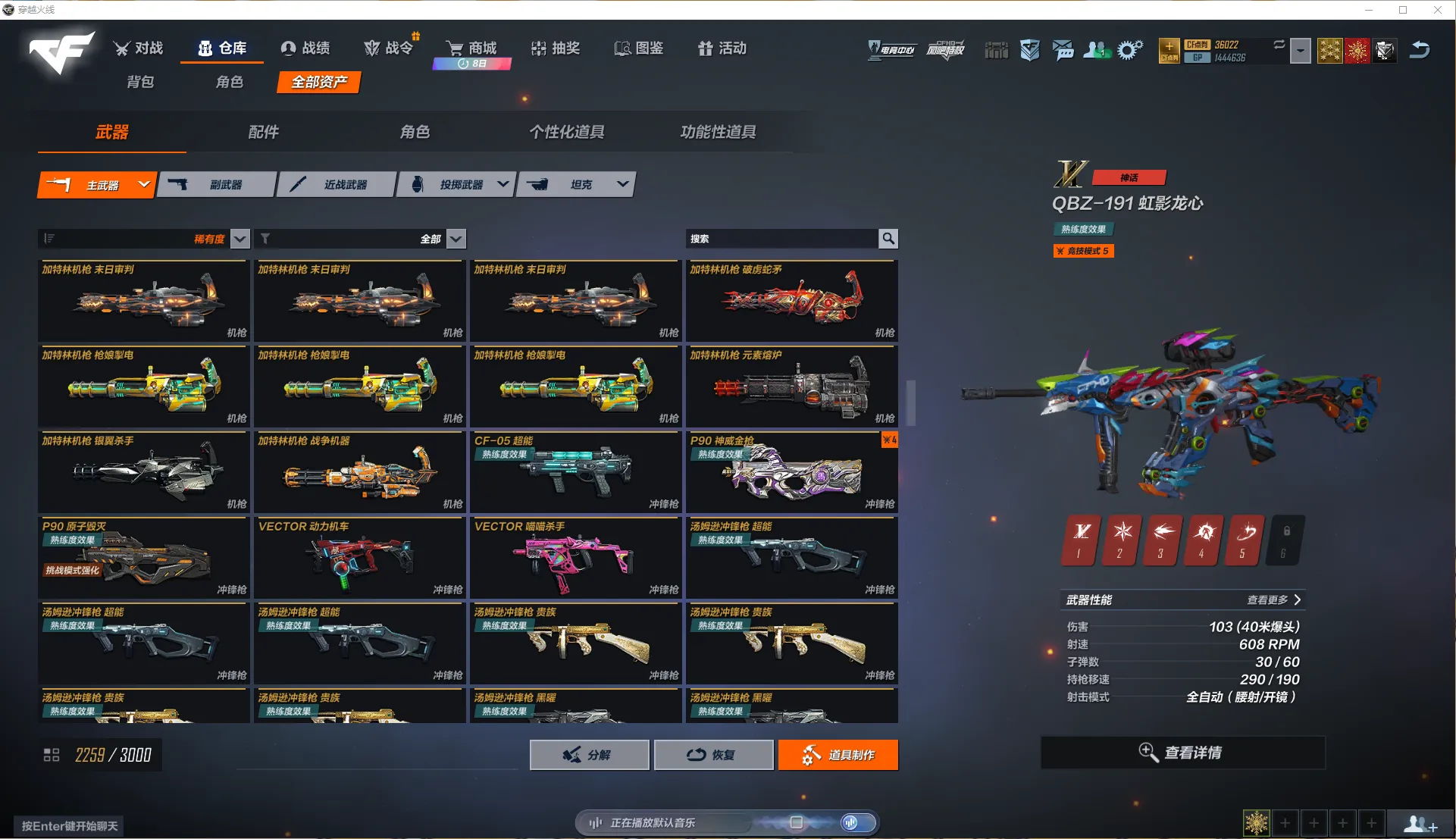 全区氪金前100极品账号!7个满级神话,196个主武器金皮,副武器45把!近战武器76把!