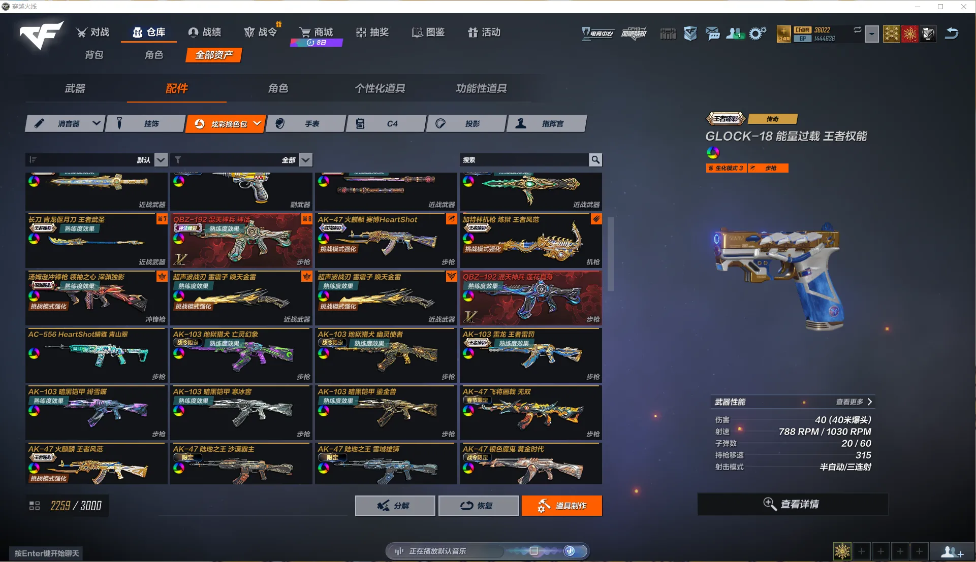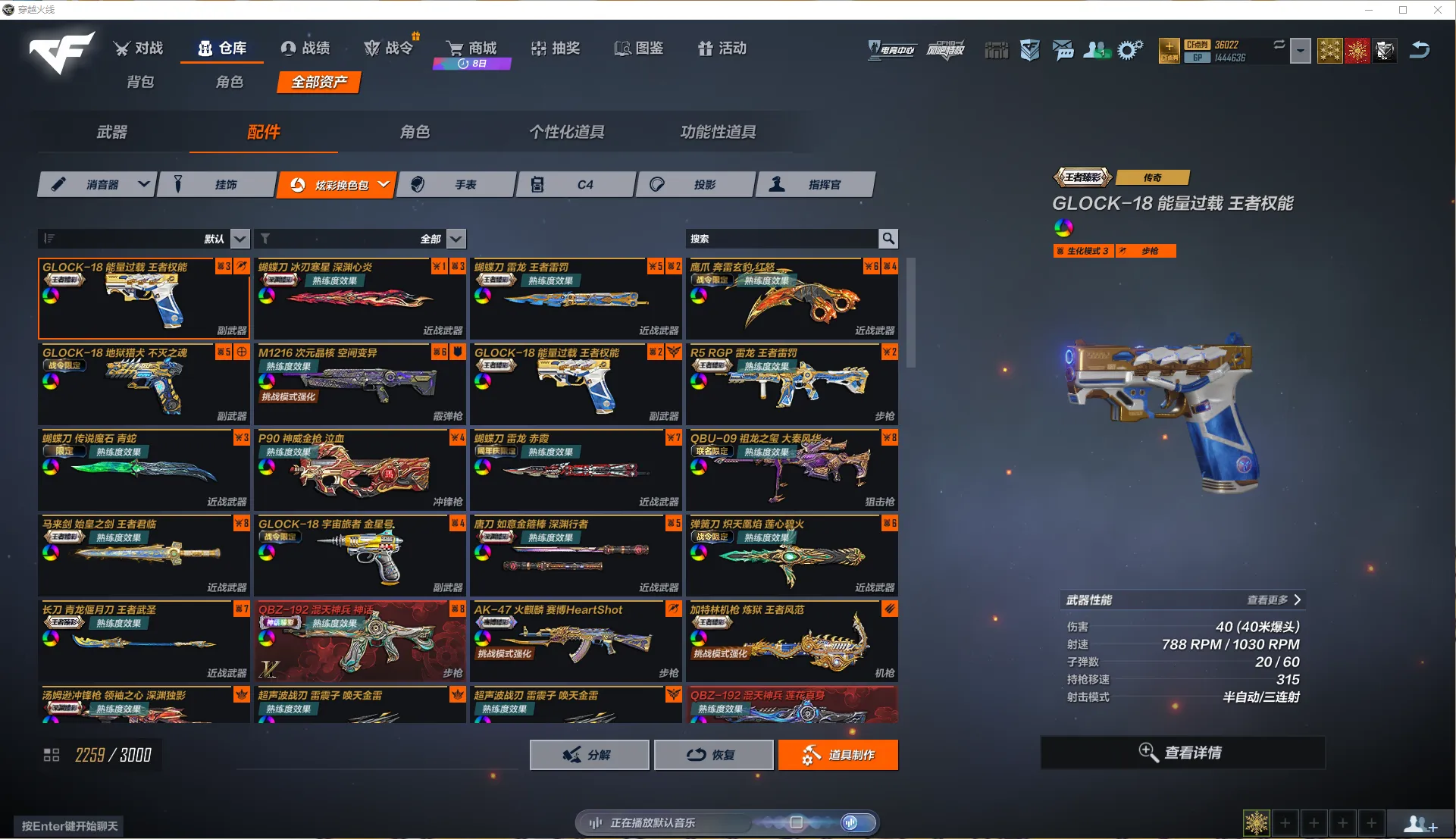 7个满级神话,196个主武器金皮,副武器45把,其中GLOCK-18能量过载共8把,缪斯音盒2把,等战令限定皮肤也是基本全部都有!近战武器76把,其中唐刀诗剑问道5把,雷龙3把,超声波战刃雷震子3把,弹簧刀能量过载3把,网页皮肤基本全部都有,战令限定皮肤也是基本全部都有!
