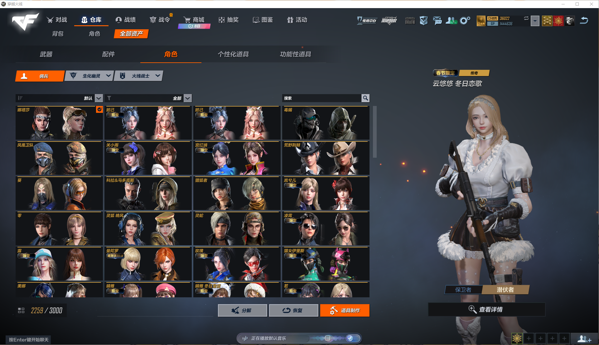 角色:38个金皮角色,26个紫皮角色,其中限定角色14个,绝版角色有:毒蝎,暗影部队!