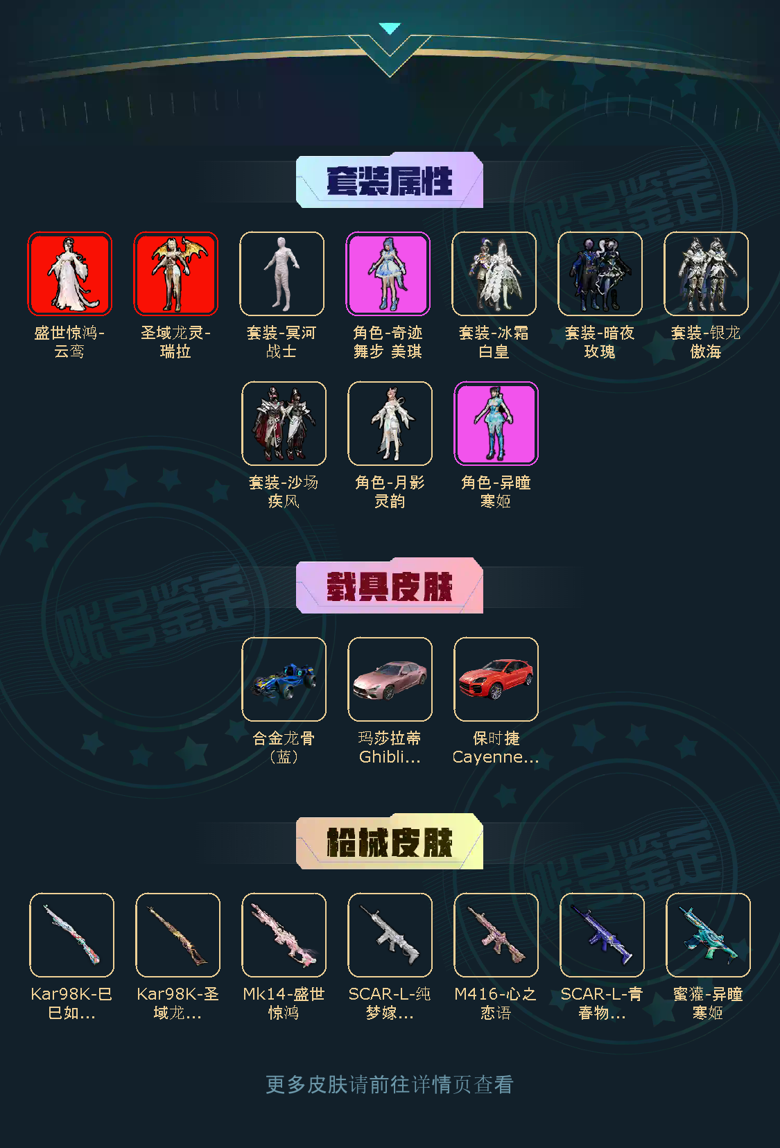 【稀有资产】圣域龙灵-瑞拉[2级]/盛世惊鸿-云鸾[2级]/M416-心之恋语/Mk14-盛世惊鸿/熔岩游骑兵面罩/木乃伊套装/套装-粉红小猪/套装-浪漫天命/套装-雪山精英/套装-暗影哥特/套装-龟仙人/套装-兔兔白日梦/角色-许七安