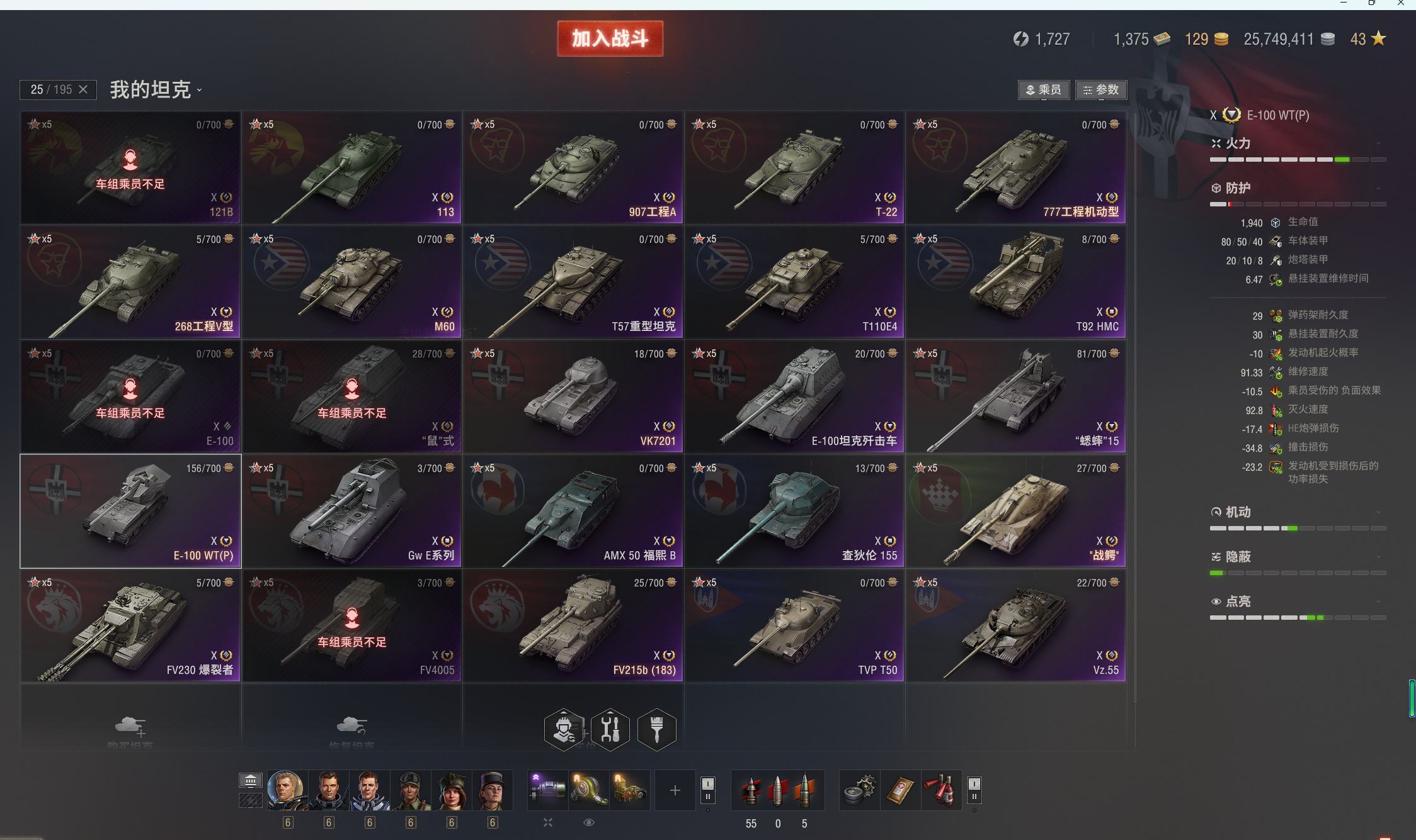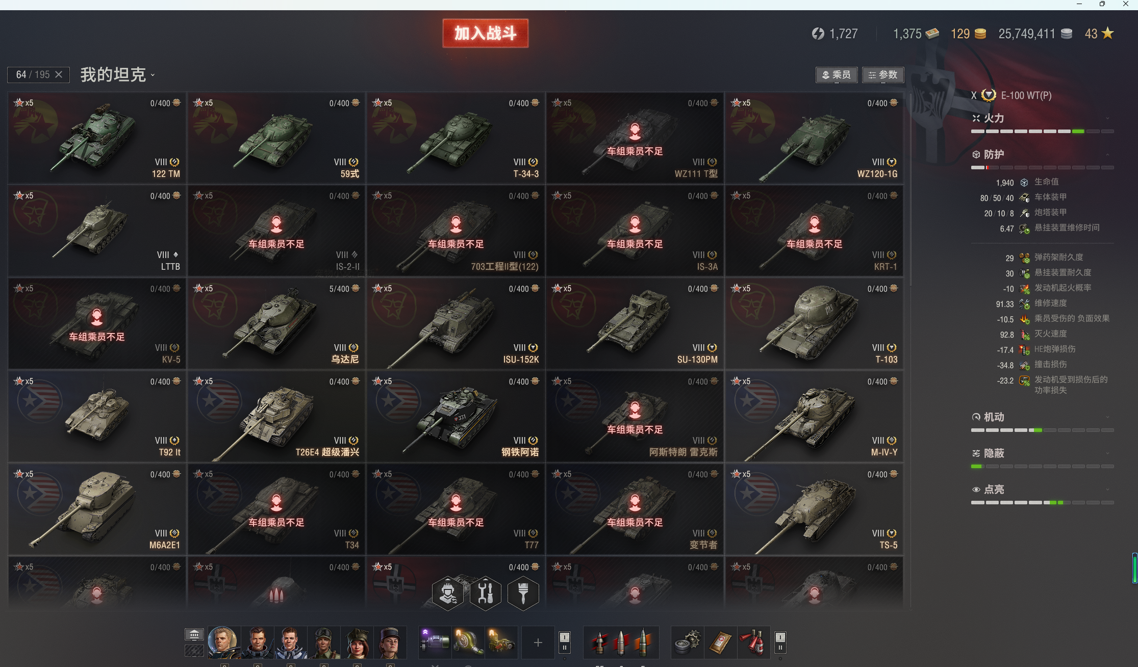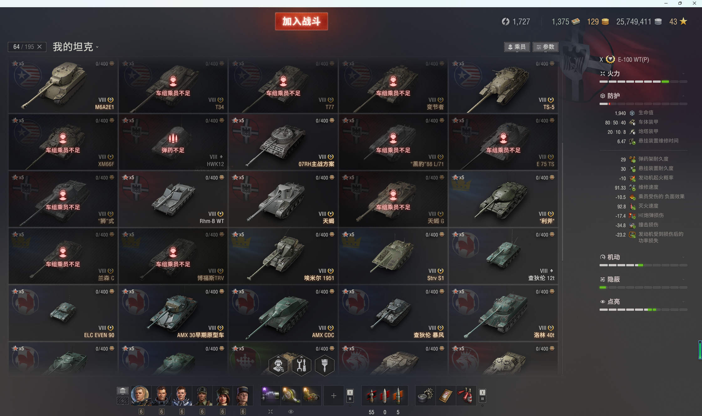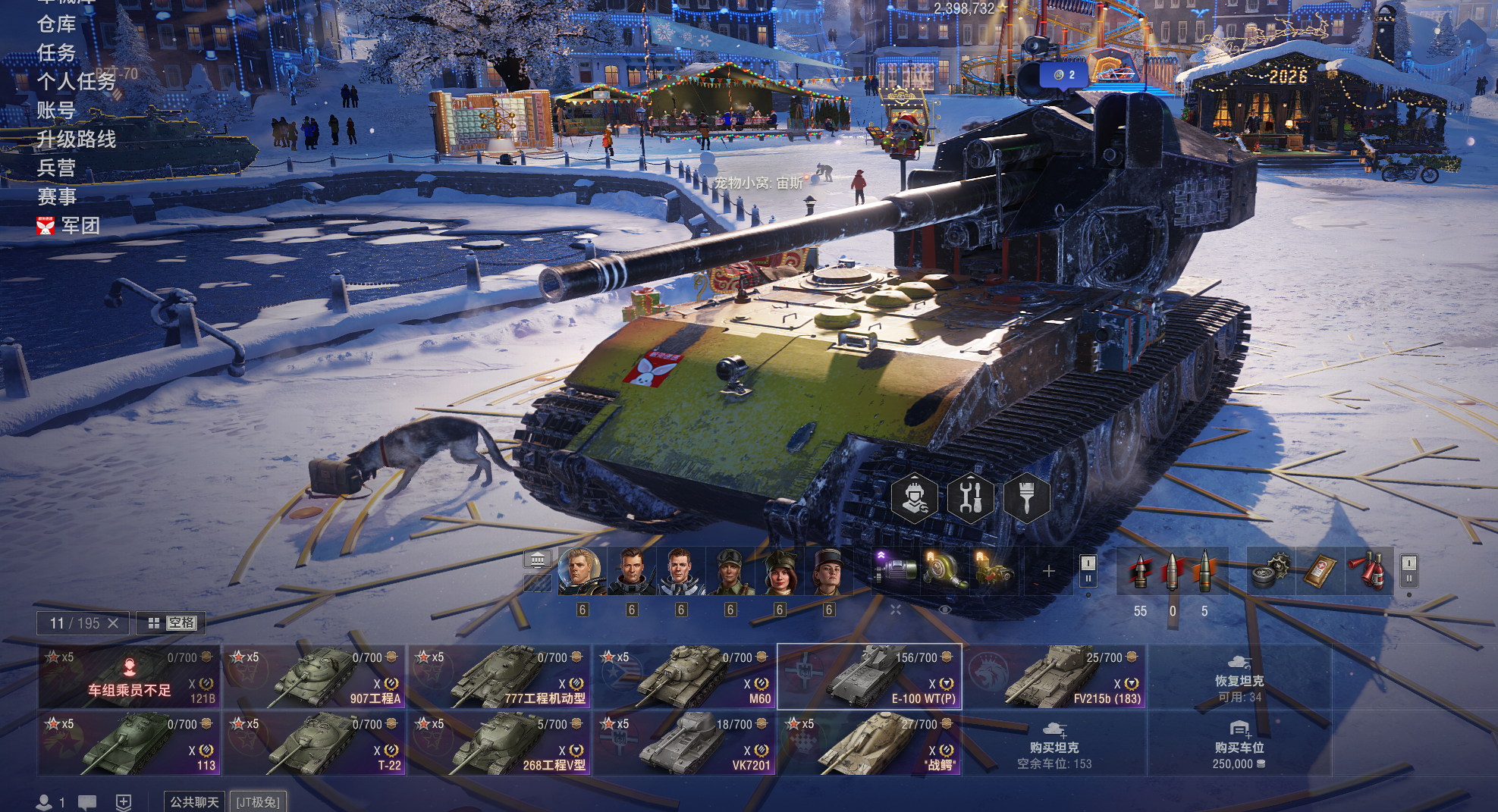 坦克世界出租,圣诞箱子号。11级:囊鼠,鹿角虫,10级金币特种车11台:箱子车战鳄,大白云(E100-WT),907,vk7201,T22,268V型,183,777,M60,121B,113等。10银:4005,大白突等,附带3台10级火炮。9级9台:开箱E90歼击车,路易斯,TBT)752,虎鼠,TL-7重型等。8金57台:最新开箱利斧,等几乎绝大多数强势8金。