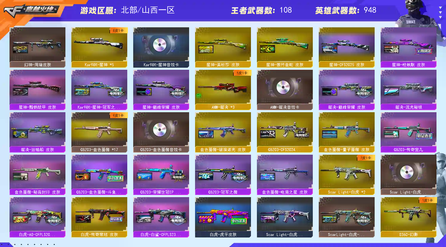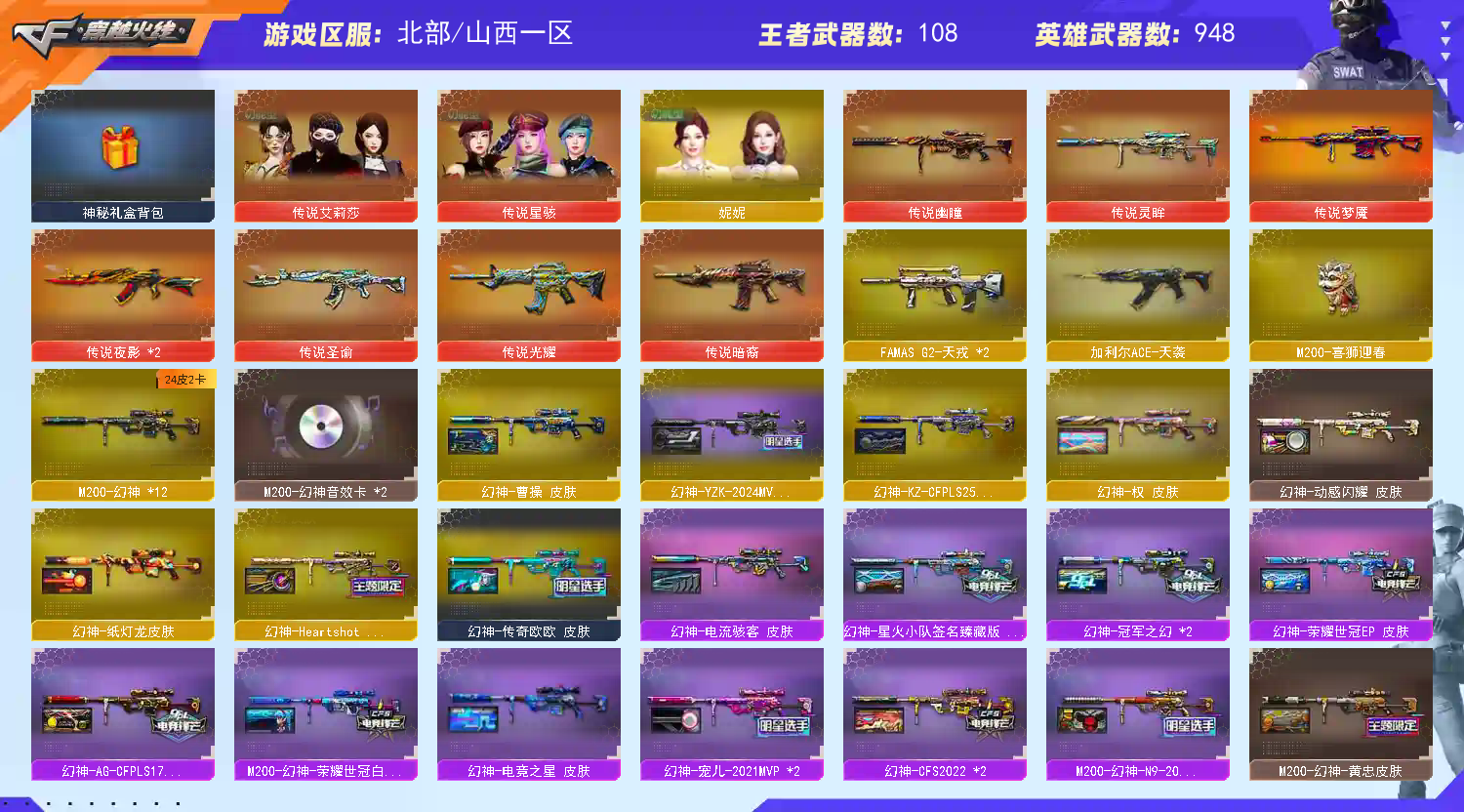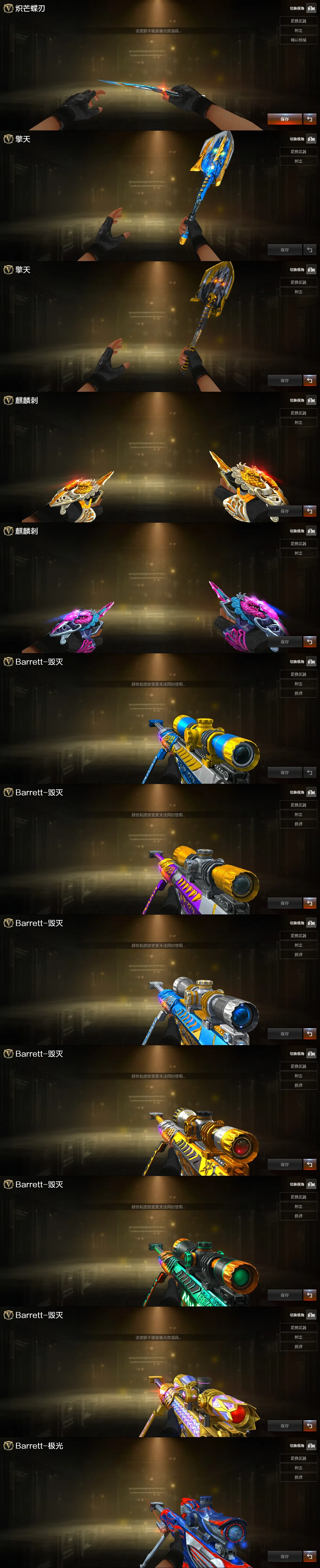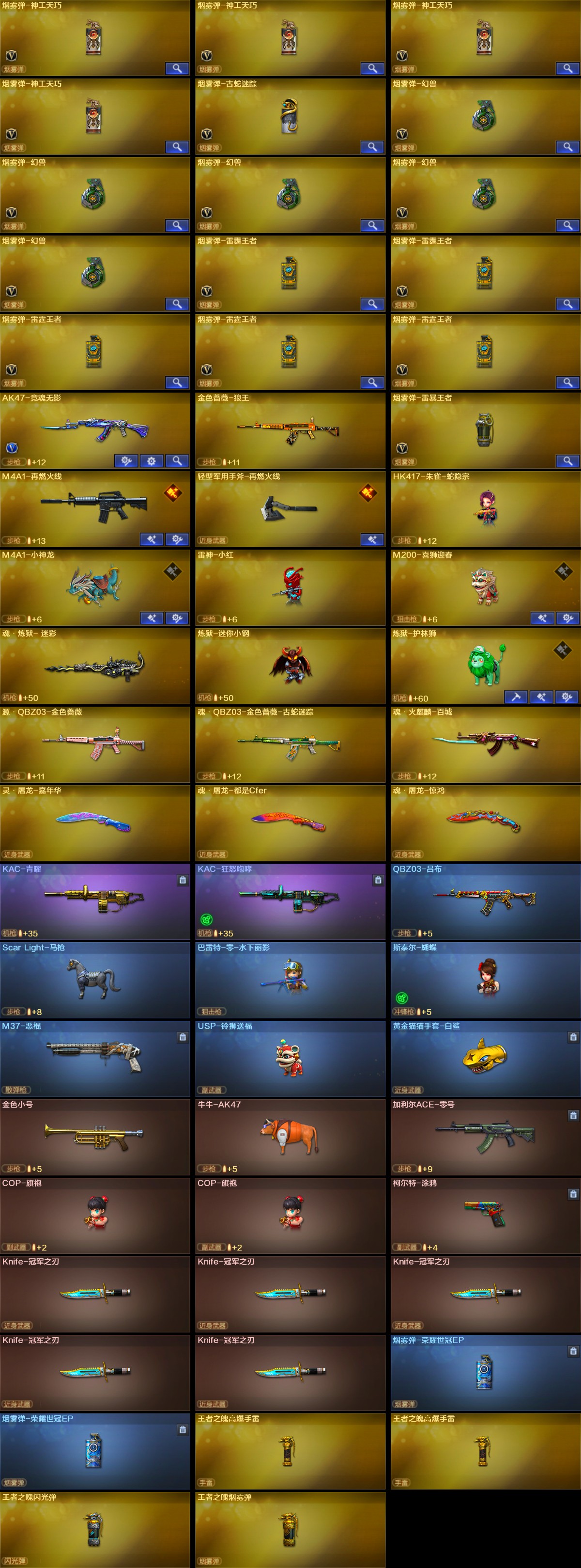 【稀有武器】:传说暗裔/传说夜影(2)/传说梦魇/传说灵眸/传说幽瞳/M200-幻神(12)/Kar98K-星神(5)/G36C-幻影/ScarLight-白虎(2)/M14EBR-玄武/M4A1-青龙/HK417-朱雀(3)/QBZ03-天罚/M4A1-夜魔/M4A1-幻灵/M4A1-神工天巧/M4A1-堕天神(2)/雷霆之契/USP-雷暴/COP-堕天神(4)/破空枪刃-夜魔/COP357-幻灵(6)/柯尔特-竞技荣光(7)/USP-神工天巧/天神-动感闪耀/修罗-古蛇迷踪/破空枪刃/沙鹰-幻兽(5)/荣耀世冠-柯尔特(20)/COP357-雷霆王者-觉醒版(7)/柯尔特-冠军之特/金色蔷薇-古蛇迷踪/QBZ03-金色蔷薇(17)/QBZ95-幻兽/AK47-火麒麟(21)/AK47-麒麟(2)/M4A1-黑龙(13)/M4A1-雷神(21)/M4A1-黑骑士(31)/AK47-无影(7)/AK47-黑武士(7)/荣耀世冠-火麒麟(15)/荣耀世冠-雷神(20)/Barrett-毁灭(10)/Barrett-极光/AWM-裁决(3)/M200-竞技荣光(2)/RPK-盘龙(19)/加特林-炼狱(13)/悦蓝-惊涛骇浪-觉醒版/汤姆逊-烈龙(12)/AA-12-雷霆(2)/炽芒蝶刃(2)/斩神刀-雷暴/麒麟刺-堕天神(5)/龙啸-堕天神(4)/马来剑-夜魔(2)/幻灵之锋(4)/擎天-竞技荣光(15)/唐刀-神工天巧/女皇利刃-幻兽