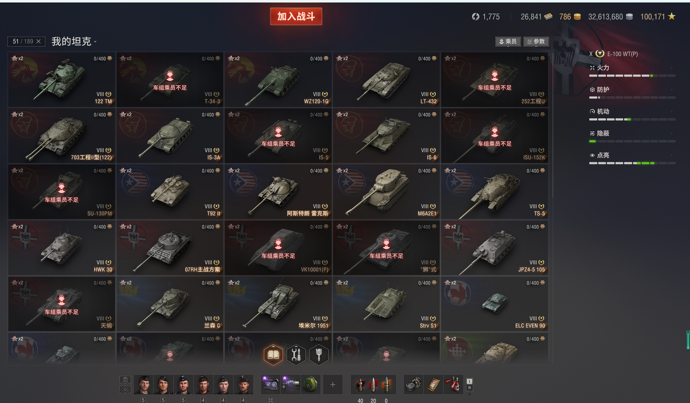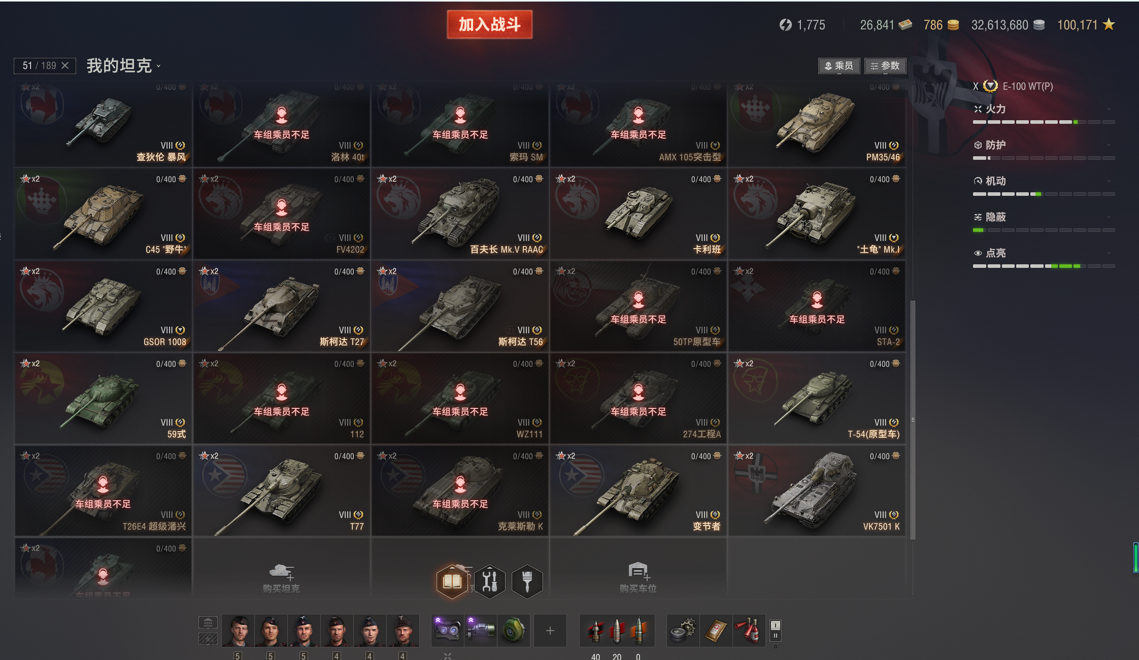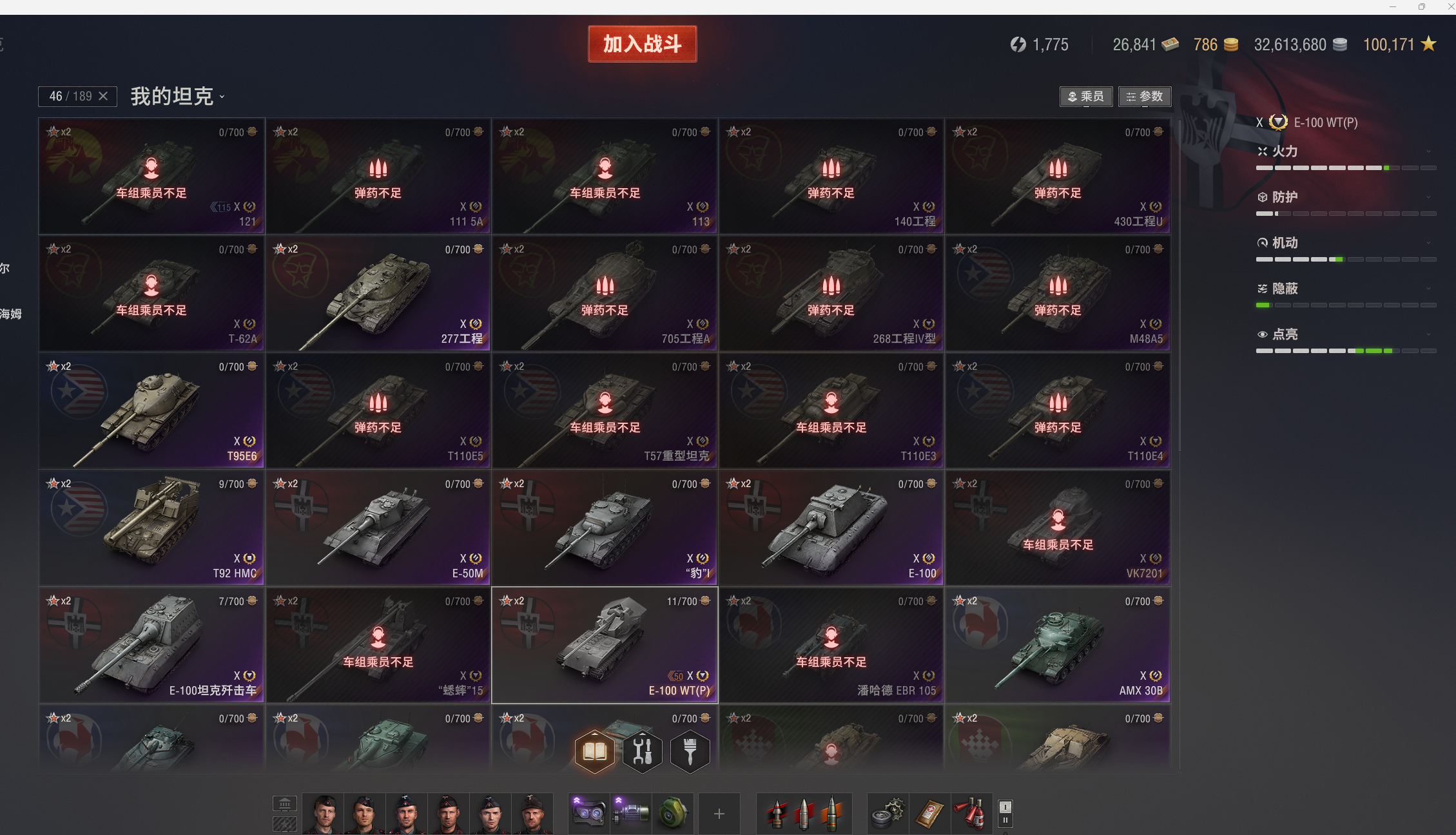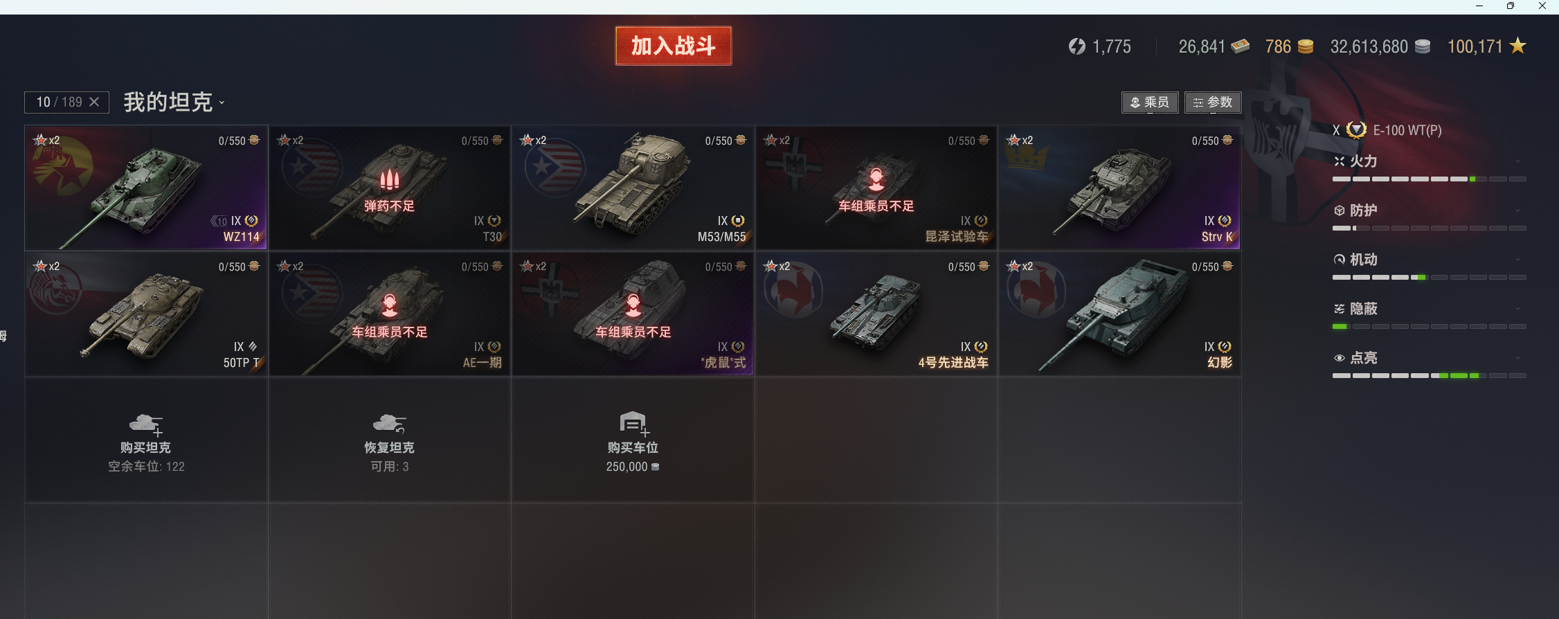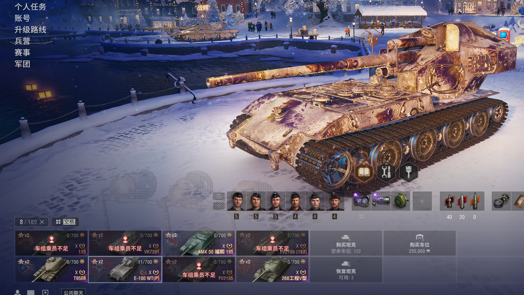 46X出租,白云(E100-WT),VK7201,183,268v型等。3个10级火炮,51台8金。