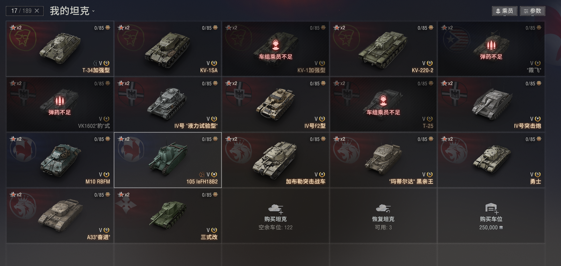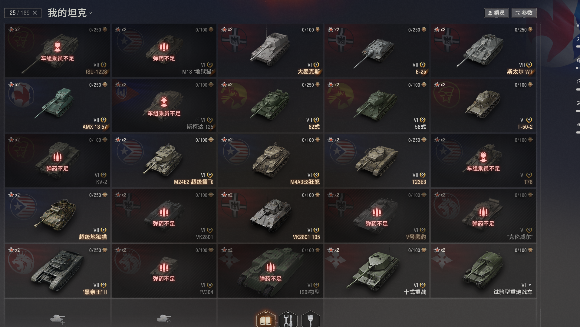 注意事项:1,进入游戏后,如果车辆情况不符。那是因为前面的玩家筛选了自己玩的坦克,其他的隐藏了。坦克显示栏,左下角小坦克标志,点进去把所有系别和级别选上,坦克就全部出来了。