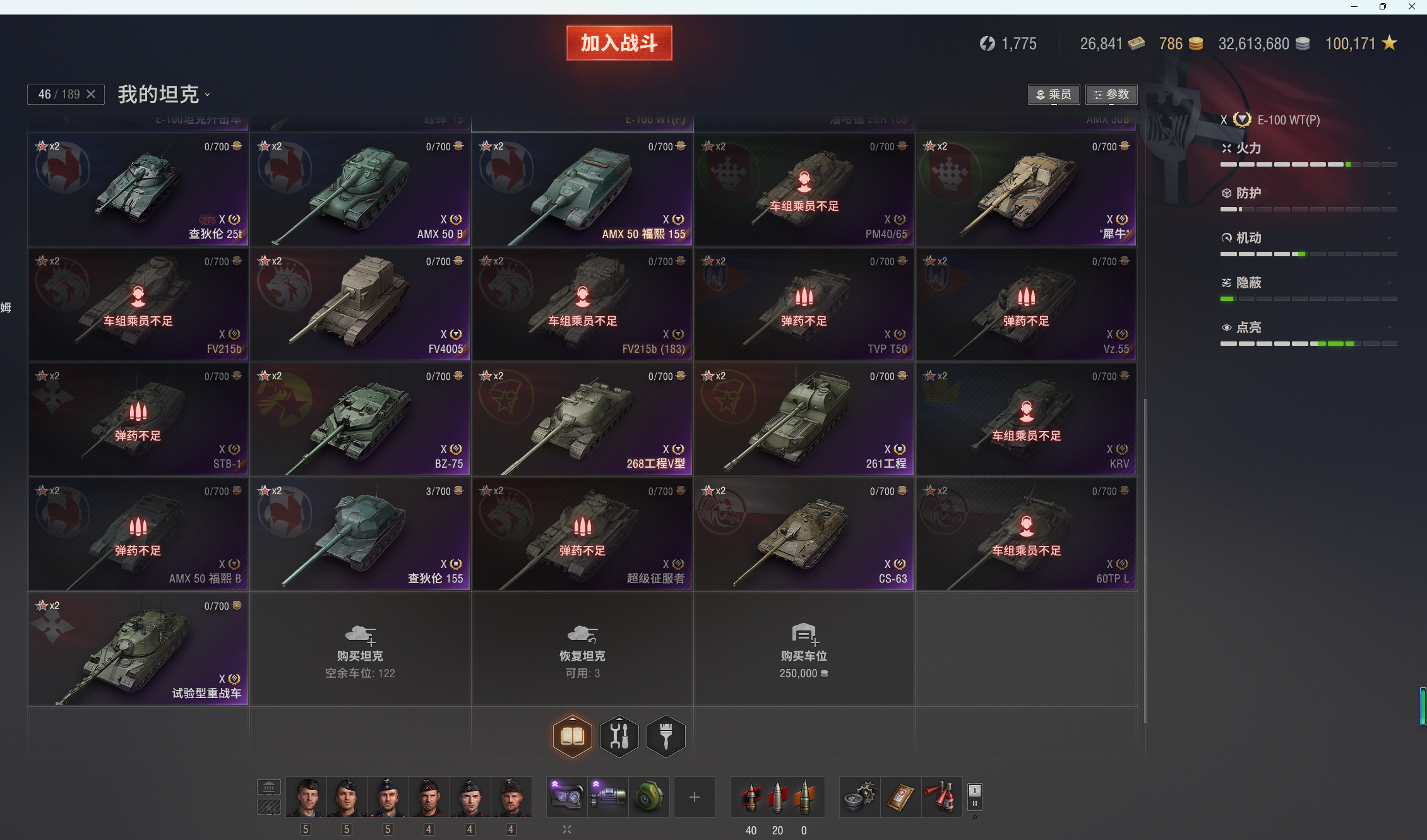 坦克世界46X出租,10金:白云(E100-WT),VK7201,183,268v型,T95e6,113,FV215b等。10银:试验性重战,4005,60tp,犀牛,轮子,3火炮:T92,261,查查火炮等。8金51台。