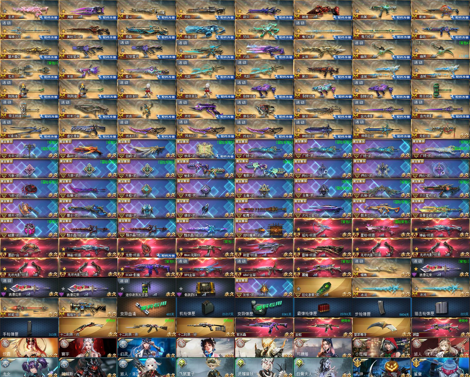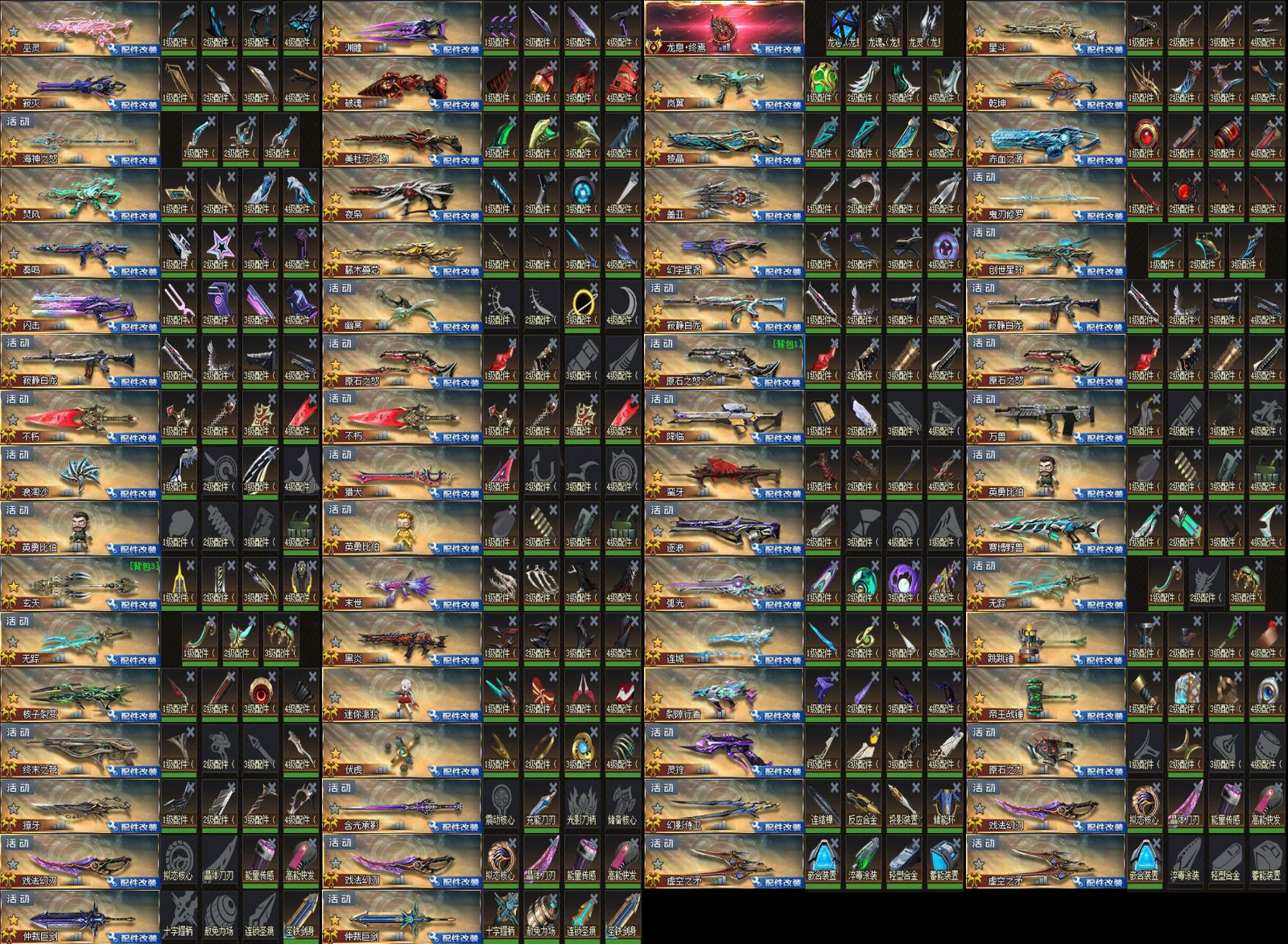 配件武器:猩红◆巫灵◆天际◆寂灭◆破魂◆岚翼◆乾坤◆美杜莎之吻◆棱晶◆赤血之源◆焚风◆鬼刃修罗◆奏鸣◆藤木蔓芯◆创世星环◆幻彩星涡◆闪击◆尘埃◆幽冥◆绝境◆玄天◆末世◆弧光◆黑炎◆连城◆核子裂变◆跳跳锤◆迷你派拉◆裂隙行者◆帝王战锤◆幻彩天虹◆子龙◆伏虎◆尘羽◆轮回之刺◆蛮牙◆炎凰◆夜枭◆盖亚◆骑兵◆赛博野兽◆玄武◆魔杰座◆天引◆陷阵◆空间掌握者◆万兽◆浪淘沙◆逐浪◆凝视◆风暴◆超高智能分析器◆降临◆英雄之刃◆灵狩◆镭射◆獠牙◆原石之怒◆翎羽◆腐化劣魔◆含光承影◆幻影侍卫◆守卫者◆藏锋◆幻锋◆无踪◆终末之弩◆武圣◆猎犬◆英勇比伯◆致远星◆领域◆螳螂臂◆破空◆冬日温情◆裂星◆寂静白龙◆霜雪◆原石之力◆瞬影◆虚空连弩◆