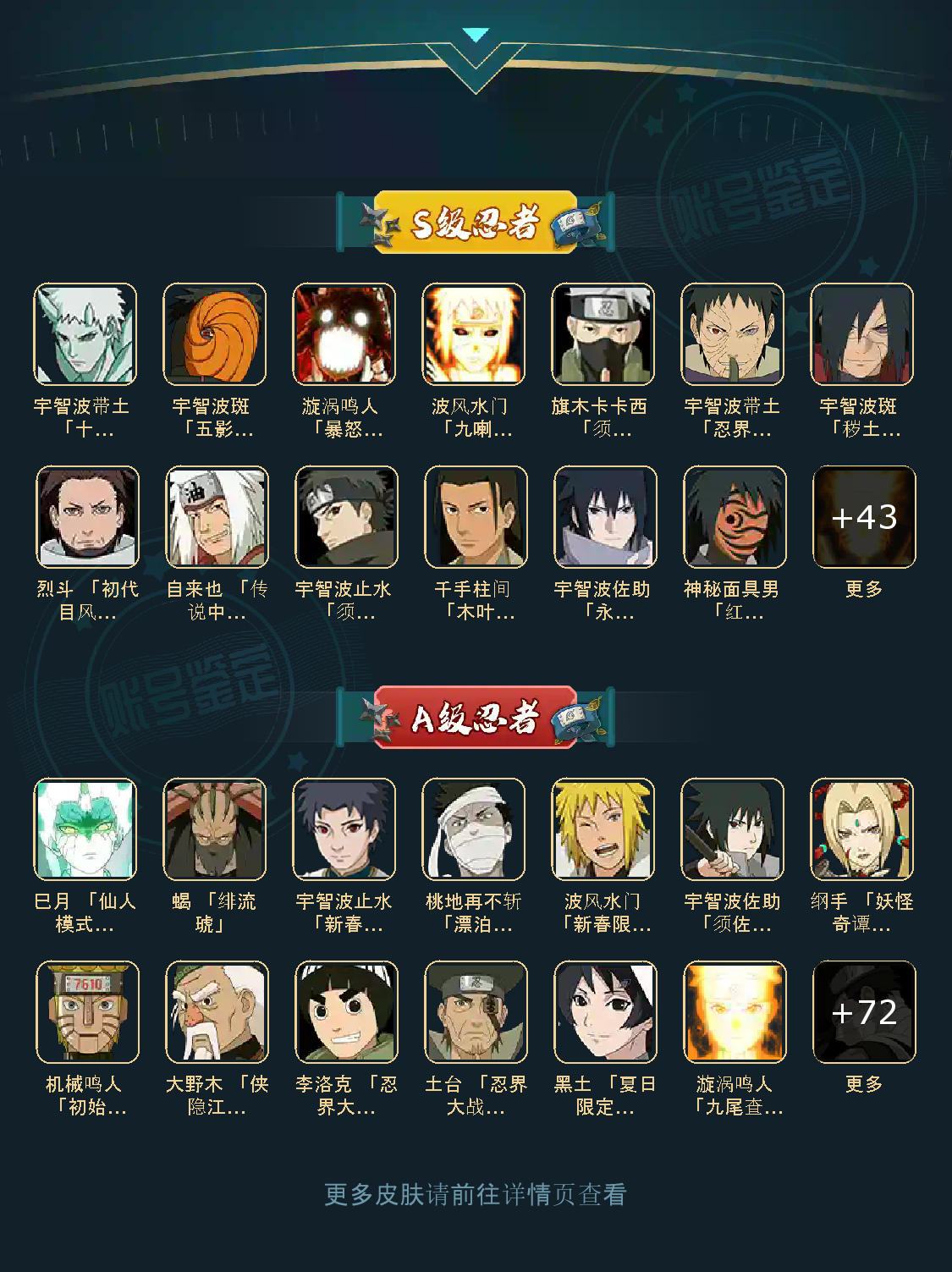 仙人自来也 纲手 波风水门 百战水门 猿飞日斩 千手柱间 宇智波斑 宇智波鼬 舞之自来也 大蛇丸 百战大蛇 秽土四代 秽土三代 秽土长门 仙人兜 黄猿九喇嘛鸣人 紫狗永恒佐助 樱婊忍战樱 秽土鼬 普通自来也 百豪纲手 死门凯 二代扉间 秽土二代 秽土初代 秽土柱间 白面具 须佐卡卡西 小胡子鬼灯幻月 雷影 土影 无 佩恩 百战佩恩 青年柱间 创立初代 秽土斑 青年斑 解斑 须佐止水 虎皮 破面带土 红夜带土 罗砂 秽土三代风影 忍战雷影 三代雷影 金角银角 秽土半藏 忍战大野木 小土豆 天道超 大筒木桃式 大筒木金式 钢铁之躯凯 桀骜之刃阿斯玛 狂野之鲨鬼鲛 飞段 黑飞段 百豪樱 忍战李 大卡卡西 五代水影照美冥 宇智波鼬 仙鸣 九尾查克拉鸣人 鹰佐 奇拉比 青年艾 半蛇兜 晓蛇 新春鼬 面麻 须佐佐助 疾风咒印佐助 忍战宁次 忍战天天 最终章雏田 幻容卡卡西 神卡 忍战卡卡西 泳装卡卡西 忍战凯 青春哥 惊门凯 爱情哥 新春止水 新春水门 青年水门 青水 新春我爱罗 泳装照美冥 侠隐照美冥 侠隐纲手 侠隐兜 漂泊再不斩 漂泊佩恩 漂泊二代 漂泊小南 漂泊佩恩 三船 青年三船 青年长门 泳装南 新春南 黑绝 新春大蛇丸 晓创生角度 晓创生蝎 晓创生飞段 泳装鼬 鲛肌融合鬼鲛 新春迪达拉 秽土迪达拉 恶灵之影飞段 暴怒带土 忍战黄土 卑留呼 桃博 黑土