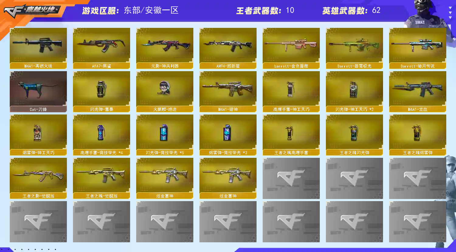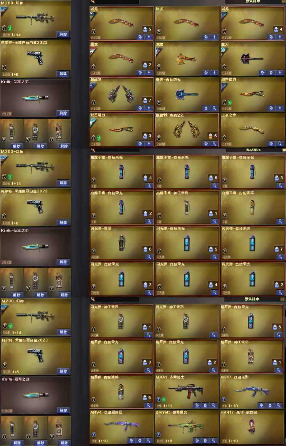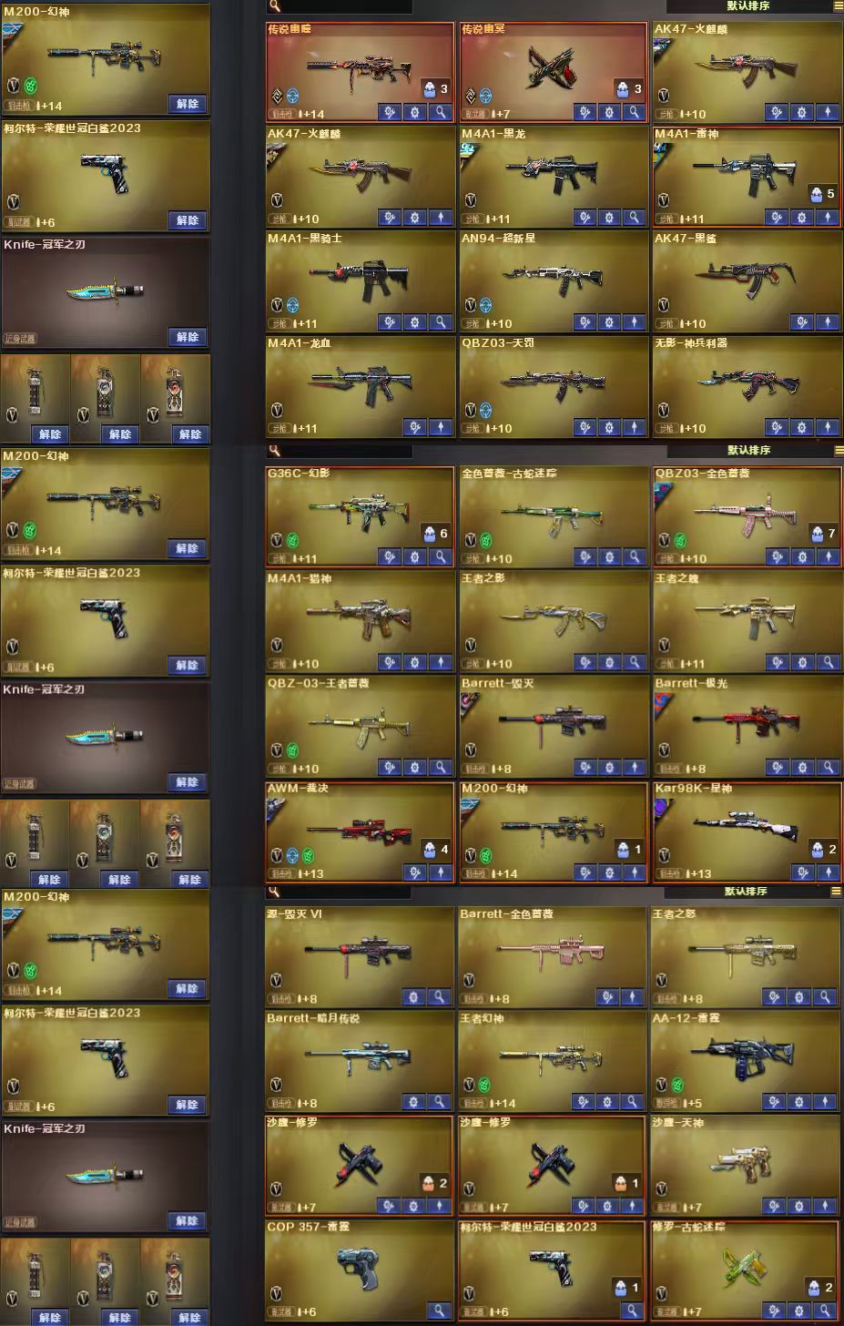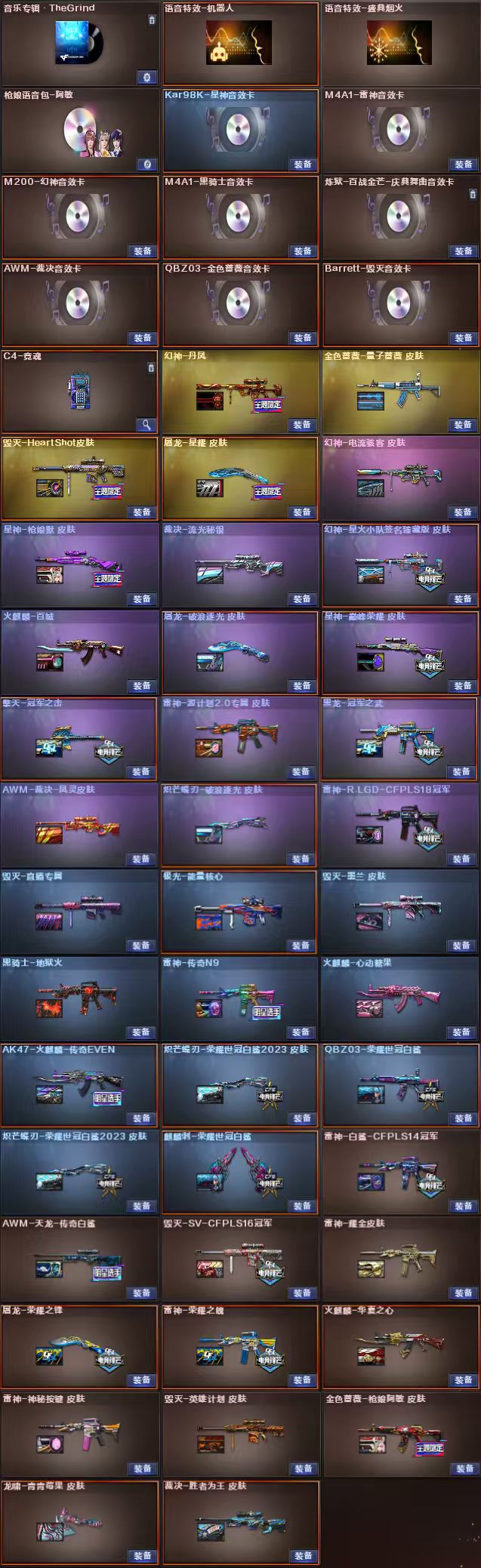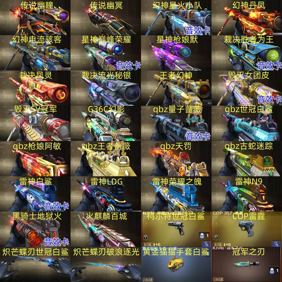 传说幽瞳/传说幽冥/幻神星火小队+丹凤+电流骇客+幻神音效卡/星神巅峰荣耀+枪娘默+星神音效卡/裁决胜者为王+凤灵+流光秘银+裁决音效卡/王者幻神/毁灭女团皮+SV+毁灭音效卡/G36C幻影/qbz量子蔷薇+世冠白鲨+枪娘阿敏+qbz金色蔷薇音效卡/qbz天罚/qbz古蛇迷踪/白虎迷你小艾/雷神白鲨+LDG+荣耀之魄+N9+雷神音效卡/黑骑士地狱火+黑骑士音效卡/火麒麟百城/柯尔特世冠白鲨/COP雷霆/炽芒蝶刃世冠白鲨+破浪逐光/黄金猫猫手套白鲨/冠军之刃/4防月兔特工/4防王者凌霄/4防暗夜审判/3防晴雅/