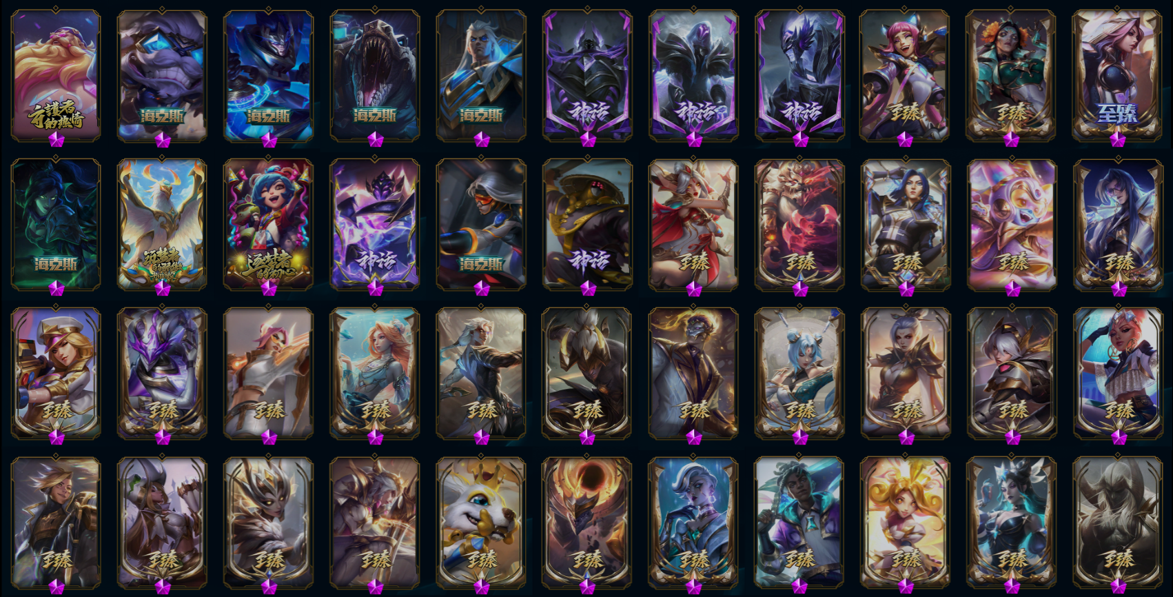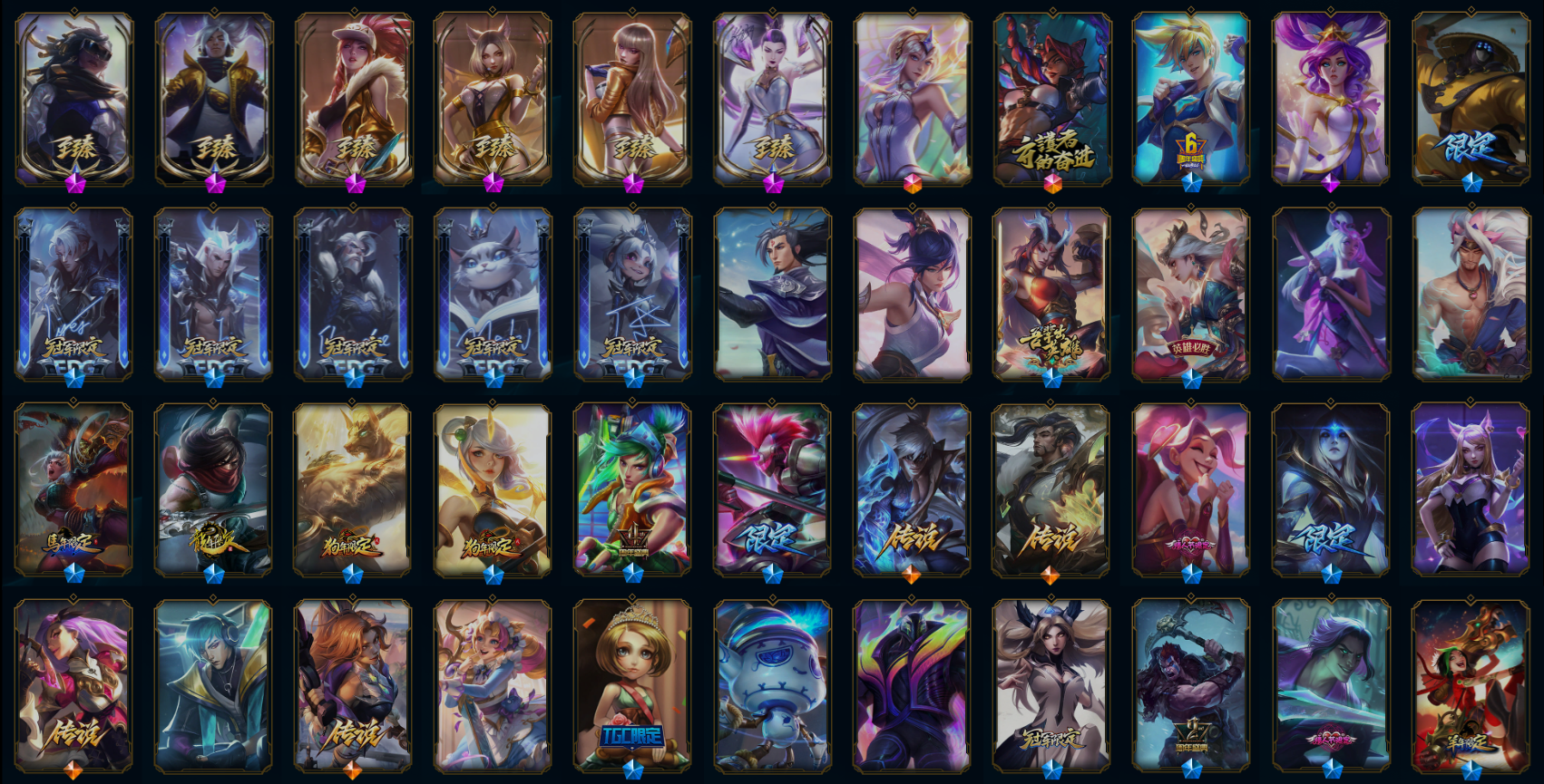 【传说皮肤】星之守护者洛 幻灵战斗队长厄运小姐 魔女伊芙琳 西部魔影卢锡安 铁哥们儿奥拉夫 红色男爵库奇 偶像歌手阿狸 合金巨兽努努和威朗普 奥德赛凯隐 真实伤害艾克 绅士科加斯 黯晶凤凰艾尼维亚 女皇艾希 死亡骑士盖伦 鬼魂新娘莫甘娜 冰霜之刃艾瑞莉娅 战斗学院伊泽瑞尔 上古战魂魔腾 黯黑魔龙希瓦娜 星之守护者金克丝 战场女武神凯尔 黑夜使者亚索 律政大亨蒙多 大天使长米迦勒凯尔 地狱行者孙悟空 冰霜亚龙希瓦娜 女主播迦娜 神拳李青 源计划联合艾希 月蚀骑士蕾欧娜 邪鸦魅影乐芙兰 最终BOSS维迦 提莫约德尔人的一大步 宇航员诺提勒斯 星之守护者拉克丝 战地巨兽科加斯 陆地王者4WD布里茨 天煞劫 血石领主弗拉基米尔 金牌主播德莱文 冰川巨兽墨菲特 约德尔国队长提莫 焰尾妖狐阿狸 恶魔男爵瑞兹 女帝卡特琳娜 霸天零式赛恩 黎明使者锐雯 第三类接触黑默丁格 暗星尊烬 泳池派对吉格斯 银河魔装机神兰博 符文战熊沃利贝尔 星之守护者霞 女警狙击凯特琳 苍穹之光韦鲁斯 西部天使艾希 烈焰雄心崔丝塔娜 暗星女王拉克丝 日蚀骑士蕾欧娜 地狱之门卫士加里奥 源计划毁灭派克 钢铁之翼凯尔 钢铁军团盖伦 屠龙勇士潘森 神龙尊者圣龙李青 枯萎之壤泽拉斯 灌篮高手德莱厄斯 驯龙学者黑默丁格 源计划净化薇恩 霸天异形卡兹克 腥红之月鬼武姬阿卡丽 双重冰晶艾尼维亚 源计划超体莫德凯撒 恶魔之刃泰达米尔 电玩女神娑娜 黎明使者永恩 神龙尊者昼日真龙亚索 战地机甲厄加特 炼狱魔犬内瑟斯 丧尸布兰德 神王盖伦 神王德莱厄斯 耀星女神拉克丝 蔷薇绅士杰斯 至尊魔女莫甘娜