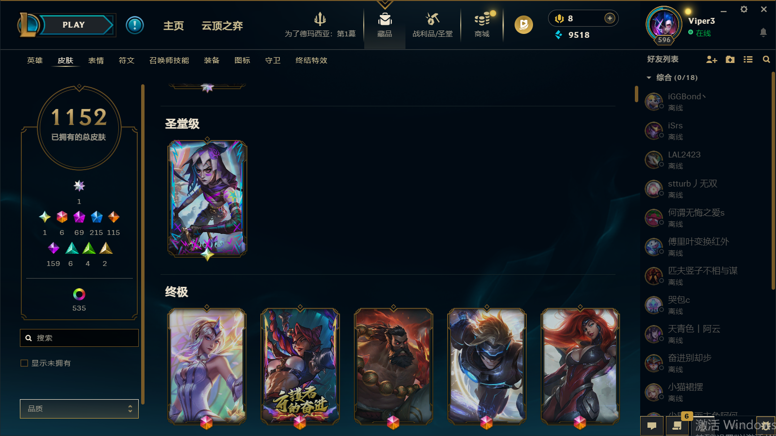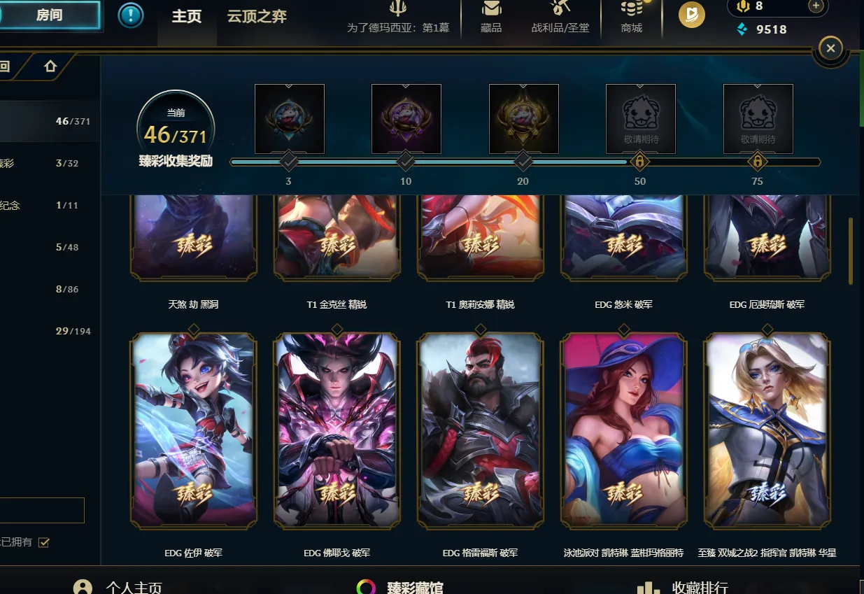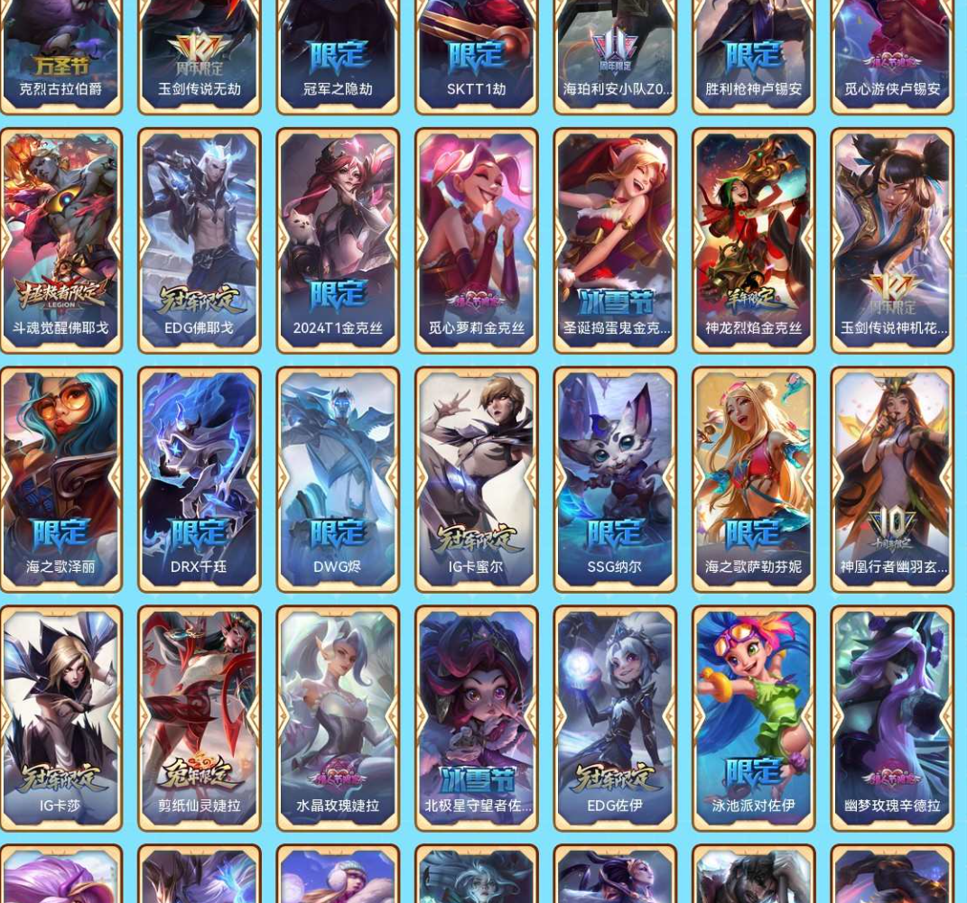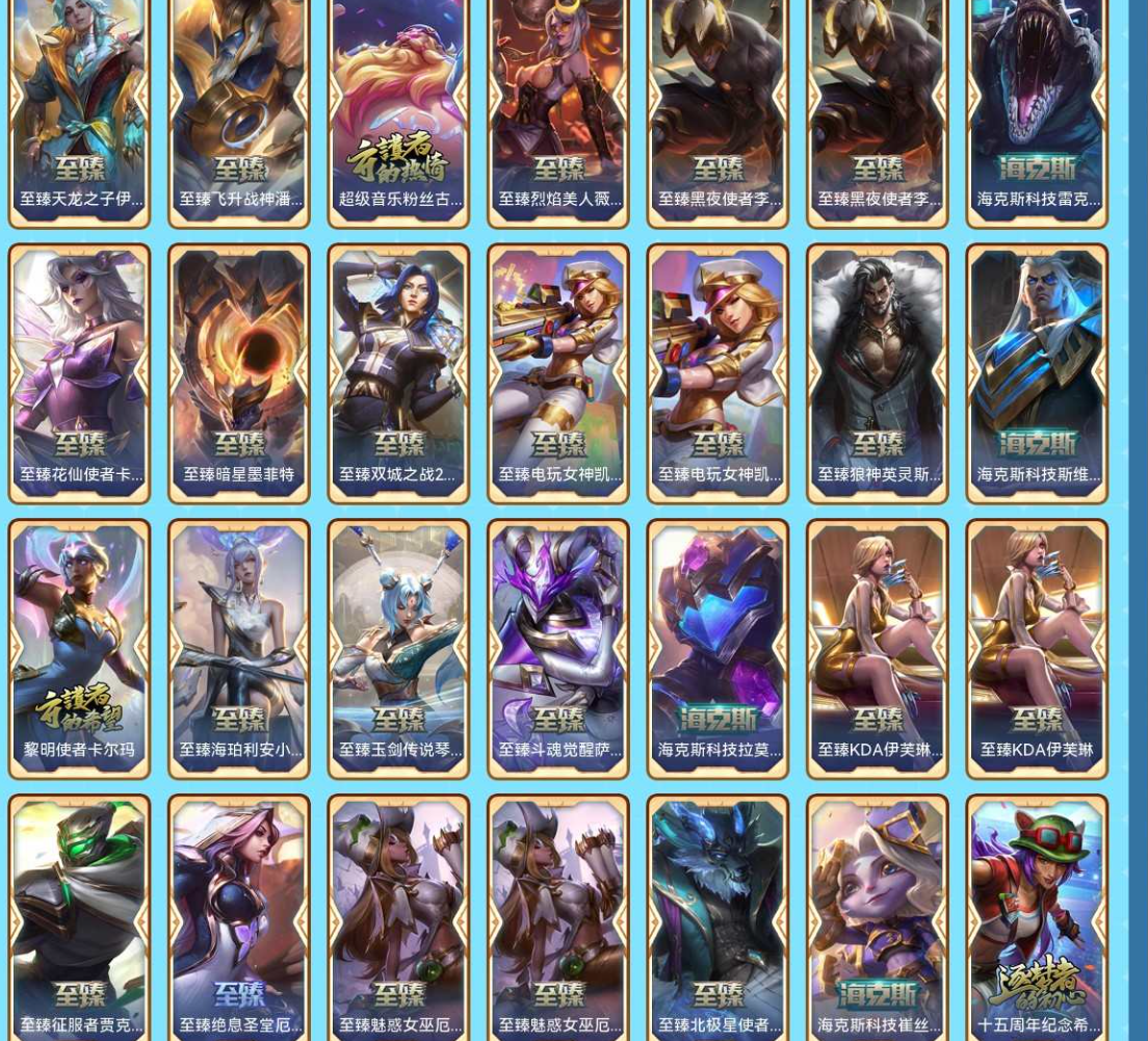 艾欧尼亚|1763皮|69神话|殿堂阿里|圣堂金克丝|EDG破军套|斗魂莲花套|云顶七神话|男女刀