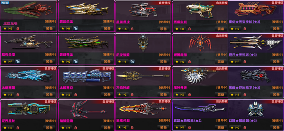 3.更新:紫钻武器使用券!天巡1,2,,怀旧三件套金红双蝎黑龙炮斧头!已去黑雾!赛季11到21赛季武器(第17赛季为期限);强化基本全满,配件武器最少5阶,少数6阶!