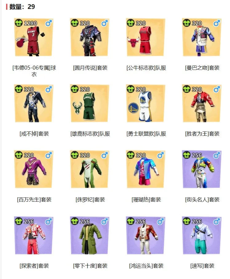 韦德专属球衣 圆月传说套装/头套/背饰 曼巴之吻套装/背包 戒不掉套装 胜者为王套装 百万先生套装 侏罗纪套装 派对两周年背包 烈焰骑士手套