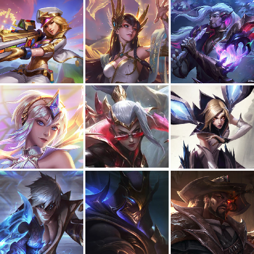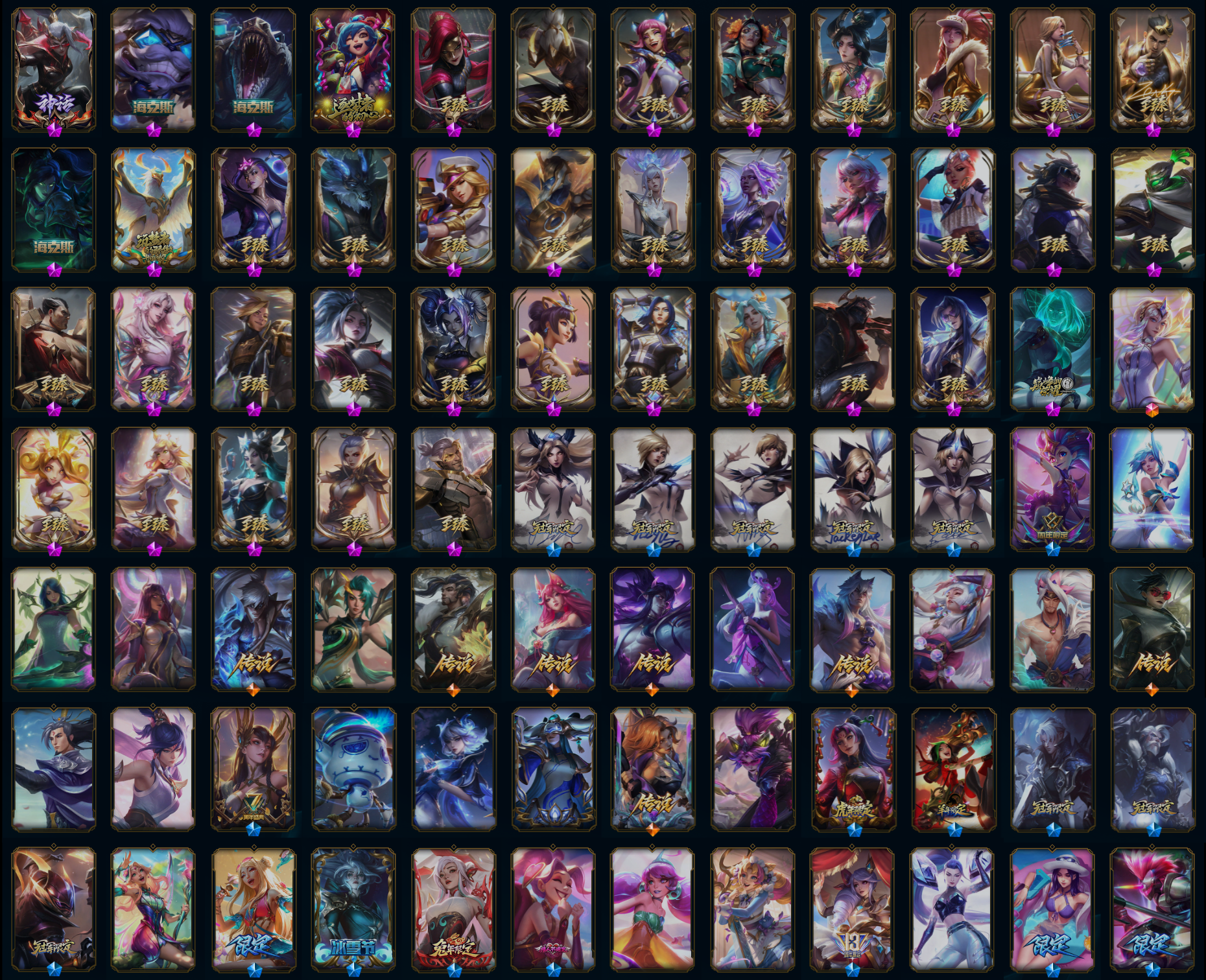 【重要皮肤】灵魂莲华拉克丝至臻 战斗学院奇亚娜至臻 凯旋将军德莱厄斯至臻 剪纸仙灵卡西奥佩娅至臻 黑色玫瑰假面舞会卡特琳娜至臻 双城之战2指挥官凯特琳至臻 暗星女王黛安娜至臻 魔域梦魇泽丽至臻 T1杰斯至臻 天龙之子伊泽瑞尔至臻 心之钢永恩至臻 魔女阿卡丽至臻 魂蔷薇烈娜塔至臻 北极星使者沃里克至臻 海珀利安小队X09星环灵风迦娜至臻 星之守护者辛德拉至臻 西部魔影猎天使恶魔泰隆至臻 月蚀骑士赛娜至臻 幻灵战斗猫金克丝至臻 青花瓷拉克丝至臻 真实伤害赛娜至臻 星之守护者索拉卡至臻 灵能特工伊泽瑞尔至臻 源计划逆流塞拉斯至臻 征服者贾克斯至臻 飞升战神潘森至臻 KDA伊芙琳至臻 KDA阿卡丽至臻 电玩女神凯特琳至臻 星之守护者妮蔻至臻 真实伤害奇亚娜至臻 玉剑传说武剑仙至臻 黑夜使者李青至臻 殿堂传奇薇恩 海克斯科技安妮 海克斯科技雷克顿 海克斯科技吉格斯 海克斯科技阿木木 摄魂使者薇恩 胜利剑圣易 胜利女神娑娜 胜利之王泰达米尔 胜利巨口克格莫 荣誉使者玛尔扎哈 电玩女神阿狸 玉剑传说舞剑仙 海珀利安小队Y03权天使卡蜜尔 女帝格温 玉剑传说无劫 星之守护者佐伊 点心宝贝阿木木 天龙之子斯莫德 剪纸仙灵艾瑞莉娅 烈焰仙子黛安娜 神龙烈焰金克丝 玉净夜叉凯特琳 虎痴之拳蔚 胜利枪神卢锡安 胜利之剑亚托克斯 怦然心动凯特琳 觅心游侠卢锡安 觅心之翼奎因 觅心萝莉金克丝 北极星神黛安娜 冬季仙境奥莉安娜 平安夜女神娑娜 圣诞糖果棒厄运小姐 魅惑女巫崔丝塔娜 海之歌萨勒芬妮 泳池派对凯特琳 泳池派对嘉文四世 泳池派对厄运小姐 电玩战魂赫卡里姆 EDG厄斐琉斯 EDG格雷福斯 FPX李青 iG卡蜜尔 iG洛 iG卡莎 iG艾瑞莉娅 iG乐芙兰 iG菲奥娜 SSG纳尔 SKTT1扎克 SKTT1伊莉丝 SSW雷恩加尔 SSW图奇 SSW辛吉德 暗杀星奥莉安娜 暗杀星蒙多 Fnatic迦娜 冰雪节辛吉德 冰雪兽纳尔 防暴天使凯尔 冠军典狱长锤石 冠军蔷薇乐芙兰 冠军之刃锐雯 冠军之刃锐雯2016 冠军之血希瓦娜 春晖神女奇亚娜 胡桃夹子萨科 警用试作体K9内瑟斯 圣诞精灵崔丝塔娜 圣诞狂欢基兰 圣诞狂欢努努和威朗普 圣诞老人古拉加斯 圣诞驯鹿克格莫 糖果使徒费德提克 喜庆之树茂凯 野兽猎人德莱文 勇者阿狸 勇者奈德丽 征服者阿利斯塔 暗影沃里克 冠军之箭艾希 阿木木主人不要我了 波比的巧克力工坊 都铎王朝图奇 十五周年纪念希维尔 十周年纪念安妮 源代码乐芙兰 神凰行者瑞羽圣凰艾尼维亚 胜利凤凰艾尼维亚 暗裔英雄盖伦 大元素使拉克丝 灵魂守卫乌迪尔
