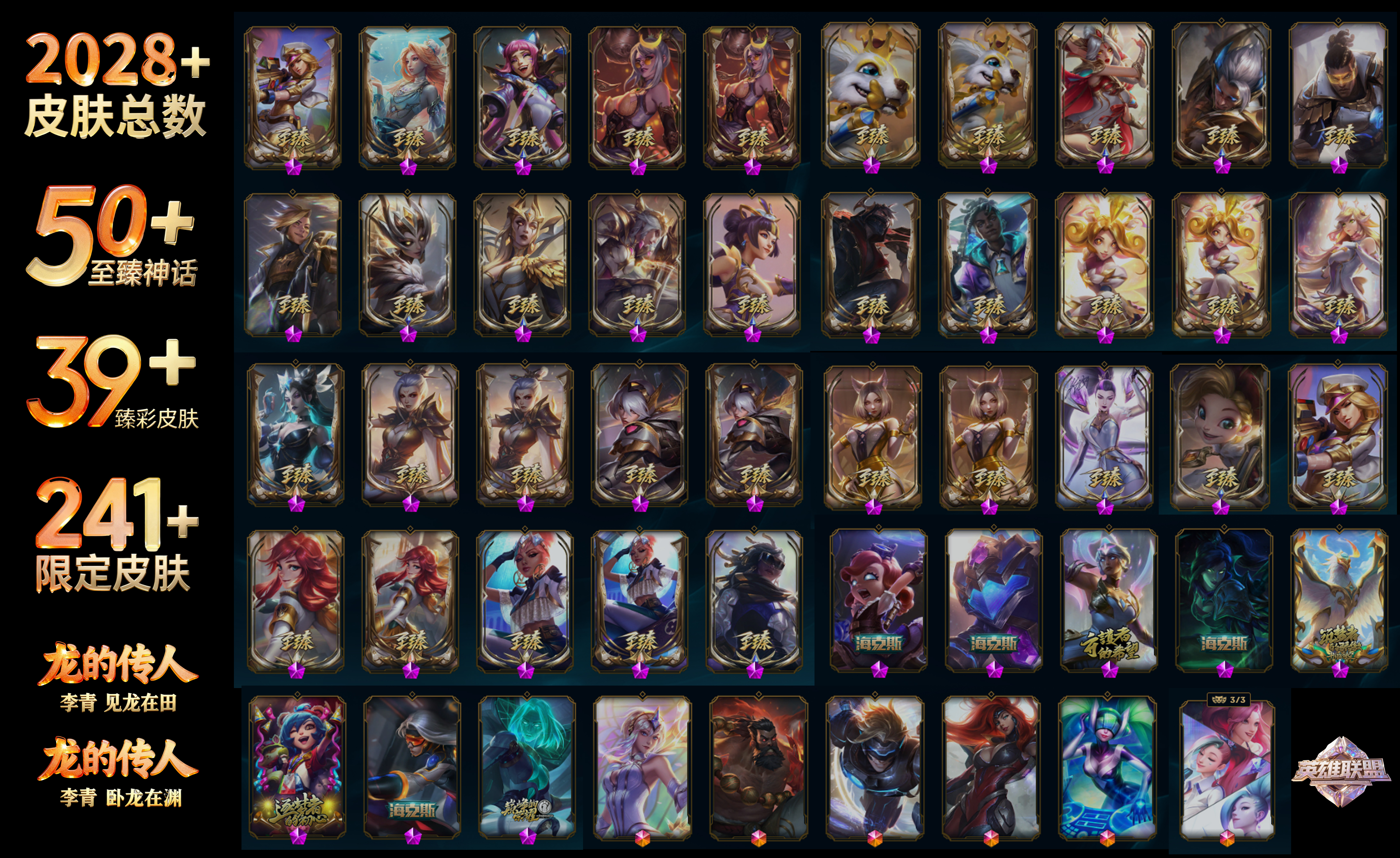 传说皮肤 大天使长米迦勒凯尔、陆地王者4WD布里茨、魔幻卡牌崔斯特、泳池派对吉格斯、战场女武神凯尔、黯黑魔龙希瓦娜、黯晶凤凰艾尼维亚、暗星锤石、暗星女王拉克丝、暗星尊烬、奥德赛凯隐、霸天零式赛恩、霸天异形卡兹克、冰川巨兽墨菲特、冰霜亚龙希瓦娜、冰霜之刃艾瑞莉娅、苍穹之光韦鲁斯、电玩女神娑娜、第三类接触黑默丁格、地狱行者孙悟空、地狱之门卫士加里奥、恶魔男爵瑞兹、恶魔之刃泰达米尔、符文战熊沃利贝尔、钢铁军团盖伦、钢铁之翼凯尔、光明哨兵薇恩、灌篮高手德莱厄斯、鬼魂新娘莫甘娜、黑夜使者索拉卡、黑夜使者亚索、合金巨兽努努和威朗普、红色男爵库奇、金牌主播德莱文、枯萎之壤泽拉斯、炼狱魔犬内瑟斯、烈焰雄心崔丝塔娜、黎明使者锐雯、黎明使者索拉卡、灵魂莲华阿狸、灵魂莲华瑟提、律政大亨蒙多、魔女伊芙琳、女帝卡特琳娜、女皇艾希、女警狙击凯特琳、女校长菲奥娜、女主播迦娜、欧米伽小队幽灵特工、偶像歌手阿狸、苹果机器人布里茨、蔷薇绅士杰斯、青花瓷伊泽瑞尔、日蚀骑士蕾欧娜、丧尸布兰德、上古战魂魔腾、神龙尊者圣龙李青、神拳李青、绅士科加斯、神王德莱厄斯、神王盖伦、双重冰晶艾尼维亚、死亡骑士盖伦、天煞劫、铁哥们儿奥拉夫、提莫约德尔人的一大步、屠龙勇士潘森、未来战士凯特琳、西部魔影卢锡安、西部天使艾希、西部天使赛娜、邪鸦魅影乐芙兰、腥红之月鬼武姬阿卡丽、星之守护者阿狸、星之守护者金克丝、星之守护者拉克丝、星之守护者洛、星之守护者霞、血石领主弗拉基米尔、驯龙炮手崔丝塔娜、驯龙学者黑默丁格、焰尾妖狐阿狸、耀星女神拉克丝、银河魔装机神兰博、源计划毁灭派克、源计划净化薇恩、源计划联合艾希、源计划林易、约德尔国队长提莫、月蚀骑士蕾欧娜、宇航员诺提勒斯、战地机甲厄加特、战地巨兽科加斯、战斗学院凯特琳、战斗学院伊泽瑞尔、真实伤害艾克、至尊魔女莫甘娜、最终BOSS维迦