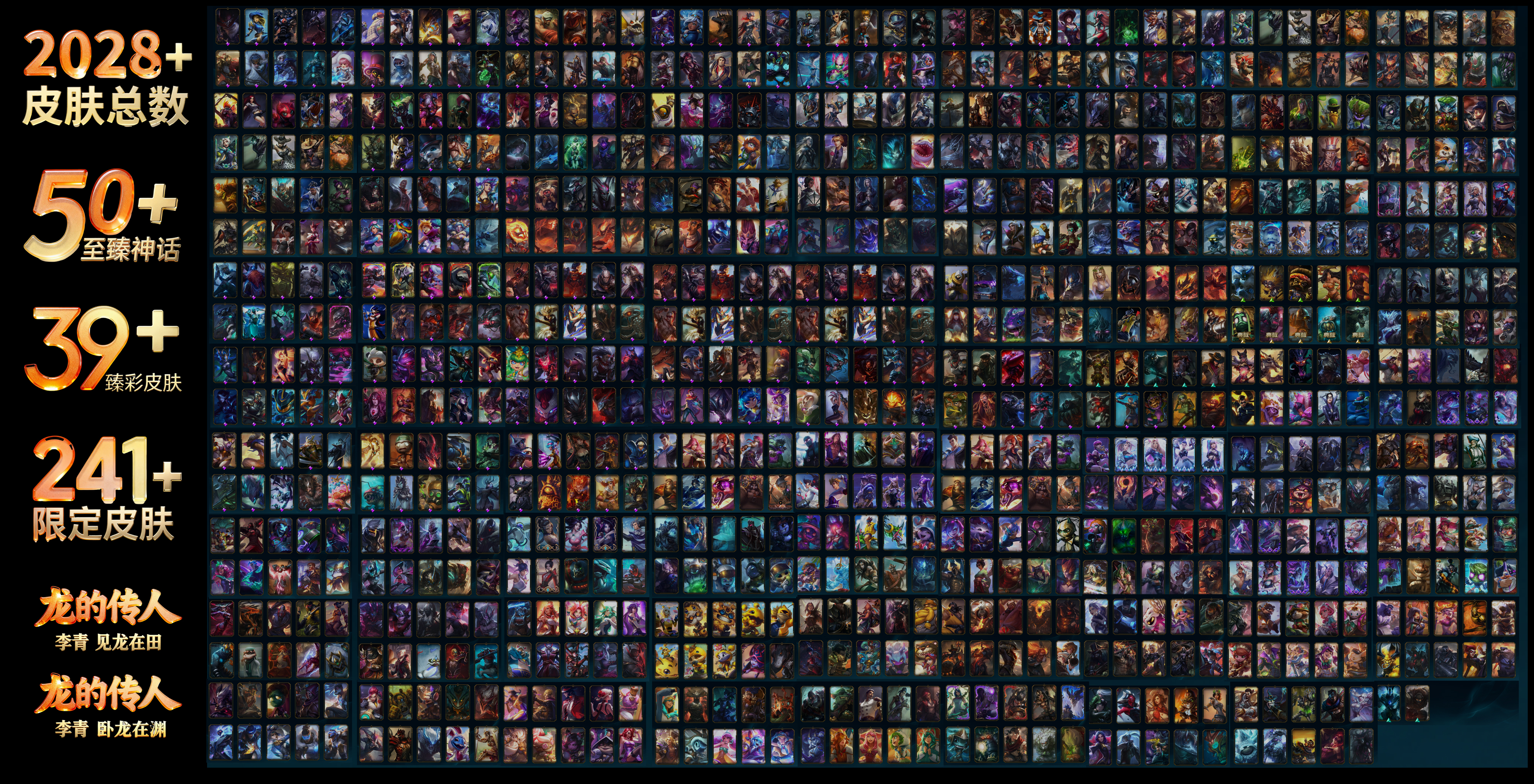 年限皮肤 龙的传人李青、神龙烈焰金克丝、你看见过我的熊猫吗安妮、神龙之翼库奇、春晖神女拉克丝、广寒仙子嫦娥、紫金罗刹莫甘娜、替父从军花木兰、玉净夜叉凯特琳、碧玉之牙卡西奥佩娅、虎痴之拳蔚、司马懿仲达、张辽文远、南天之怒沃里克、美猴王孙悟空、烈焰美人薇恩、金猪烈焰瑟庄妮、北辰之威内瑟斯、福牛守护者嘉文四世、纳财大帝塔姆、点心宝贝阿木木