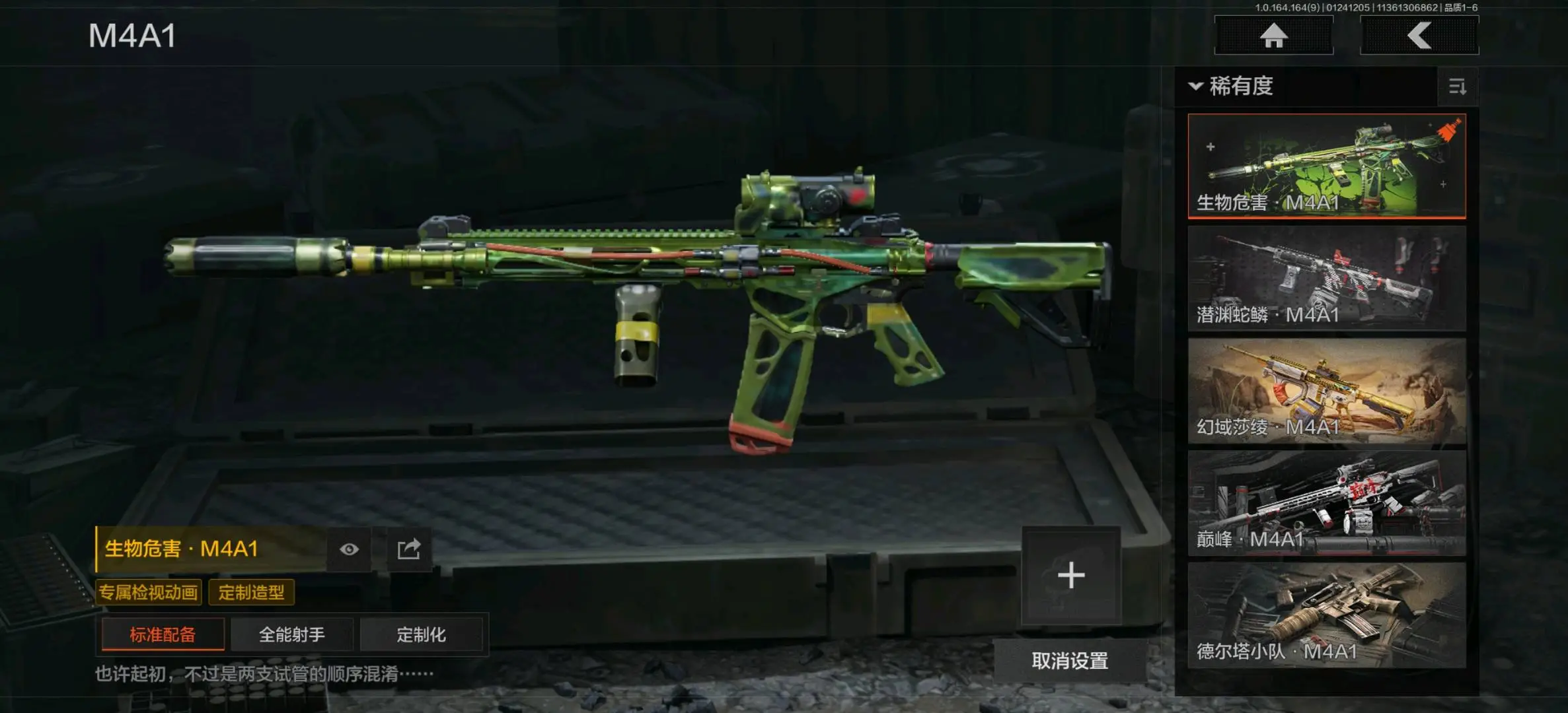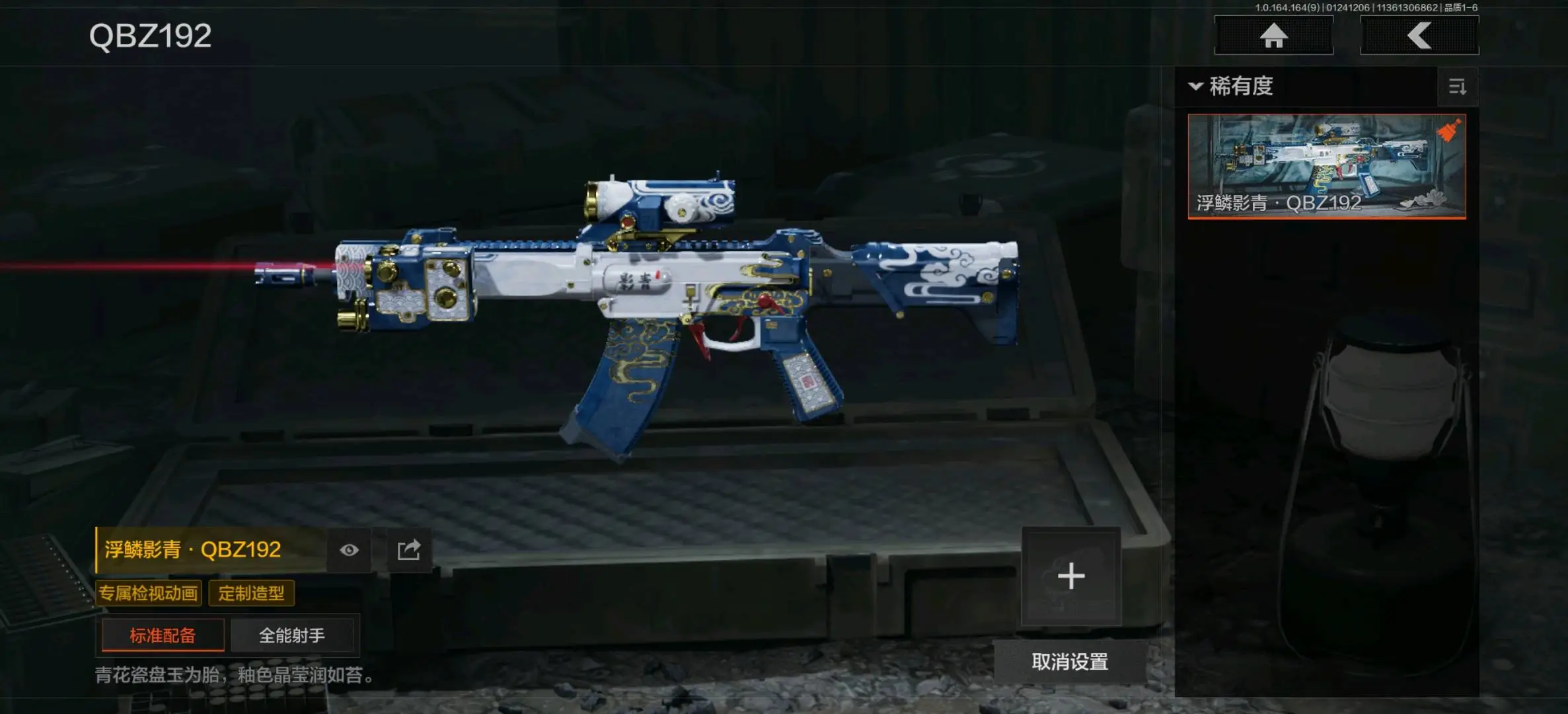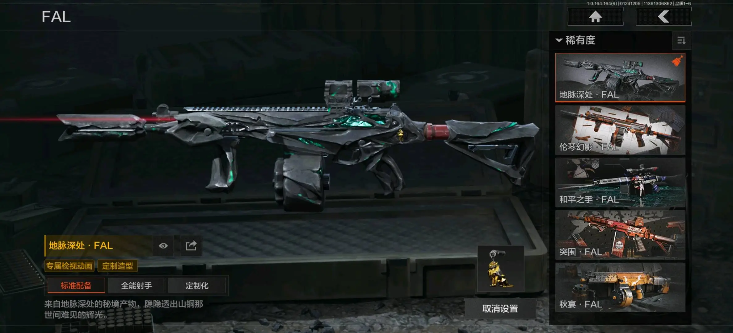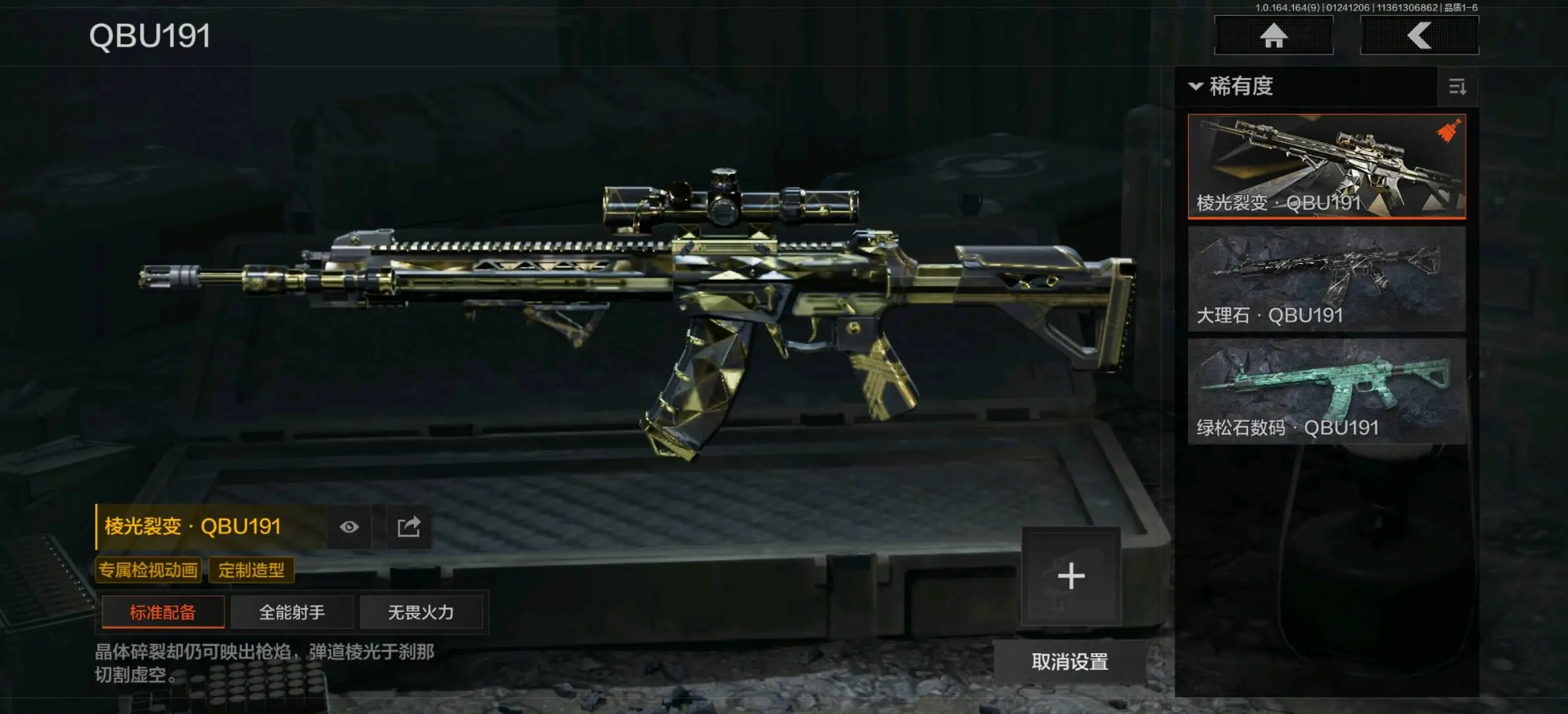 包络战术AKM,生物危害M4A1,地脉深处FAL,伦琴幻影FAL,告丧夜曲AR57,战术大师AEK,旗帜AEK,战术大师AN94,旧王圣谕QBZ191,浮鳞影青QBZ192,骑士之剑AKM,来战AKM,潜渊蛇鳞M4A1,幻域莎绫M4A1,巅峰M4A1,德尔塔小队M4A1,和平之手FAL,突围FAL,自喷网格H416,鱼跃丹青DTMDR,竞技MDR,北国内卫MDR,逆火MDR,鱼跃丹青AK102,棱光裂变AK102,战术大师AK74N,棱光裂变AK74N,来战AK74N,山地伪装AK74N,骑士之剑AKS74U,火力倾泻AUG,雪山之王F2000,危崖敌影F2000,深潜F2000,炎夏浪花AR57,涂绘猎人AR57,无声暗月AR57,战术大师AR57,棱光裂变ACE31,骑士之剑ACE31,粉绒臻选AN94,伦琴计量AN94,北国内卫AN94,突变系谱Groza,宝石籽料FAMAS,伦琴计量SCAR,巡林客T951,伦琴计量T951,百锻寒芒T951,骑士之剑T03,利齿风暴T03,百锻寒芒T03,深潜T03,突变系谱AK12,骤羽尖啸AK12,迅影毒锋AK12,典礼武备MCX,07式林地迷彩QBZ191,宝石籽料AR15;