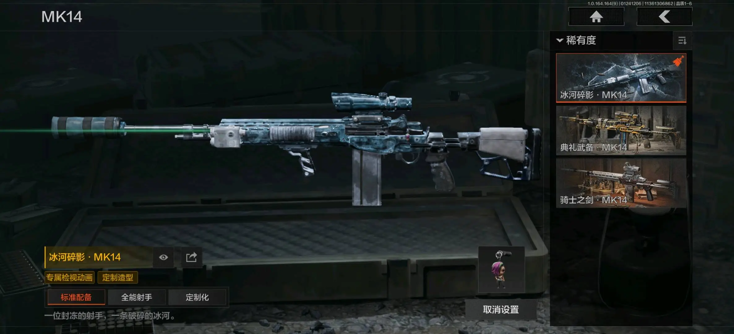 骑士之剑VSS,冰河碎影MK14,棱光裂变QBU191,战术大师SVDS,伦琴计量SVDS,高塔之内VSS,典礼武备MK14,骑士之剑MK14,缟兵玄墨M110,全地形数码M110;